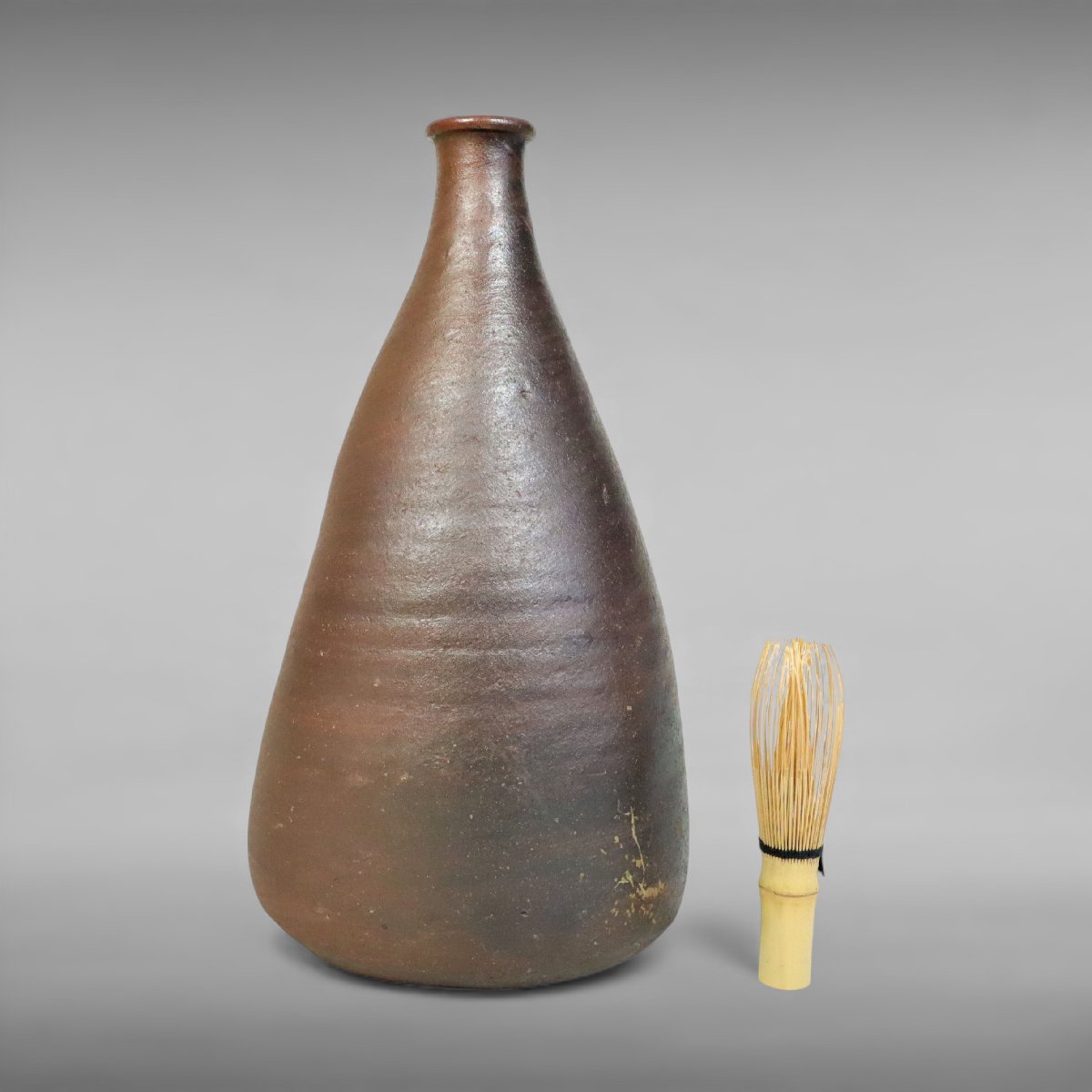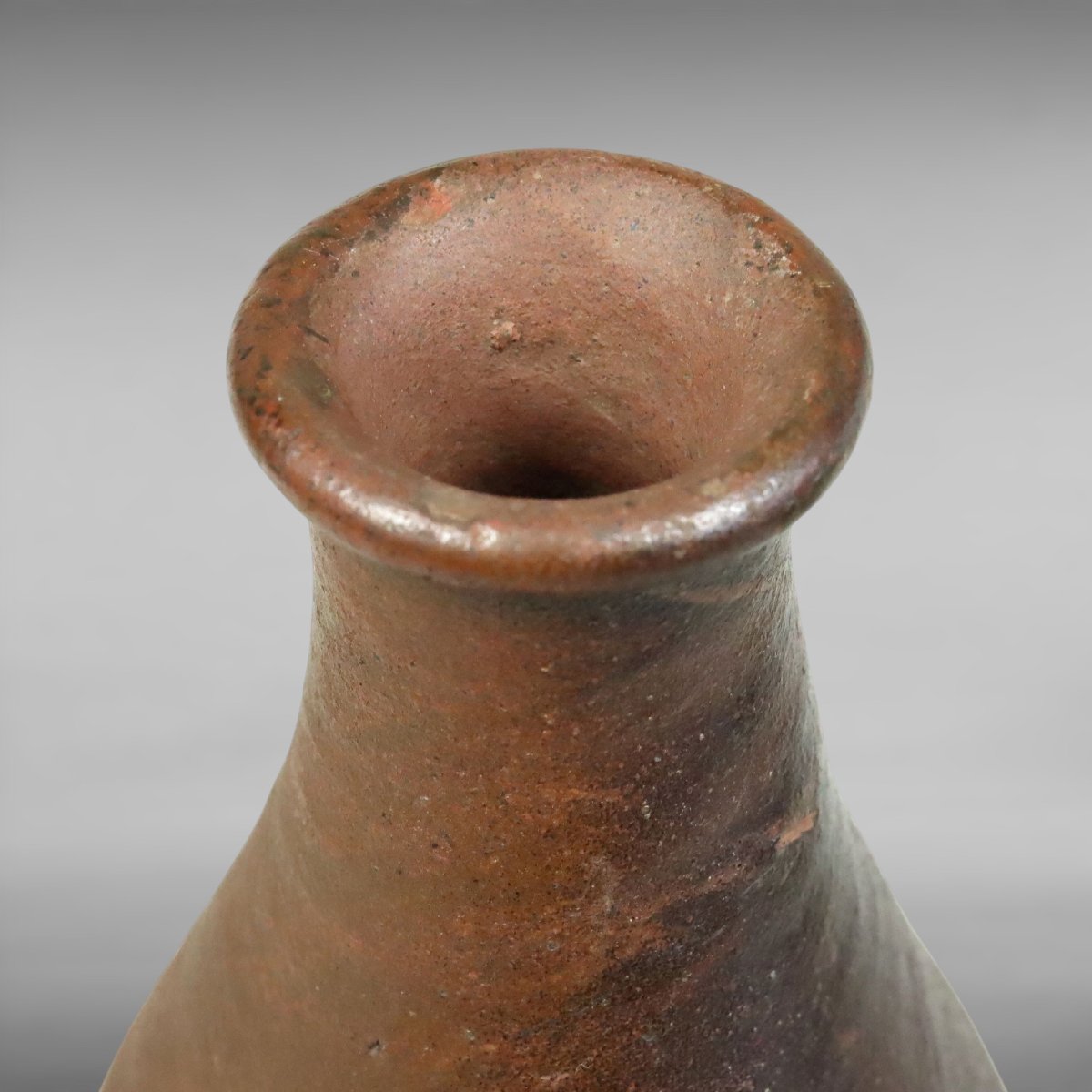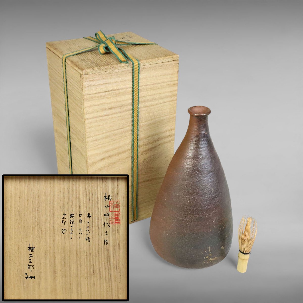 桃山期の古備前による舟徳利(尻張徳利)です。岡山県備前市伊部に連なる古備前特有の力強い土味と伸びやかな器形に加え、窯印を備えた見どころある古格の一作。桂又三郎識箱を伴う伝来確かな、酒器・花入として蒐集価値の高い優品です