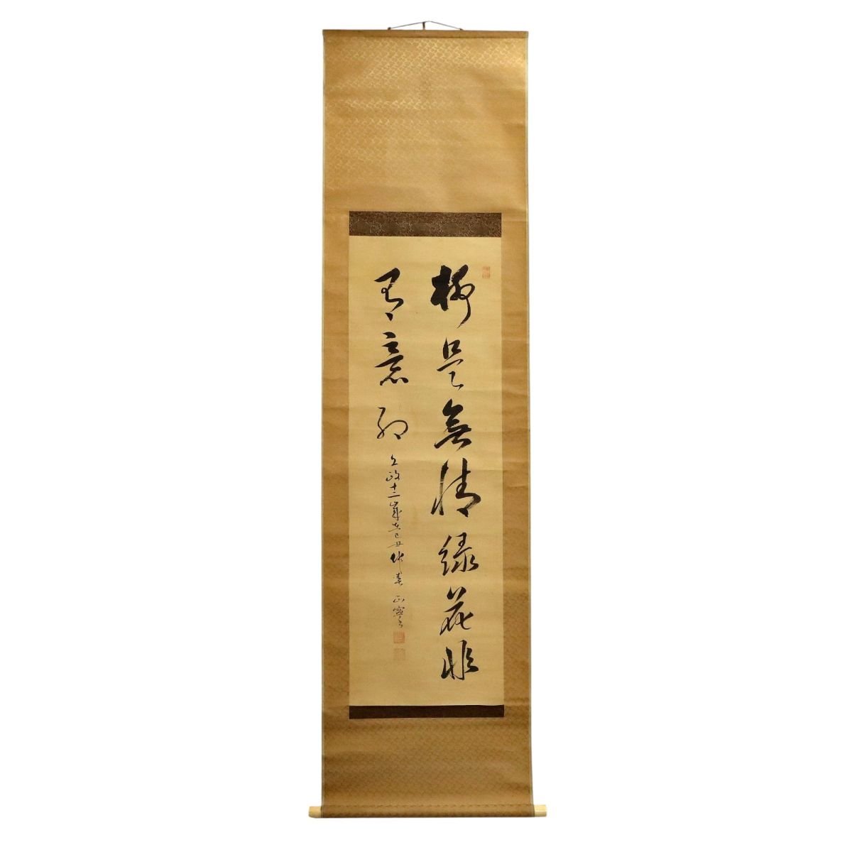 江戸後期の備後国福山藩第6代藩主・阿部正寧による書の掛軸です。藩政を担った大名自筆の気品ある筆致が印象的で、福山藩主家の教養と精神性を今に伝える歴史性豊かな一幅。絹本・箱付で保存性にも優れ、近世備後の藩政文化を知る資料としても蒐集価値の高い書画作品です。
