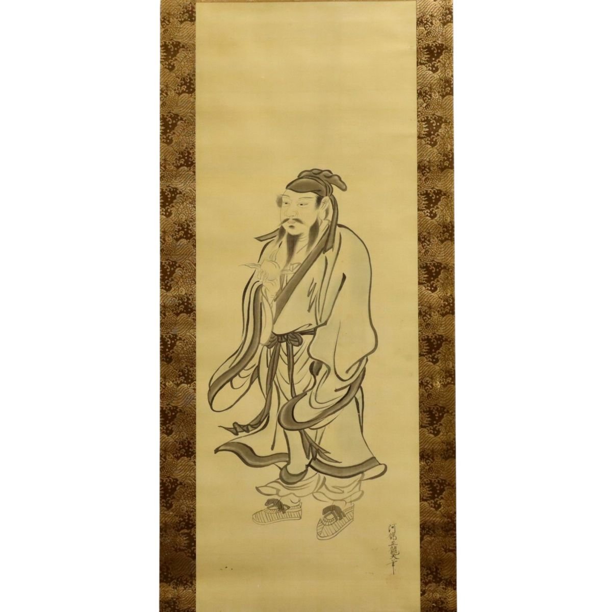 江戸中期、備後国福山藩第二代藩主・阿部正福による「仙人図」。飄逸な仙人を描いた筆致は伸びやかで、武家大名の教養と精神性を今に伝えます。絹本・箱付で伝来も明確。福山藩ゆかりの歴史的背景を備えた、鑑賞価値高い掛軸の逸品です。