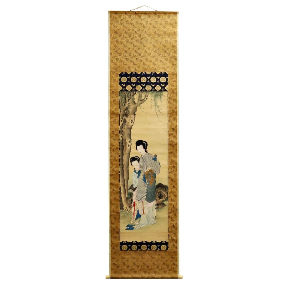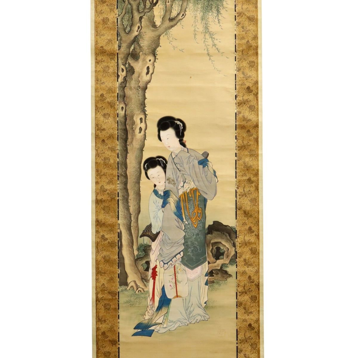 江戸後期、備後国福山藩第五代藩主・老中 阿部正精公ゆかりの「柳下美人図」。しなやかな柳と優美な美人を描き、武家文化の洗練と気品を伝えます。羽田桂舟識・絹本・識箱付で来歴も明確。福山藩の歴史を映す、格調高い書画掛軸の逸品です。