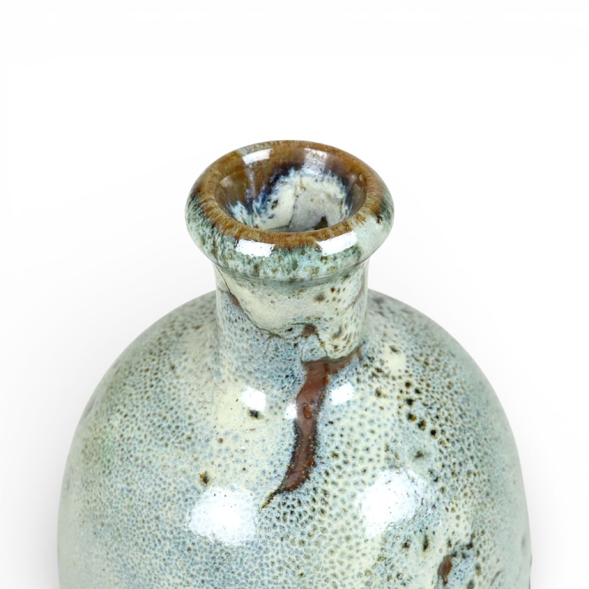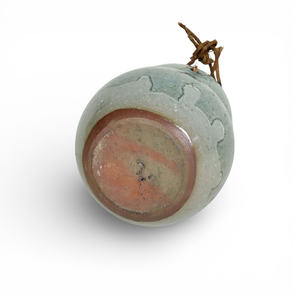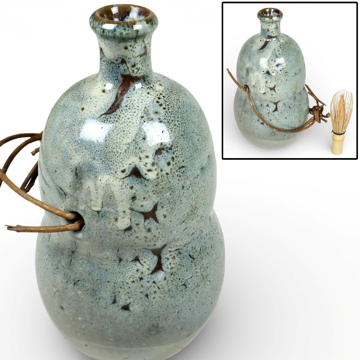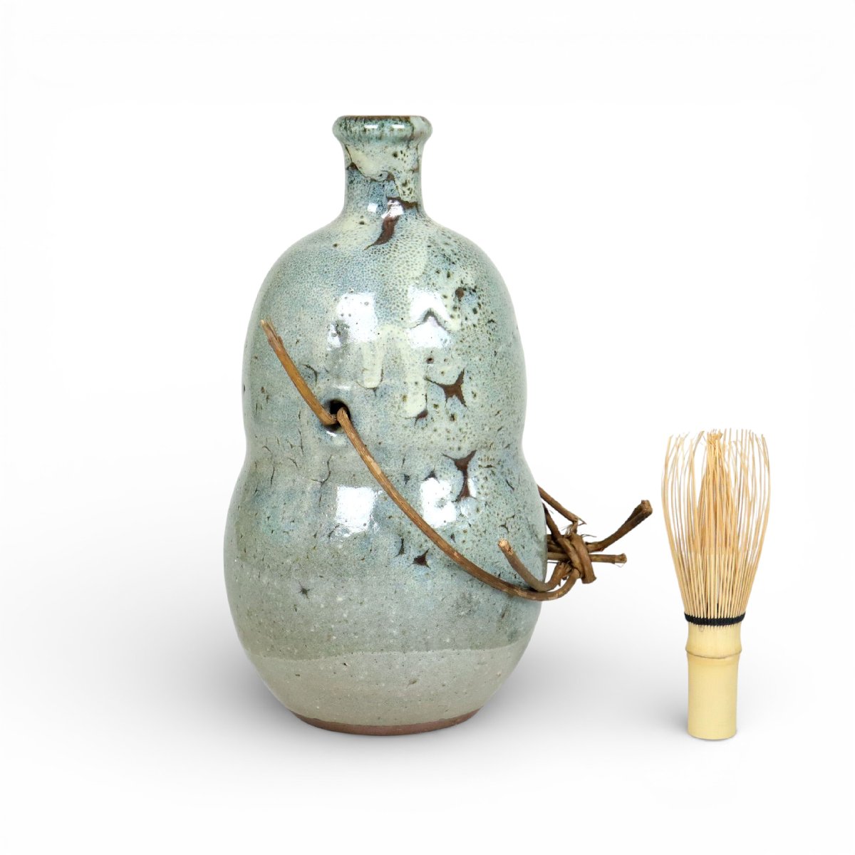 備後(広島県福山市・鞆の浦)ゆかりの幕末~明治期、鞆皿山焼系の保命酒徳利(鞆徳利)。蛇の目とかづら通しを備えた瓢型造形が特徴で、素朴な胎土と引き締まった釉調に地域民窯の力強さが表れています。鞆の浦の保命酒流通文化を伝える資料性も高く、骨董酒器として収蔵・鑑賞価値のある陶磁器です。