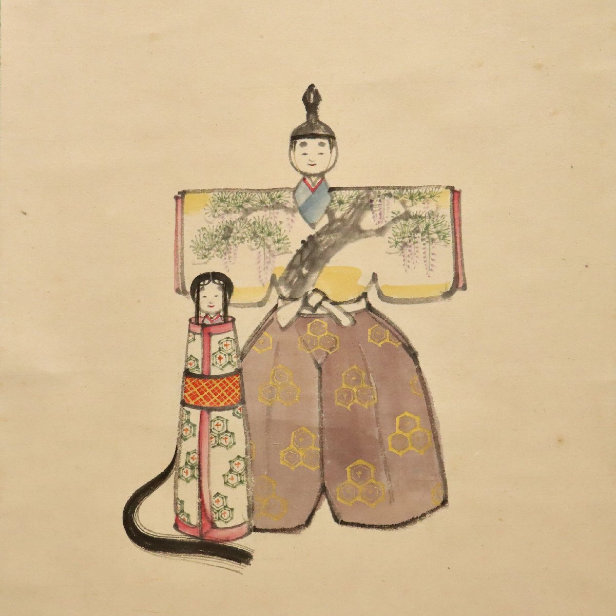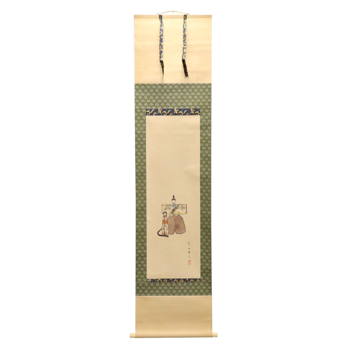 備後(広島県福山市周辺)ゆかりの松島一晃による雛図掛軸。紙本に優雅な雛人形を描き、春の気配と雅やかな情緒を伝える書画骨董品。合箱付で伝来性も良く、茶席や和室を彩る古美術掛軸として収蔵価値の高い逸品です。