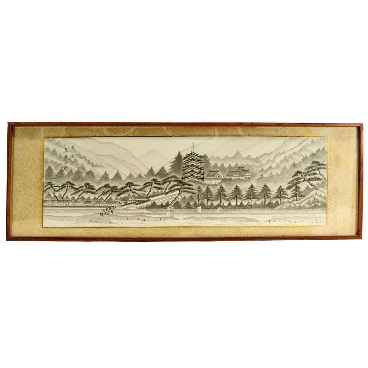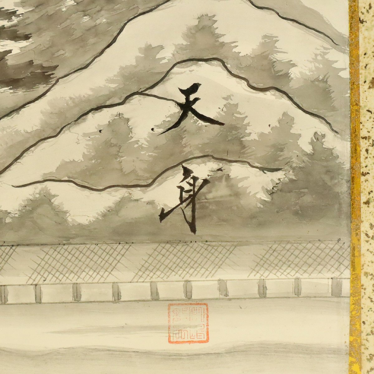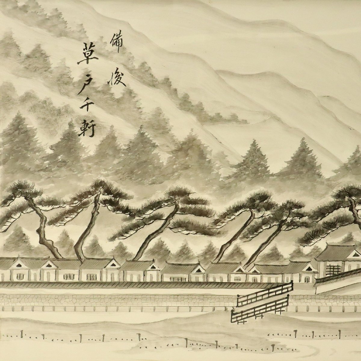 備後国・福山市の中世港町遺跡として知られる草戸千軒を題材に、天身在銘が入る趣深い水墨画作品です。約34×109.5cmの横長画面に往時の繁栄を偲ばせる景観が描かれ、郷土史資料としても価値ある発見性に富んだ備後書画の佳品です。
