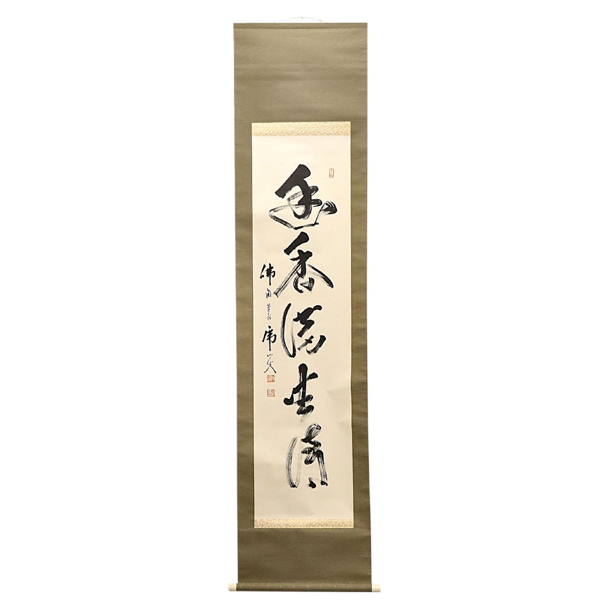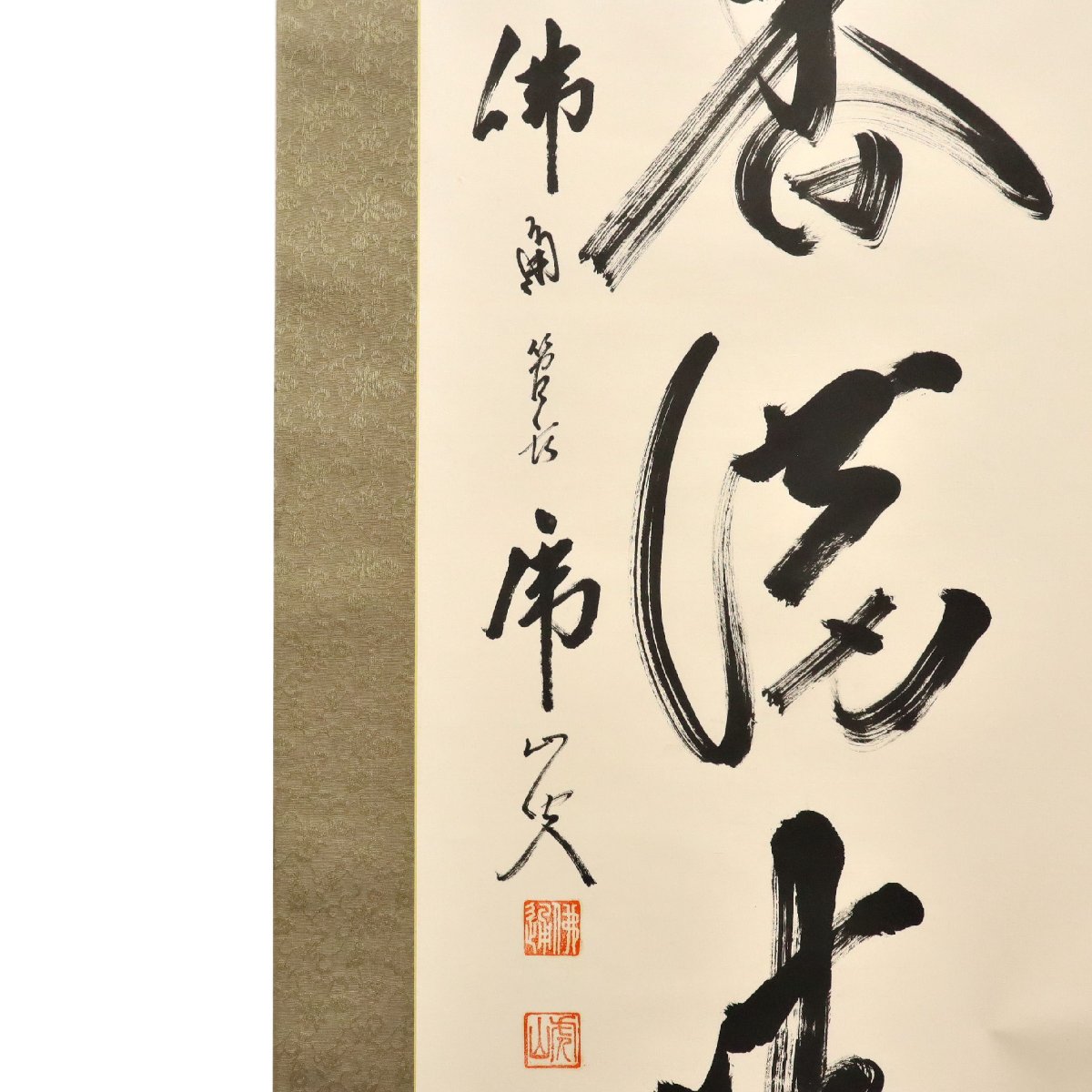 広島県三原市・佛通寺管長として知られる藤井虎山による紙本一行書掛軸。箱付の書画骨董で、禅僧ならではの澄明な筆致と気韻が宿り、無駄のない一行に深い精神性と禅の境地を表現した格調高い美術品です。禅林文化を伝える希少な一幅です。