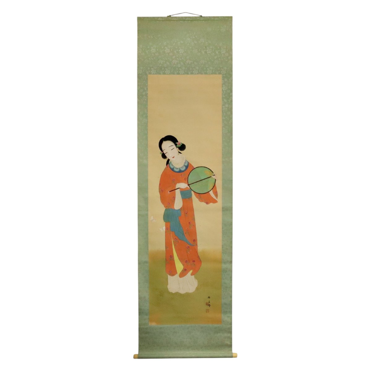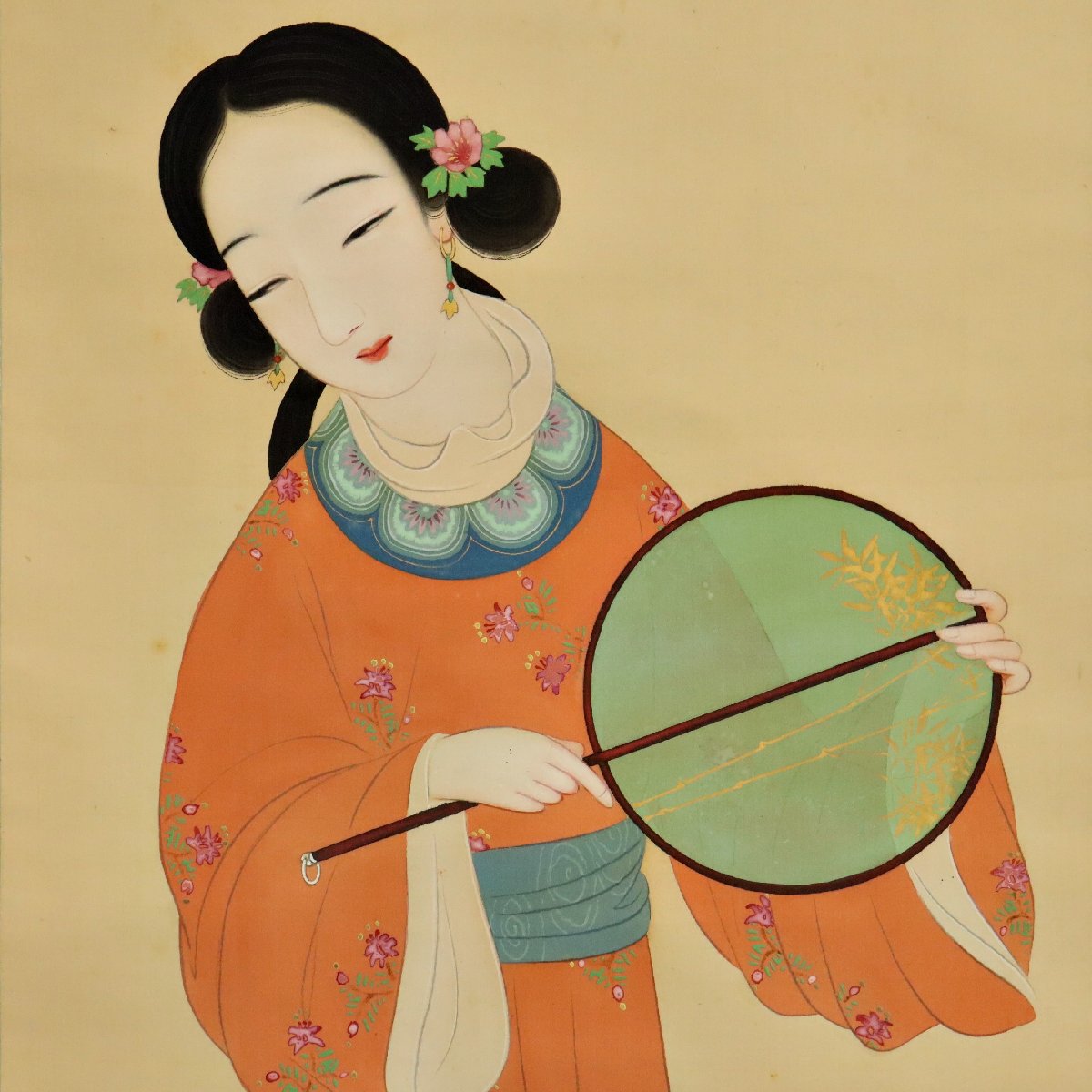 備後(広島県福山市周辺)ゆかりの作家による「楚蓮香図」美人図の絹本掛軸です。しなやかな筆致で描かれた優雅な人物表現と落ち着いた気品ある構図が魅力で、箱付により由緒も感じられる鑑賞性と蒐集価値を兼ね備えた一幅です