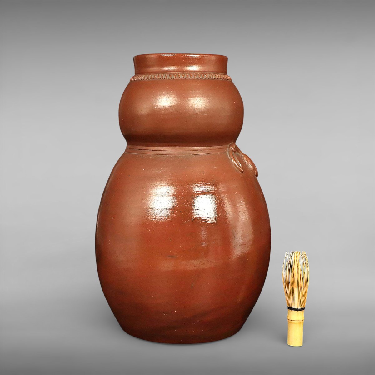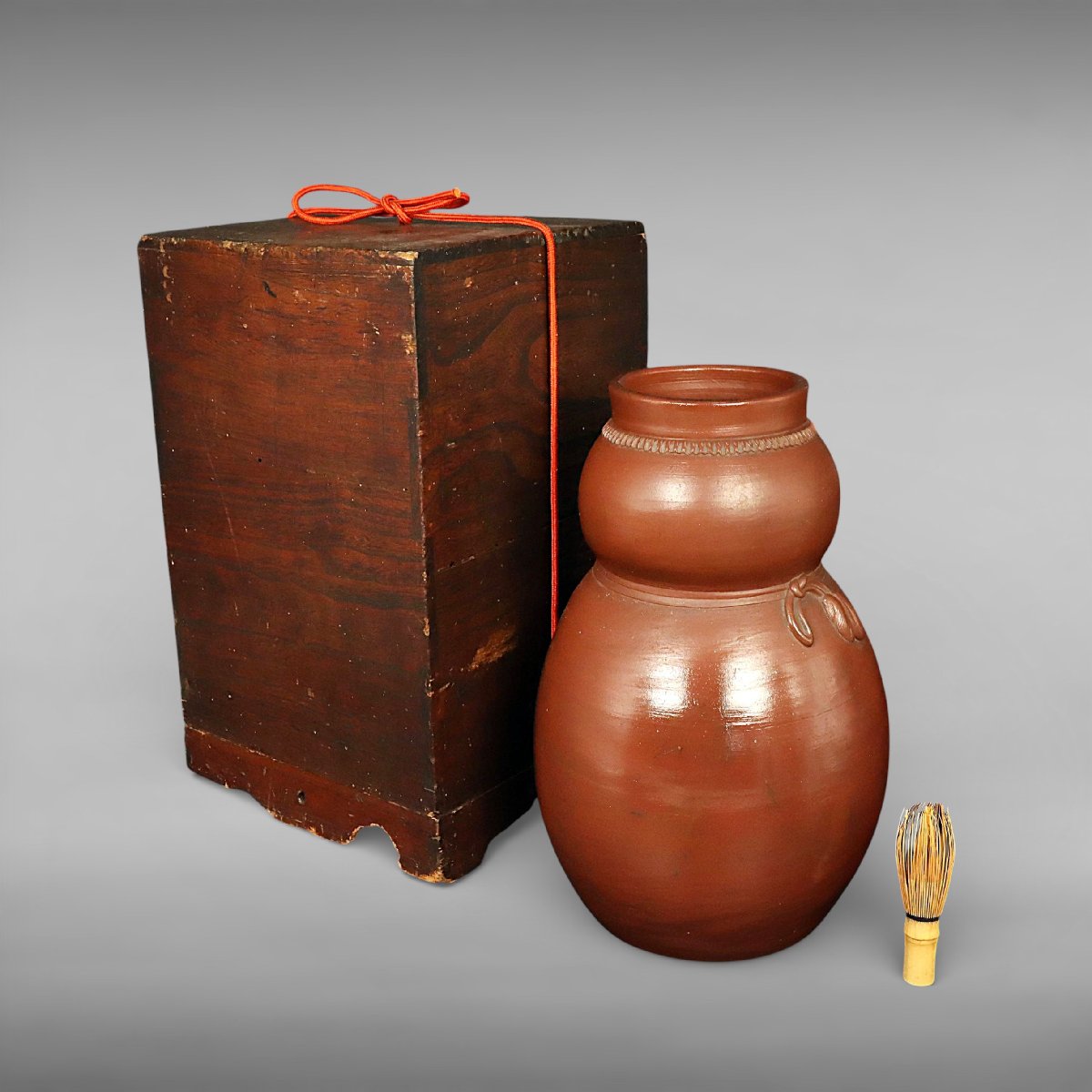 江戸期に焼成された古備前の瓢壷は、岡山県備前市周辺の窯による端正な瓢形と味わい深い焼締が魅力の古陶です。窯印と箱付により伝来の確かさも感じられ、花入としても映える華道具として評価の高い一品です。