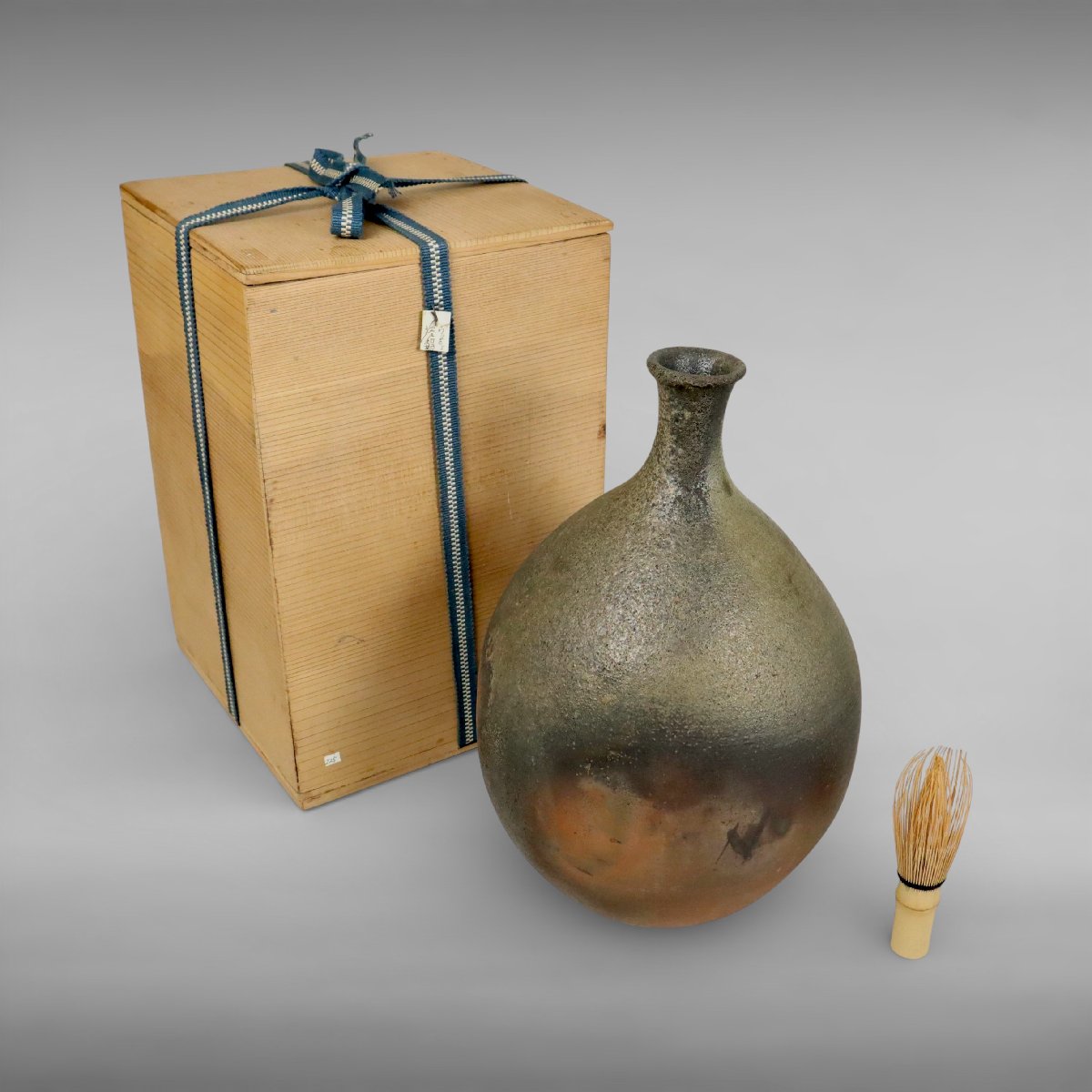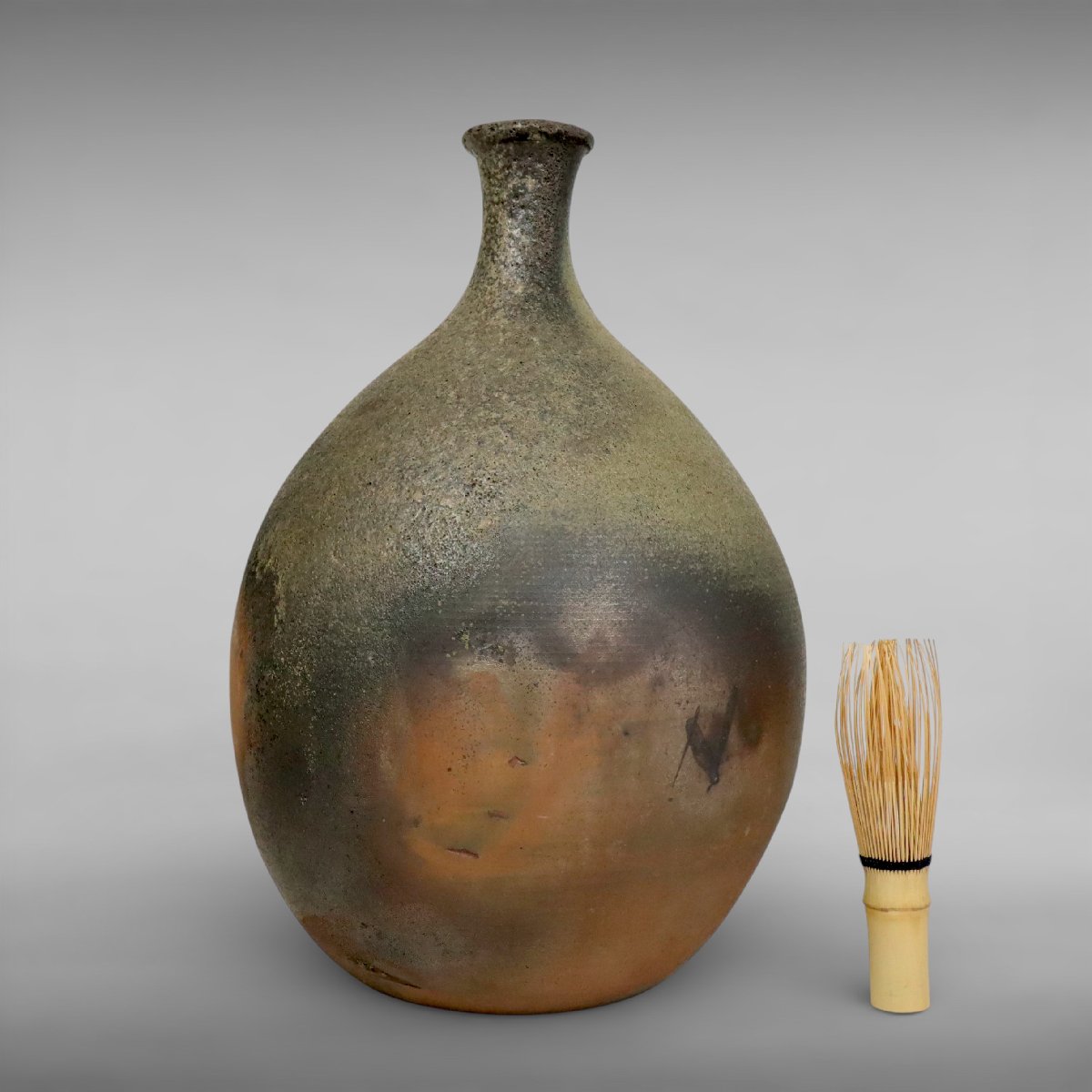 江戸期に焼成された古備前の徳利は、岡山県備前市周辺の窯による素朴で力強い焼締が魅力の酒器です。端正な造形と味わい深い景色が時代の趣を伝え、箱付で伝来も楽しめる花入としても好適な古備前の佳品です。