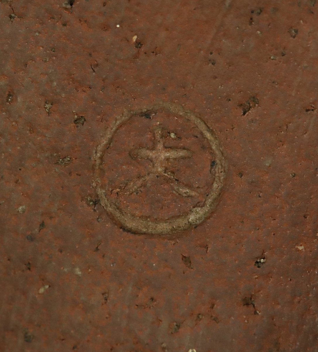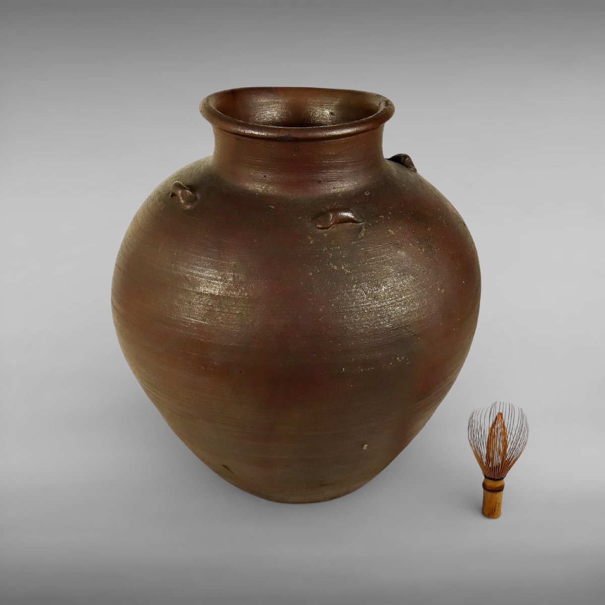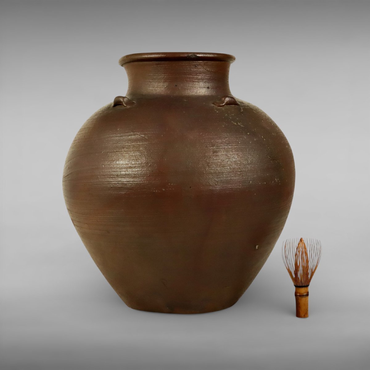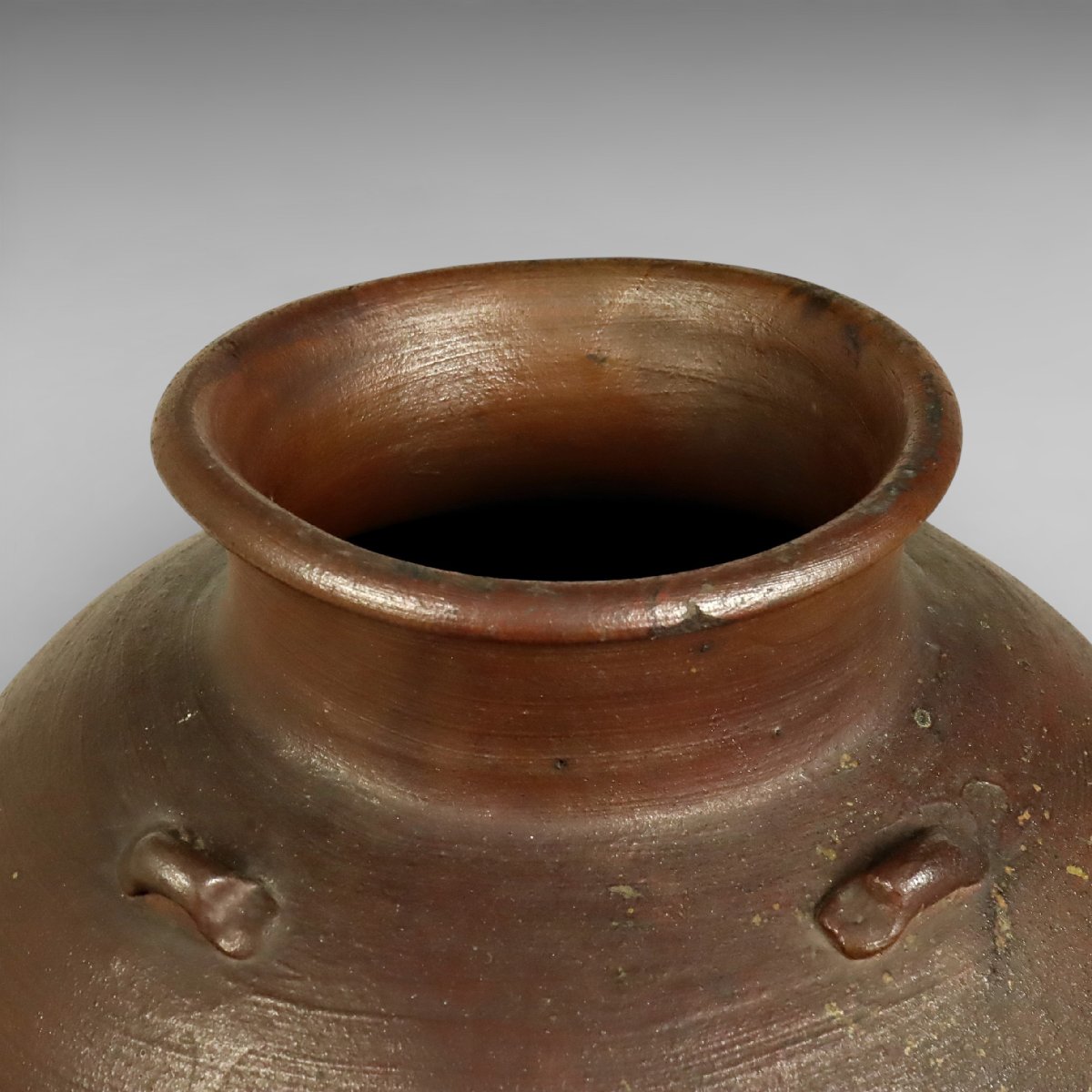 江戸中期の古備前による葉茶壷四耳壺です。岡山県備前市伊部に連なる古備前特有の力強い土味と自然釉の景色が見どころで、堂々とした器形に時代の風格が漂います。保存陶としての歴史も感じられる、鑑賞性と蒐集価値を兼ね備えた古備前の優品です。