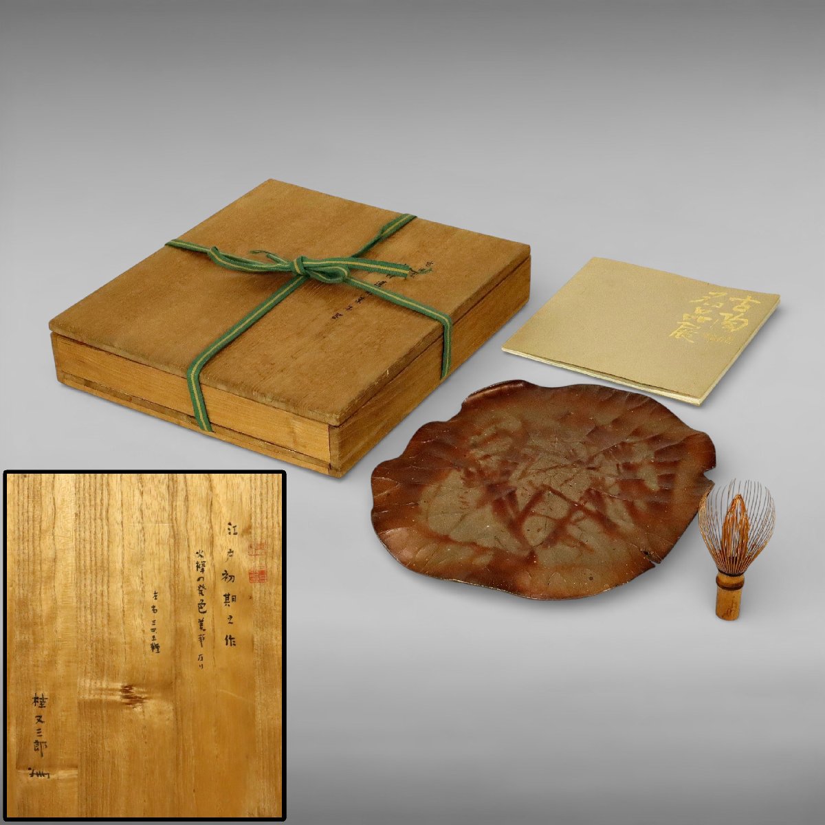江戸初期の古備前による火襷蓮形菓子器です。岡山県備前市伊部に連なる古備前ならではの素朴で力強い土味に、鮮やかな火襷景色が映える名品。【古陶名品展出展作】として知られ、桂又三郎識箱を伴う伝来確かな蒐集価値の高い逸品です。