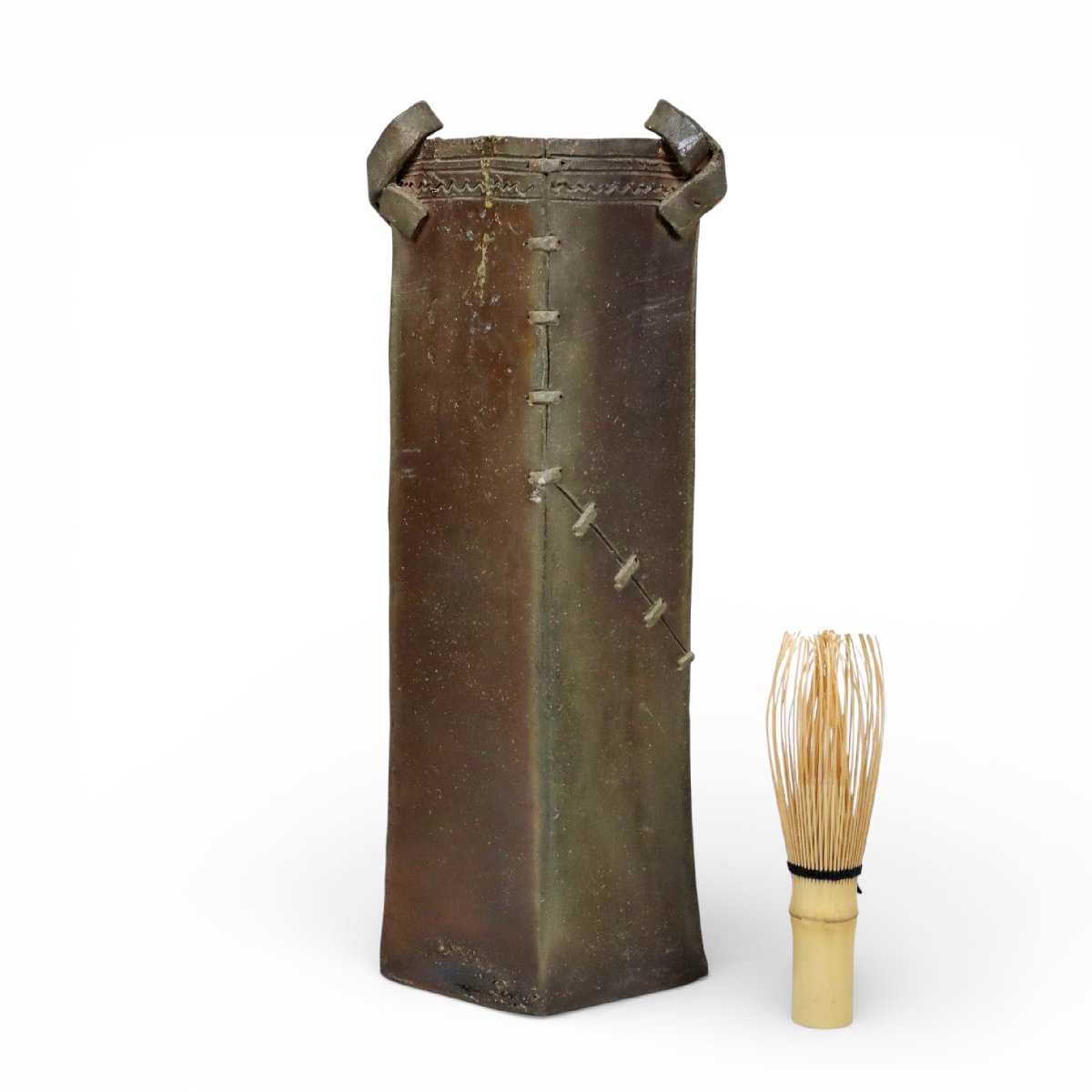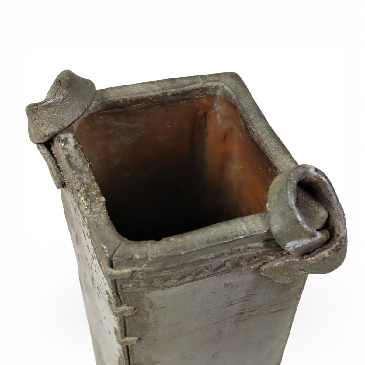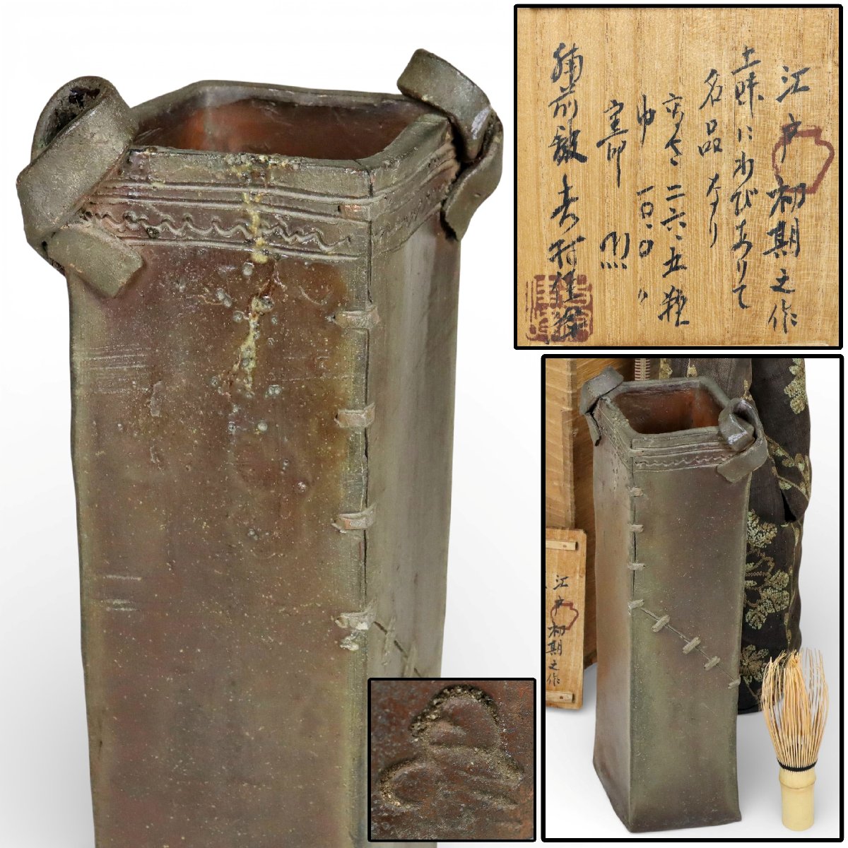 江戸初期に岡山県備前市周辺で焼成された古備前の四方花入です。端正な四方形の造形と無釉焼締の力強い土味が時代の風格を伝え、吉村佳峰書付・仕覆付の伝来も魅力。華道具としての格調と資料性を備えた発見性の高い古備前の優品です。
