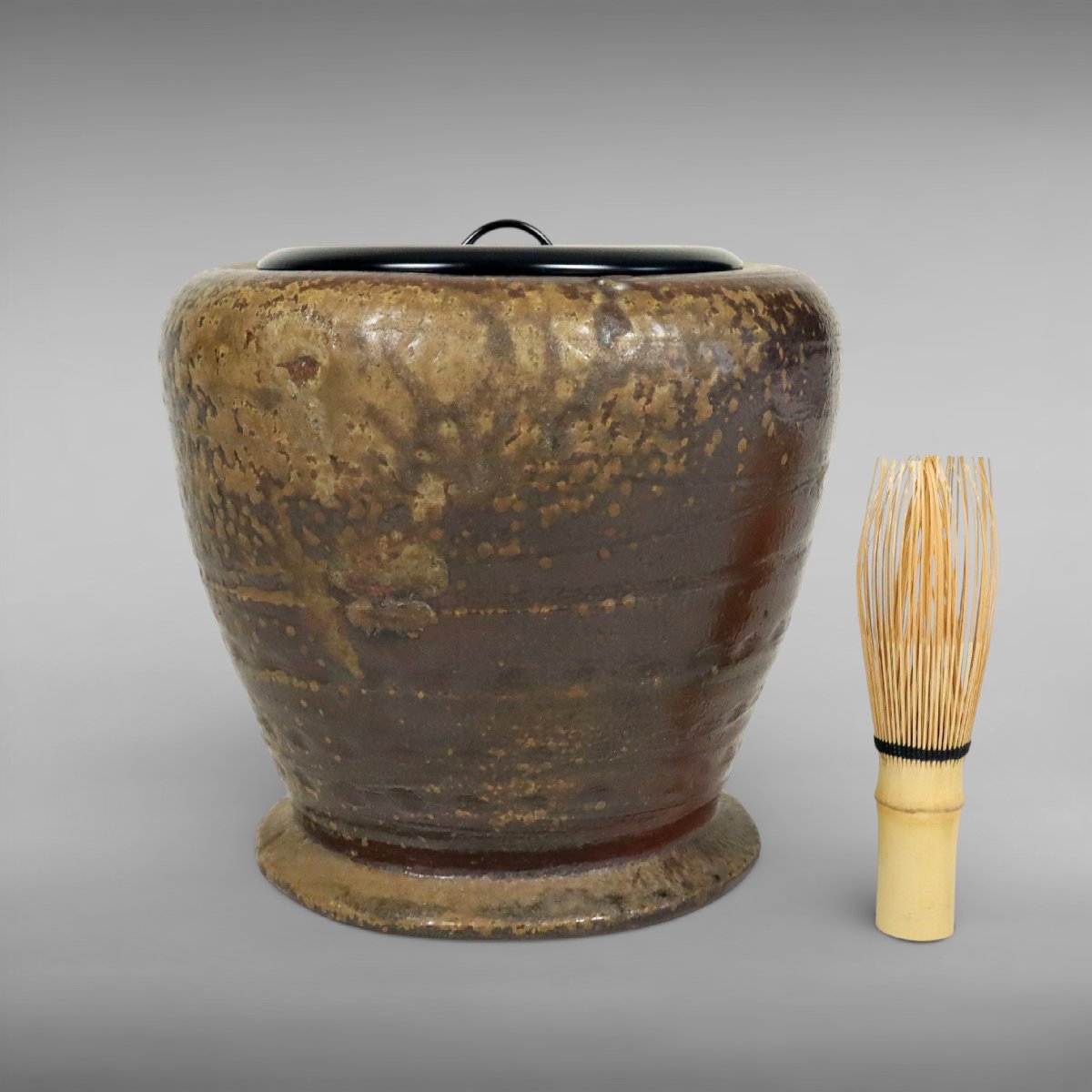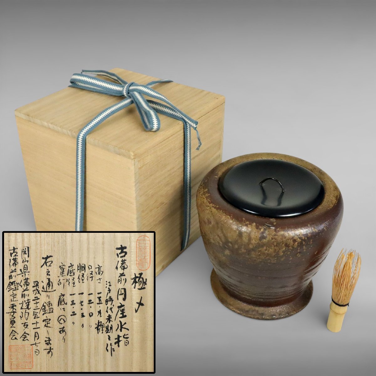 江戸末期に焼成された古備前の円座水指は、岡山県備前市周辺の窯による安定感ある端正な造形が魅力の茶道具です。古備前鑑定委員会の識箱付で伝来も確か、焼締の景色が趣深い煎茶道具としても評価の高い古備前の佳品です。