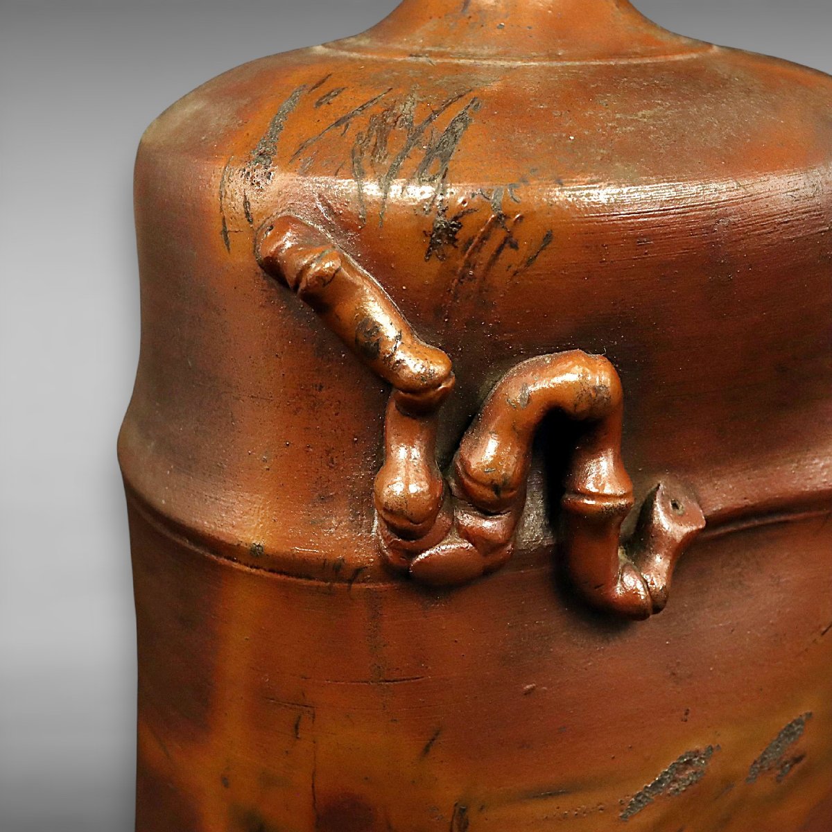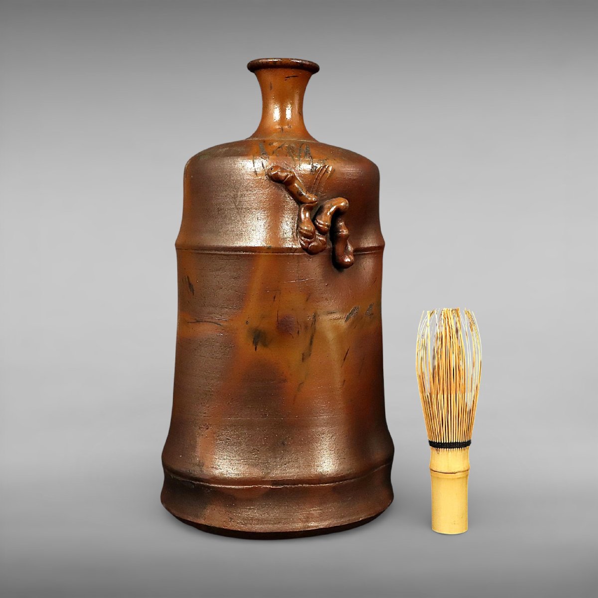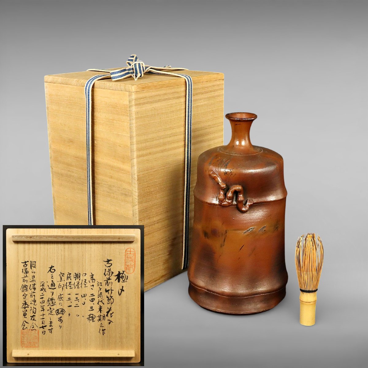 江戸末期に岡山県備前市周辺の寺見窯で焼成された古備前竹節花入は、自然な竹節造形と力強い焼締が魅力の一品です。寺見窯印に加え古備前鑑定委員会の識箱付で伝来も確か、華道具として格調高い古備前の佳品です。