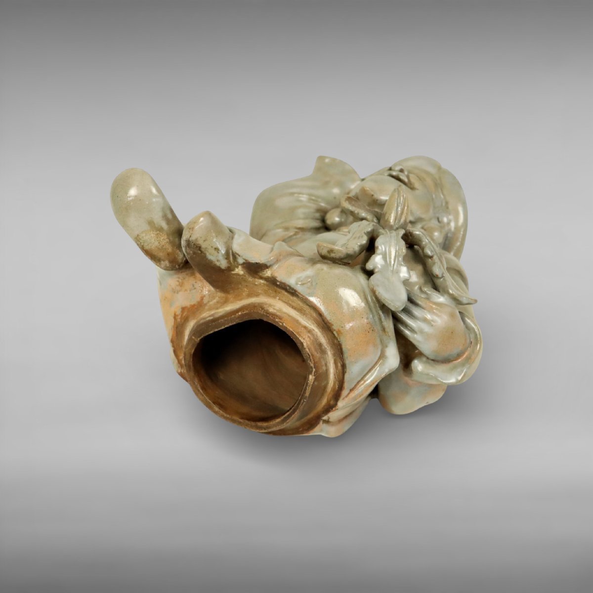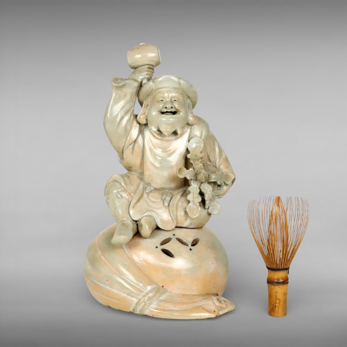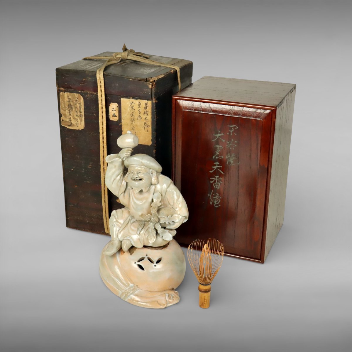 江戸中期の古備前、幻の白備前と伝わる閑谷焼系統による大黒天香炉です。岡山県備前市閑谷・閑谷学校に連なる由緒を伝え、柔和な白肌と福徳を象徴する意匠が魅力。二重箱付で伝来も確かな、香道具として蒐集価値の高い大名品です。