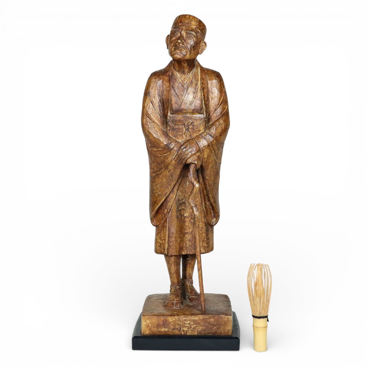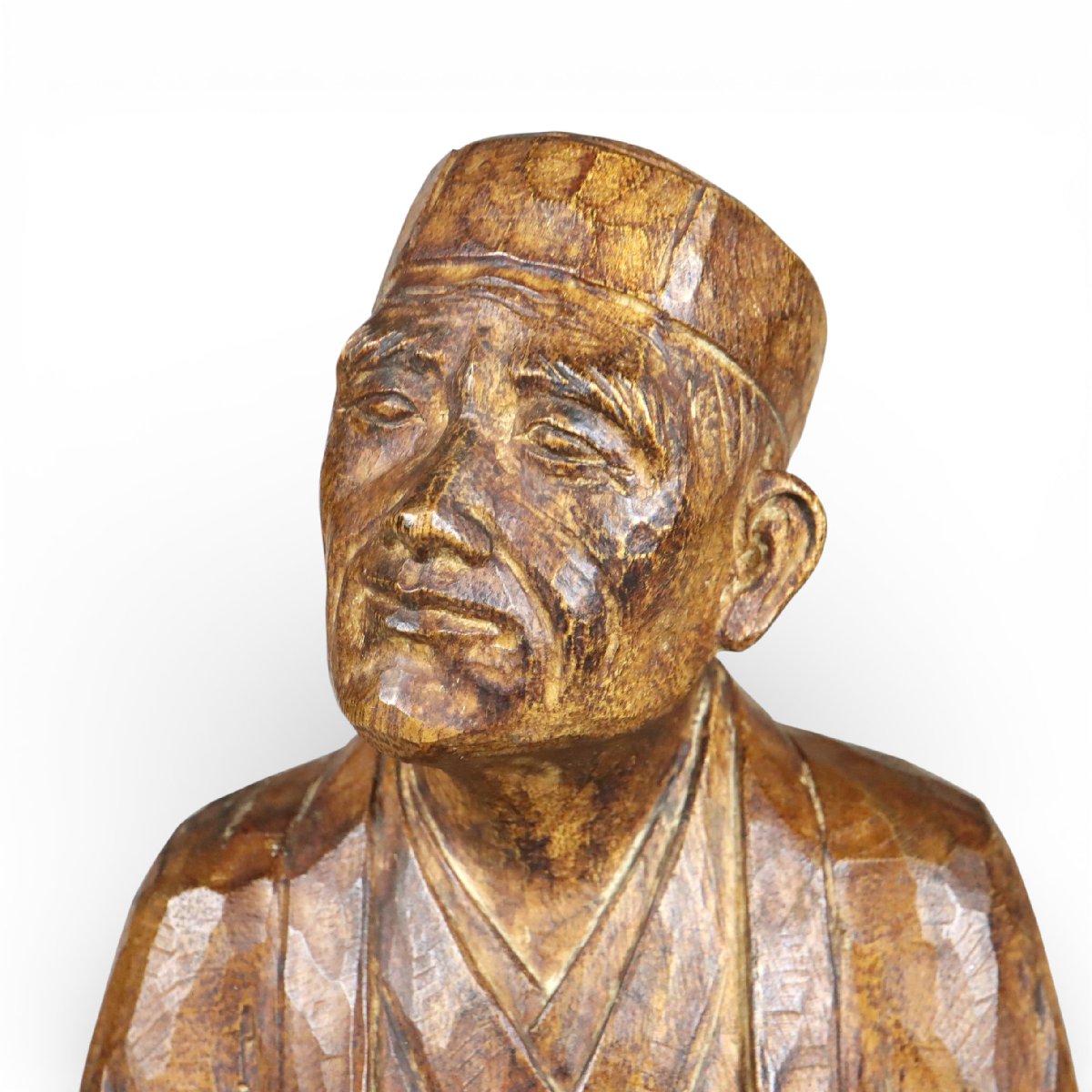 文化勲章受章・文化功労者で広島県名誉県民、圓鍔勝三による木彫の芭蕉像、共箱付きです。備後ゆかりの巨匠による本作は、芭蕉の静謐な佇まいを繊細な彫技で表現。日本彫刻界を代表する名品として、空間に格調と静謐な美をもたらす逸品です。