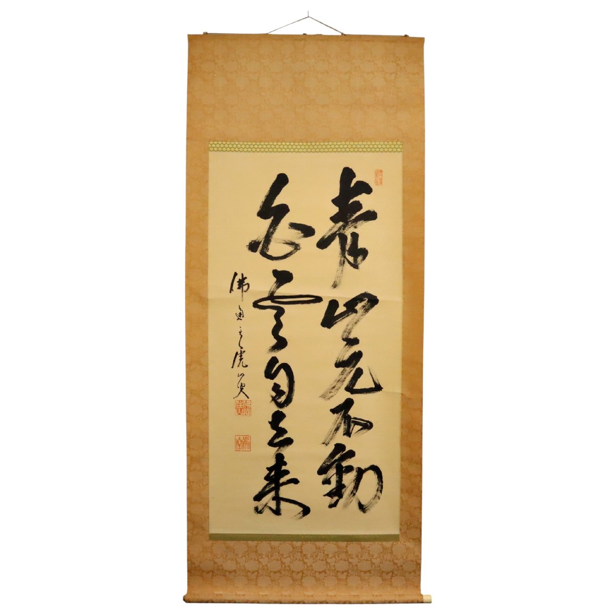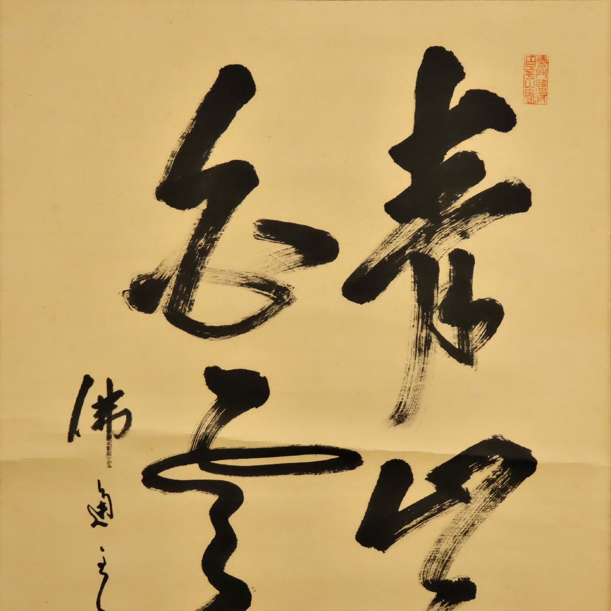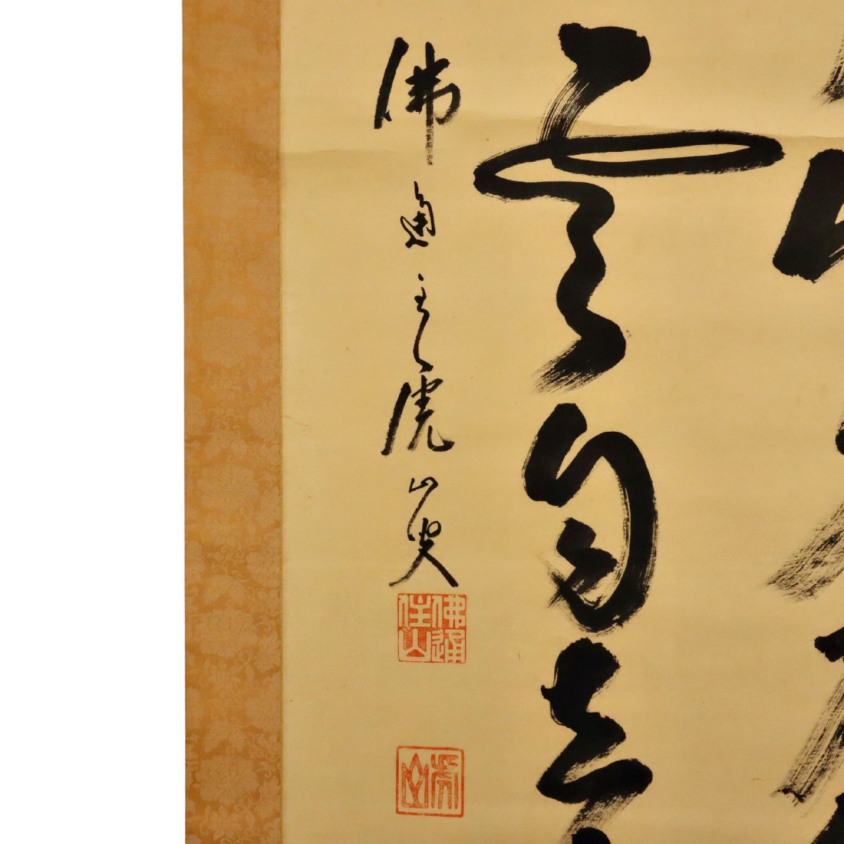 備後三原市の名刹・仏通寺の管長を務めた藤井虎山による書の掛軸です。禅僧らしい力強く清澄な筆致に精神性が表れ、紙本ならではの趣も魅力。備後ゆかりの禅書として鑑賞・蒐集に好適な一幅です。