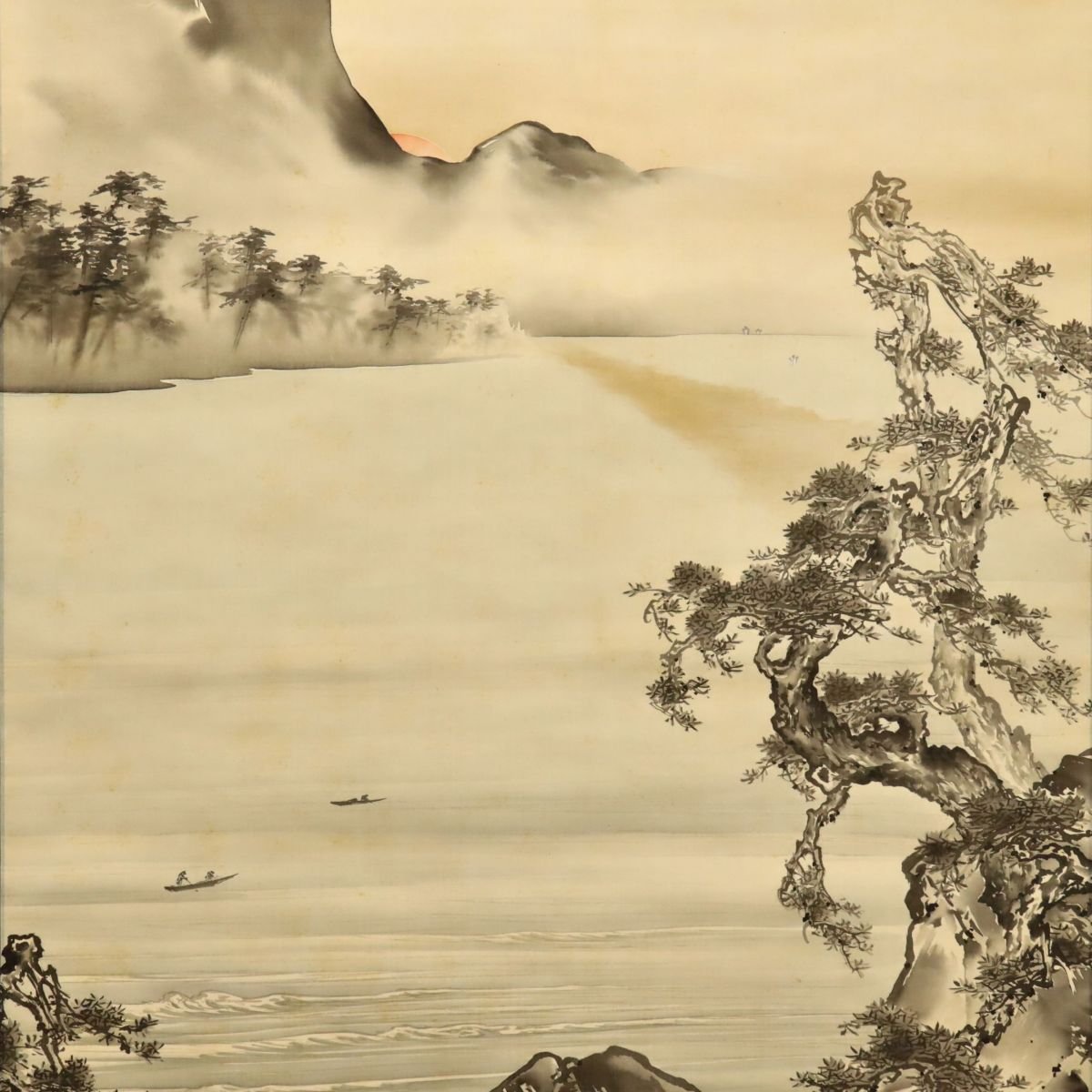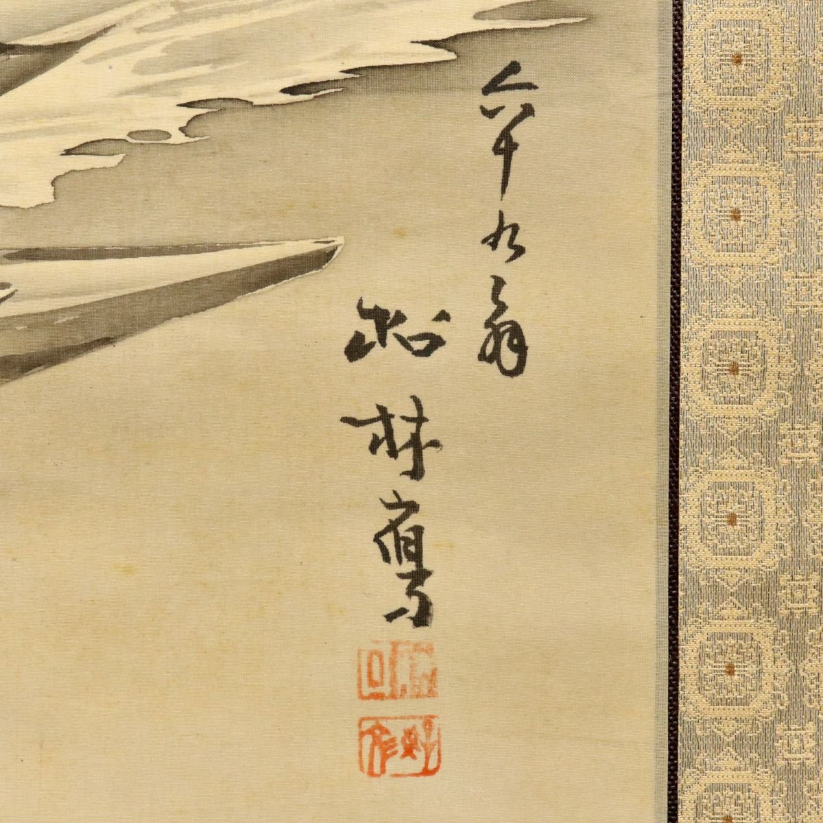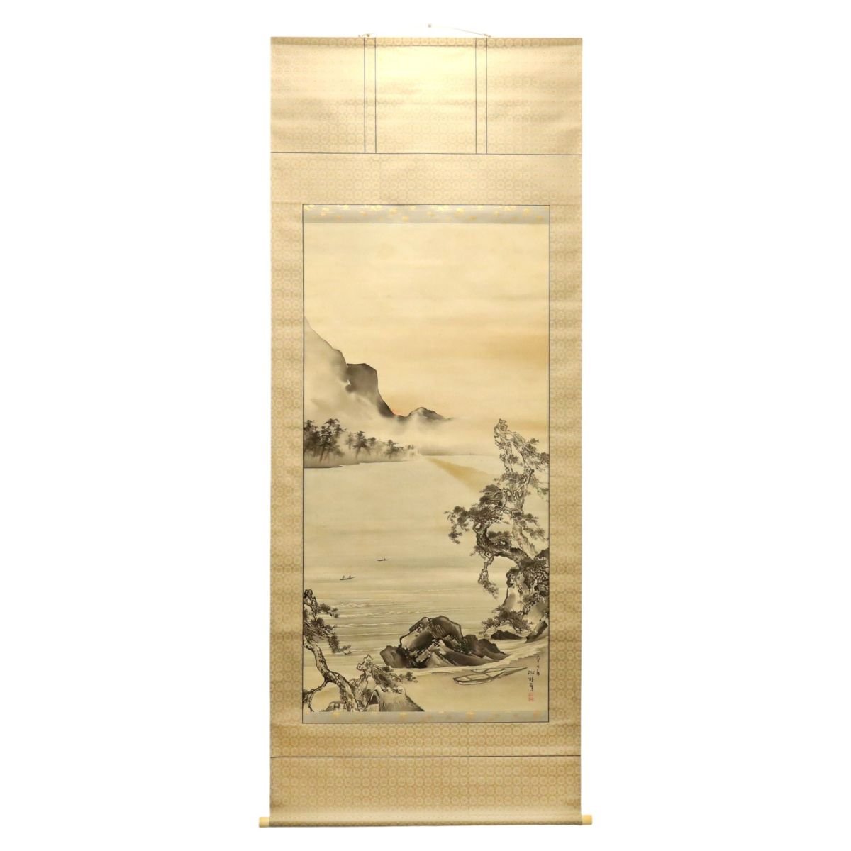 備後ゆかりの画家・藤井松林による風景図の絹本掛軸です。自然景観の情趣を落ち着いた筆致で描き出し、静謐な空気感と奥行ある構図が味わい深い一幅。松島一晃による識書を備えた識箱付で来歴も興味深く、郷土作家同士の関わりを伝える資料性と鑑賞性を兼ね備えた備後美術の骨董掛軸です。