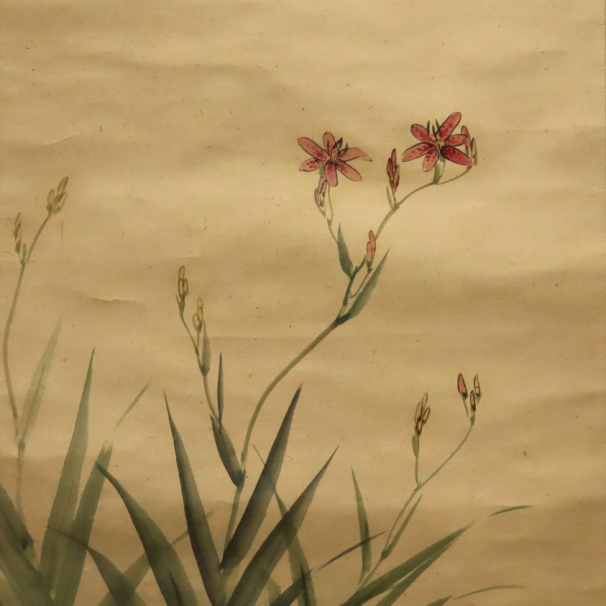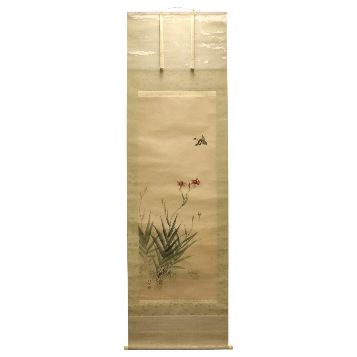 備後ゆかりの画家・藤井松林による花鳥図の掛軸です。紙本に描かれた柔らかな筆致と落ち着いた構図が花鳥の趣を引き立て、静かな気品を感じさせます。箱付で伝来の趣も備え、鑑賞・蒐集に好適な備後書画の一幅です。