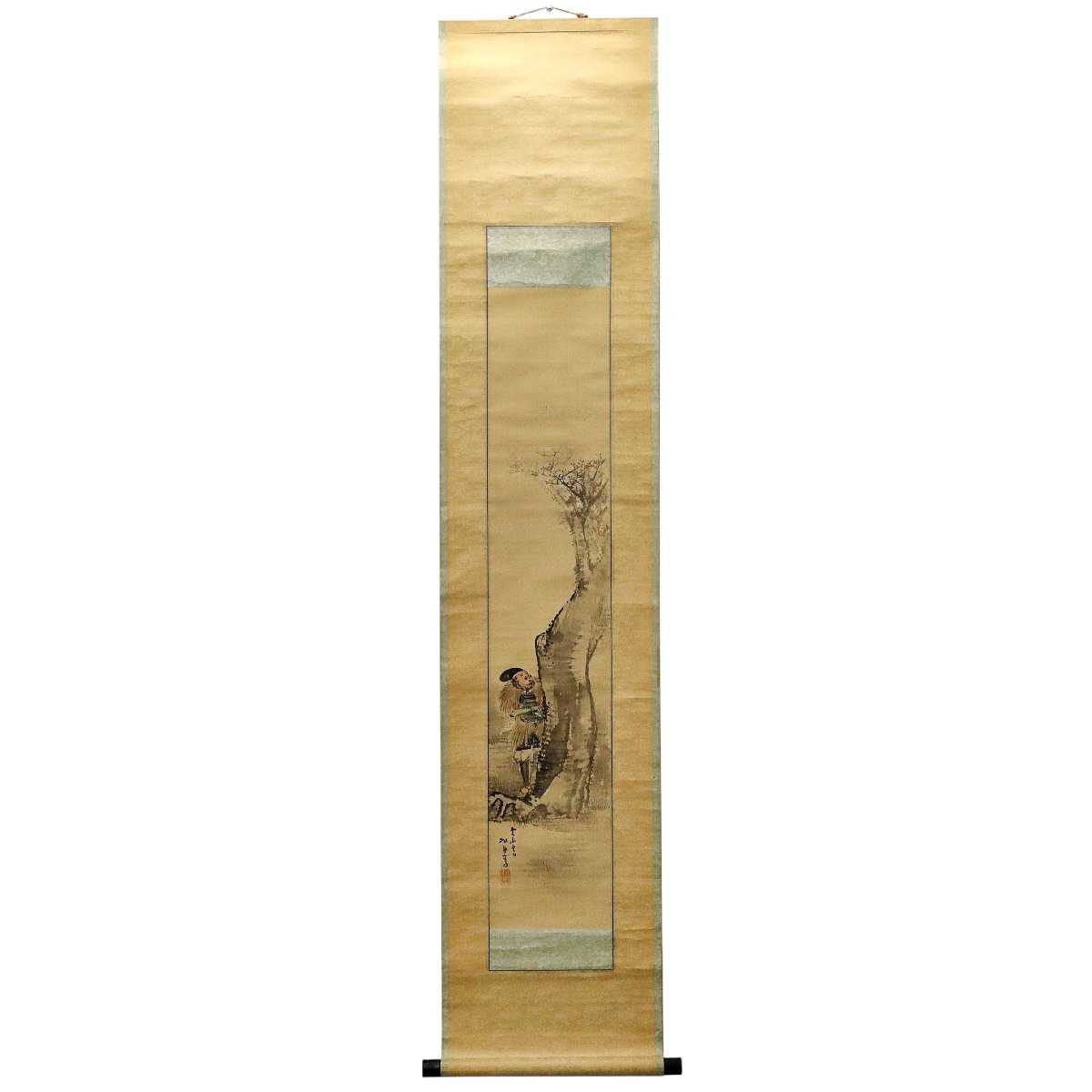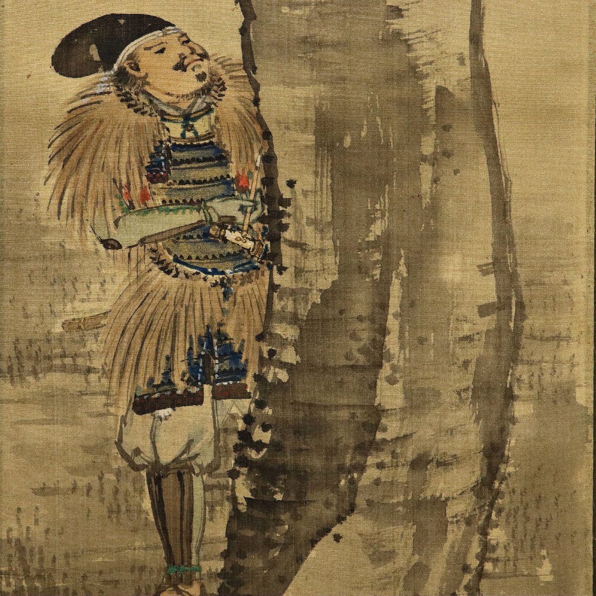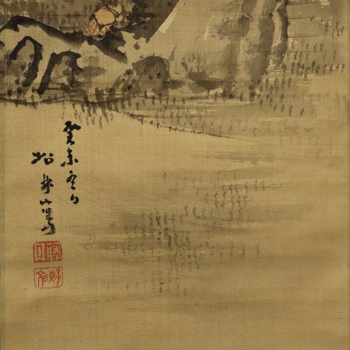 備後出身の書家・藤井松林による武者と桜図の掛軸です。勇壮な武者の姿と満開の桜を対比的に描き、武の気風と春の情趣を併せ持つ印象的な構図が魅力の一幅。絹本ならではの柔らかな発色も見どころで、近代備後文人画壇の人物表現を伝える蒐集価値ある書画作品です。
