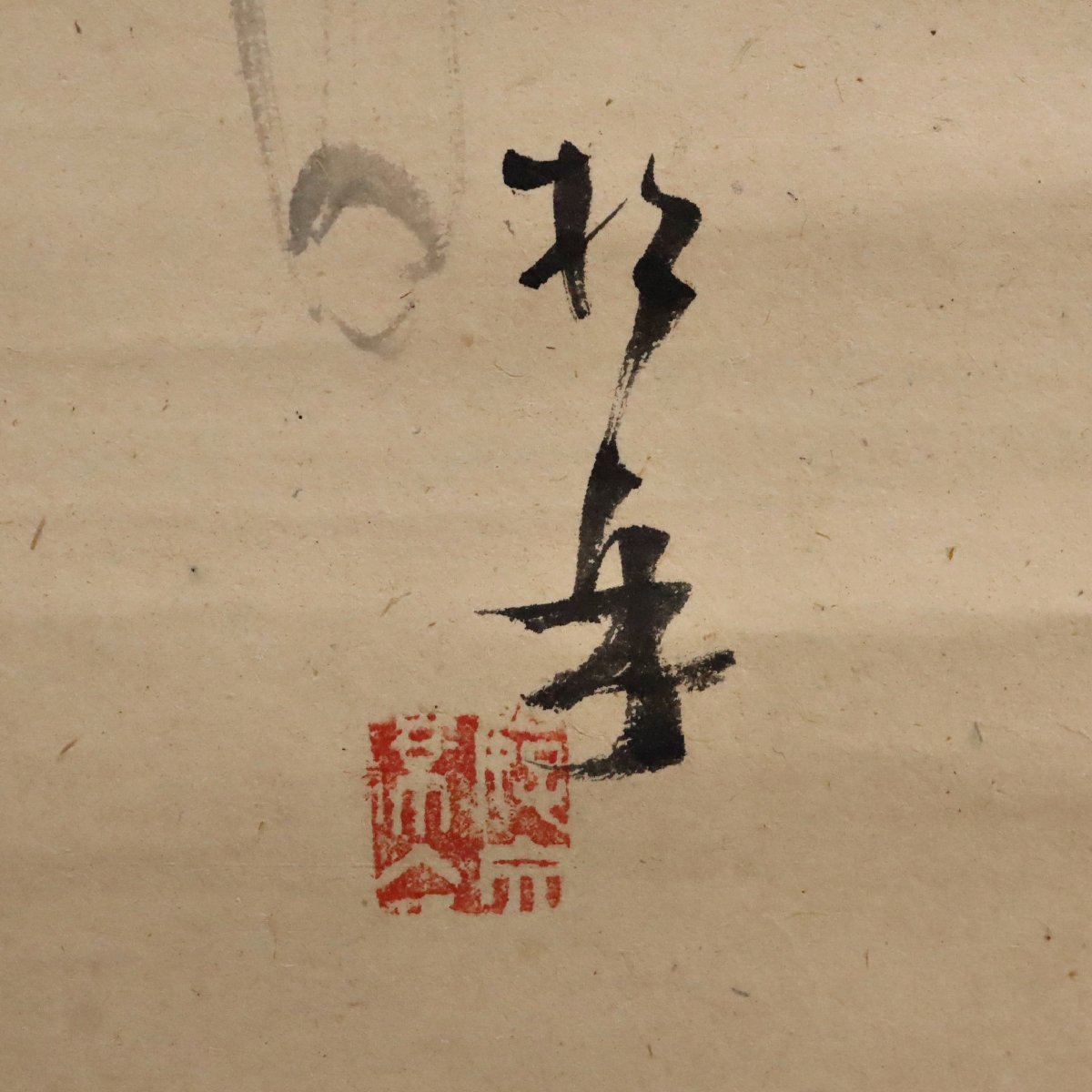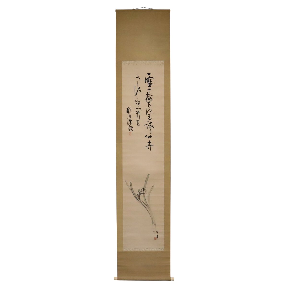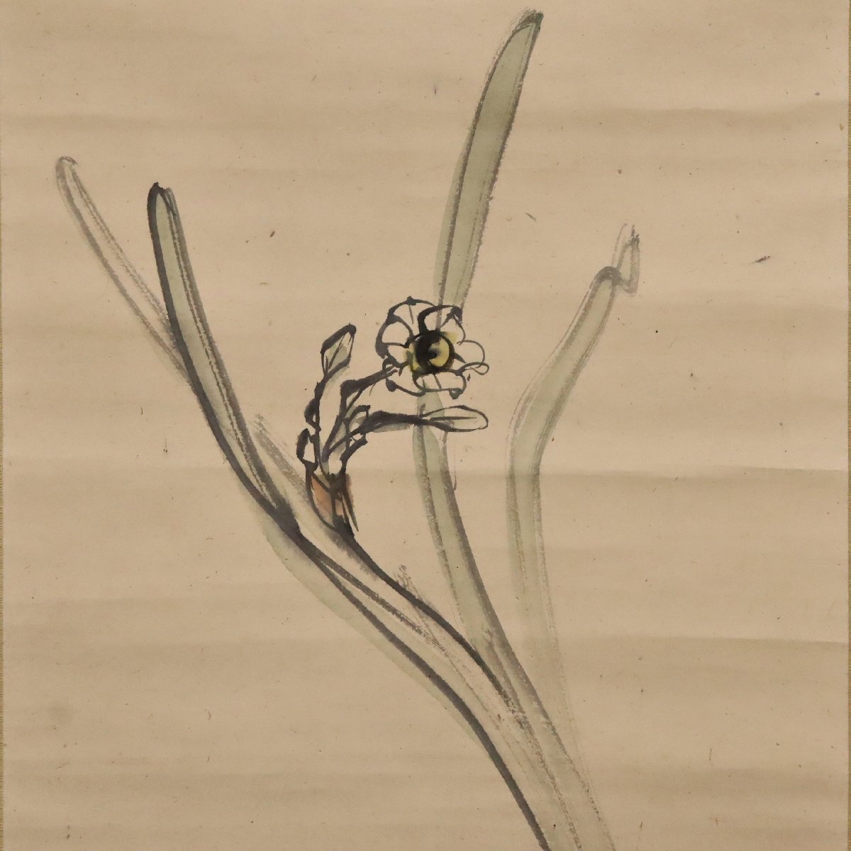 備後(広島県福山市周辺)ゆかりの藤井松林による水仙図の画賛掛軸です。凛とした水仙を簡潔にして気品ある筆致で描き、添えられた書が文人趣味の趣を深める味わい深い一幅。紙本・箱付で伝来も感じられる、鑑賞性と蒐集価値を兼ね備えた逸品です。