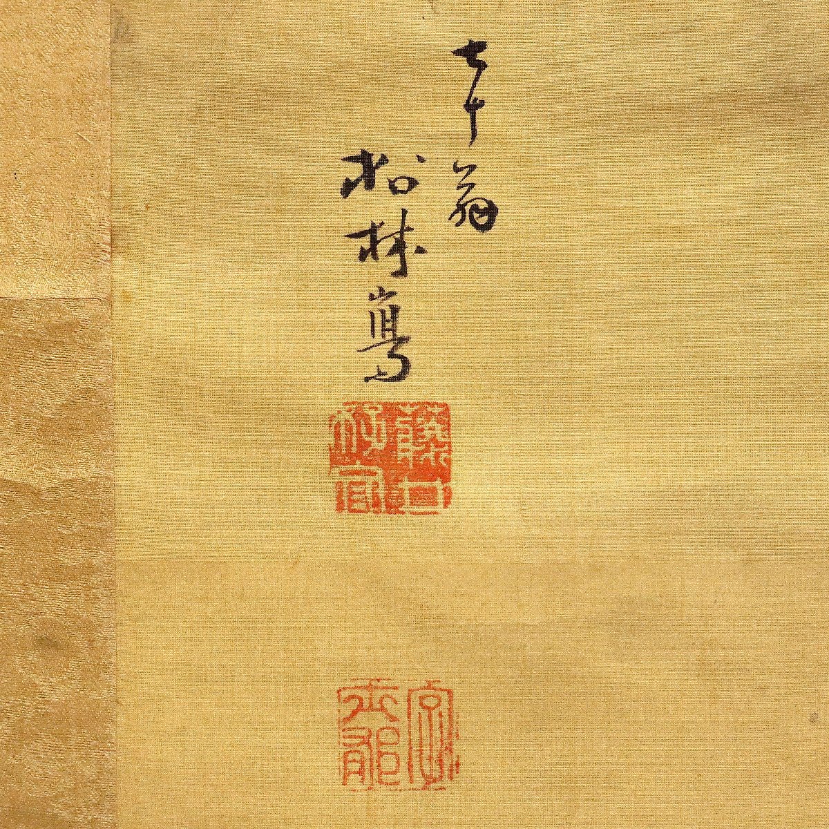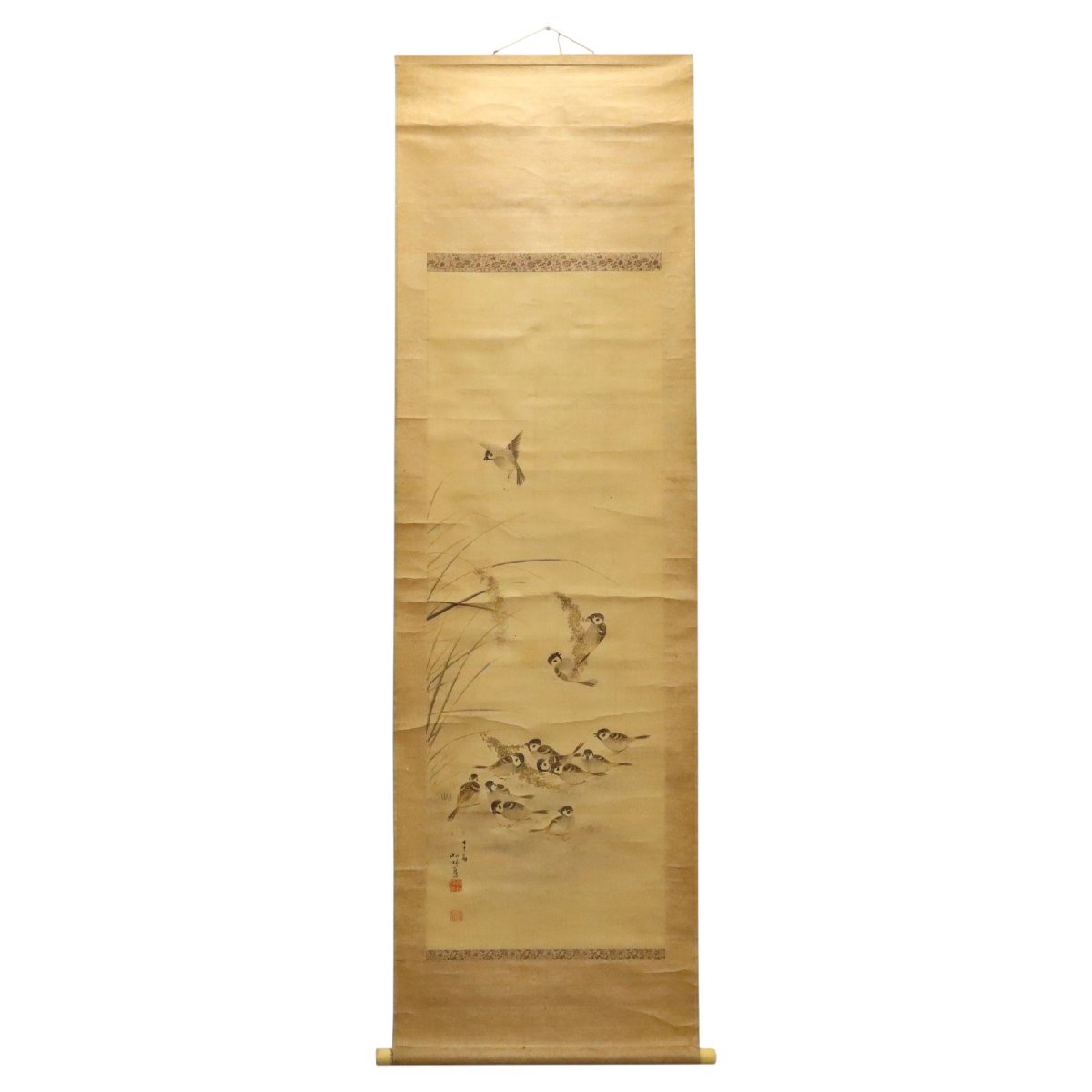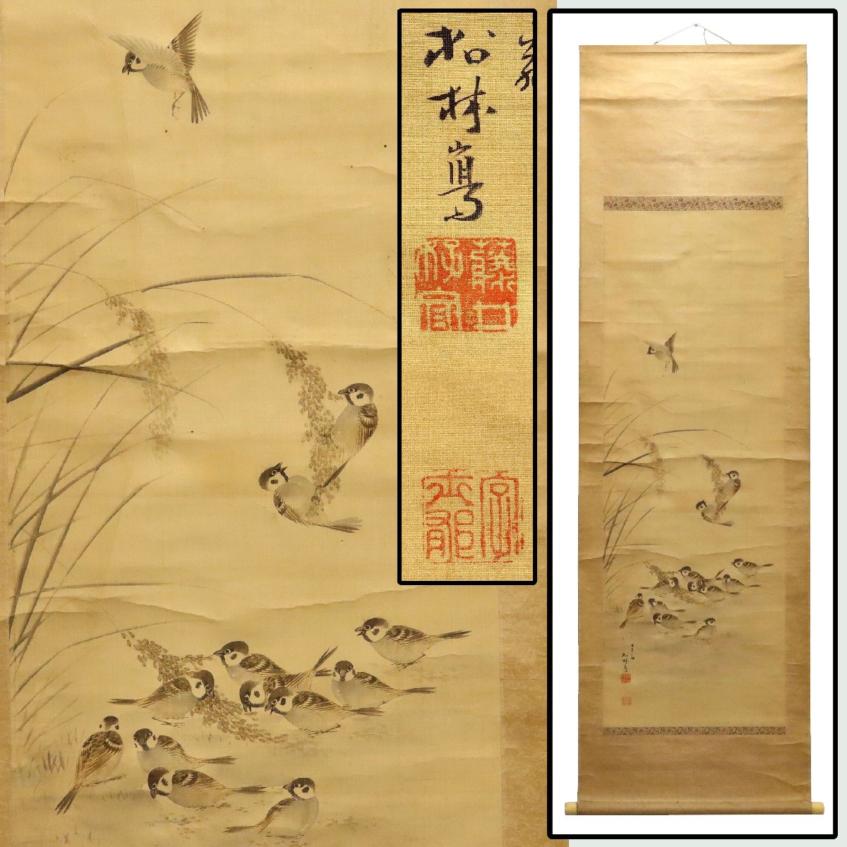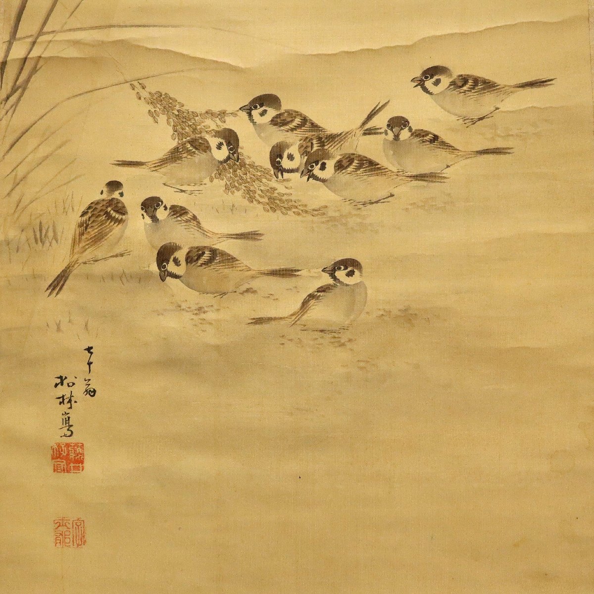 備後国(現・広島県福山市周辺)ゆかり、藤井松林による雀図掛軸。絹本に繊細な筆致で描かれた雀が軽やかな動きと愛らしさを生き生きと表現します。柔らかな色調と余白の美が調和した、鑑賞価値の高い書画骨董です。
