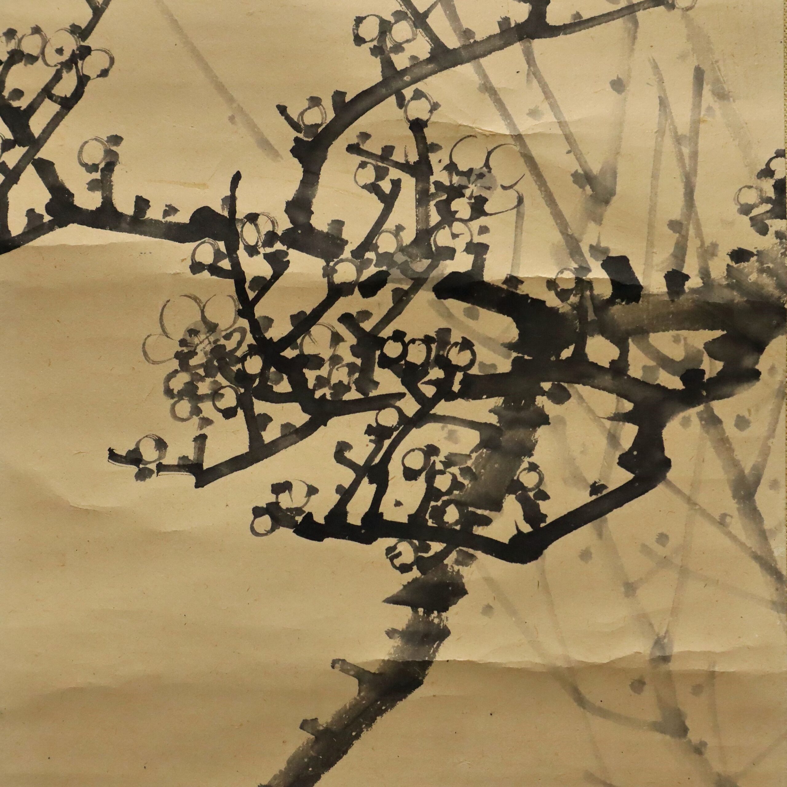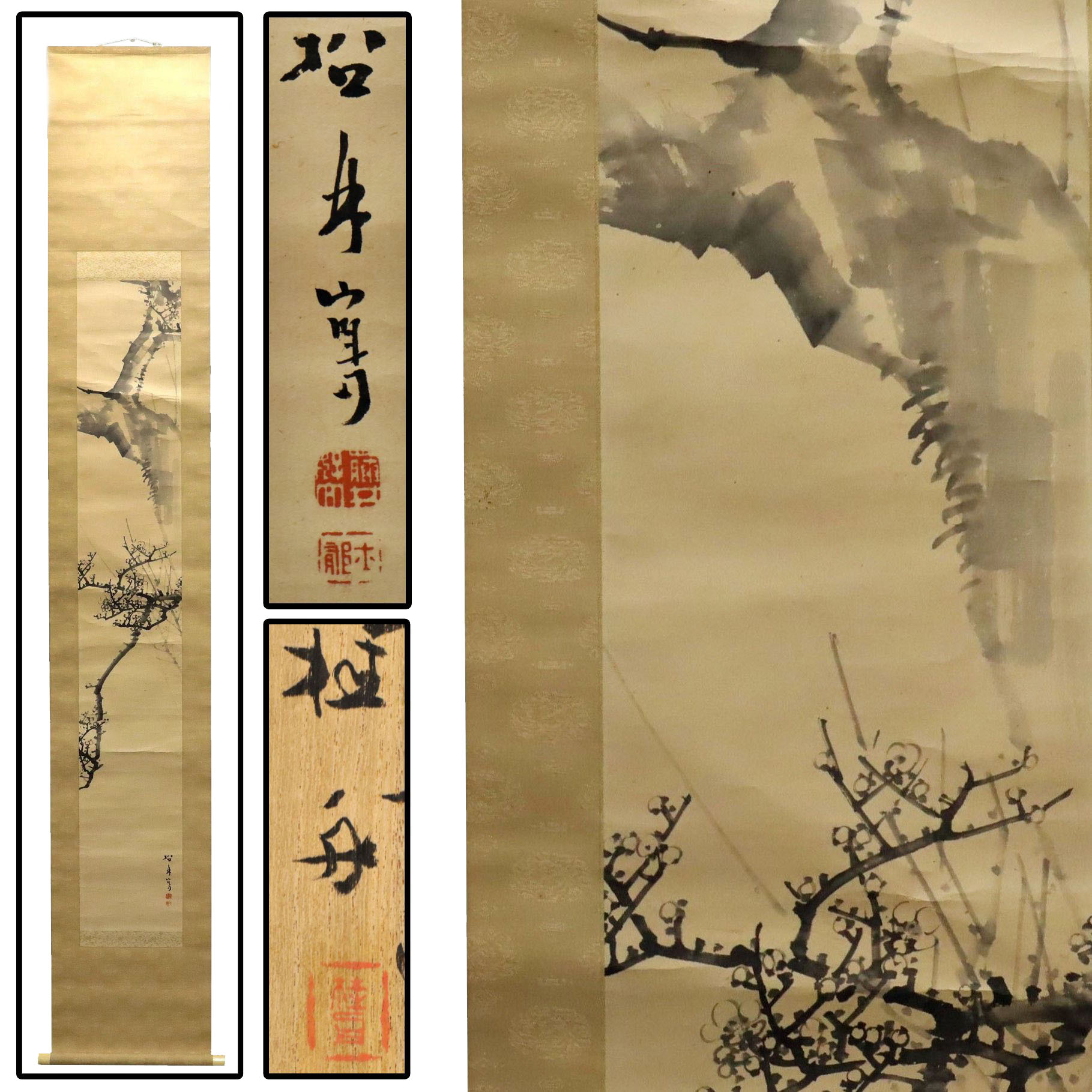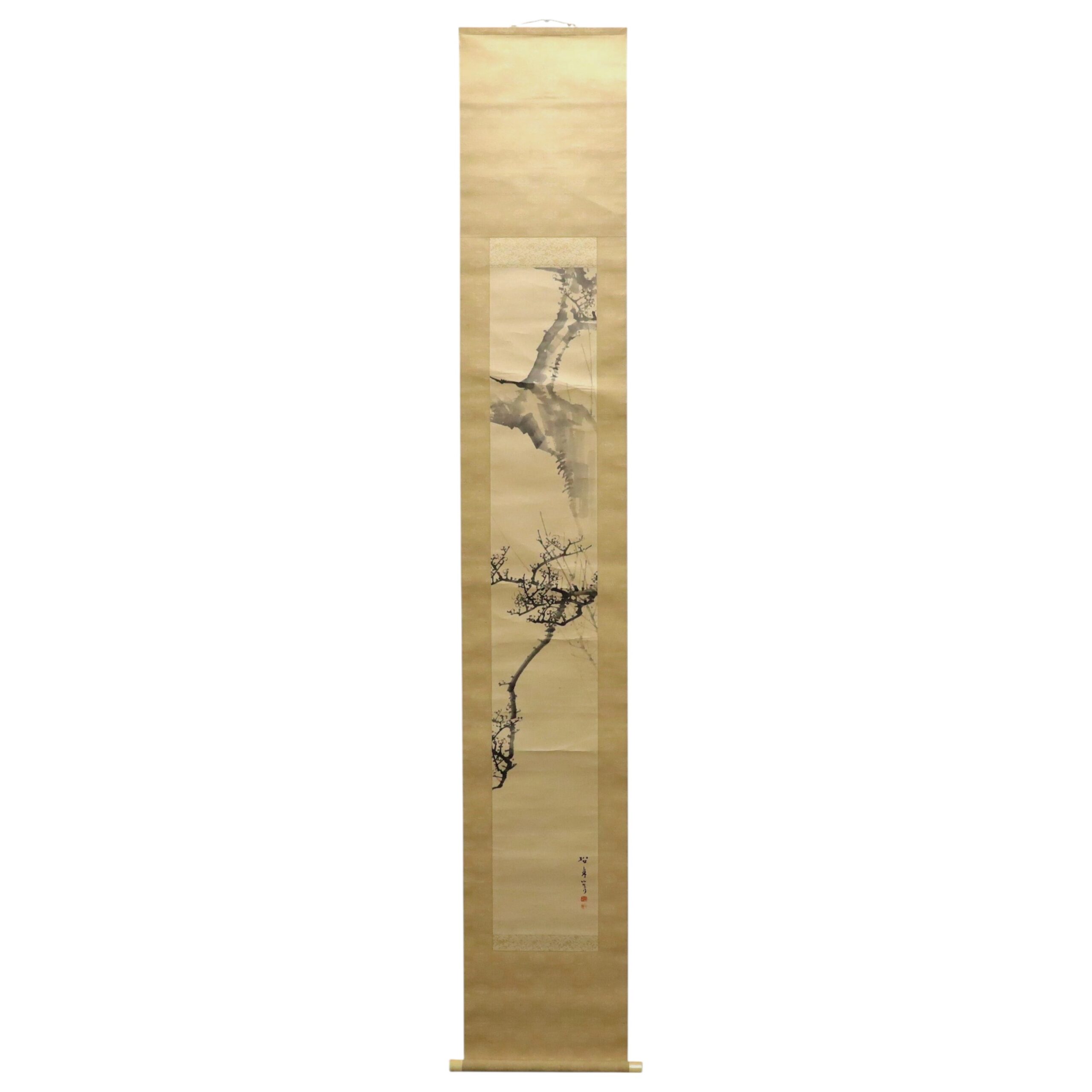 藤井松林による梅の図紙本掛軸、羽田桂舟識箱付。備後ゆかりの画系に連なる作として、寒中に咲く梅花を端正な筆致と淡彩で描き、清雅な気品を表現しています。余白を活かした構図が季節の気配を際立たせ、近代日本画の詩情と吉祥性を備えた骨董書画として資料価値の高い一幅です。