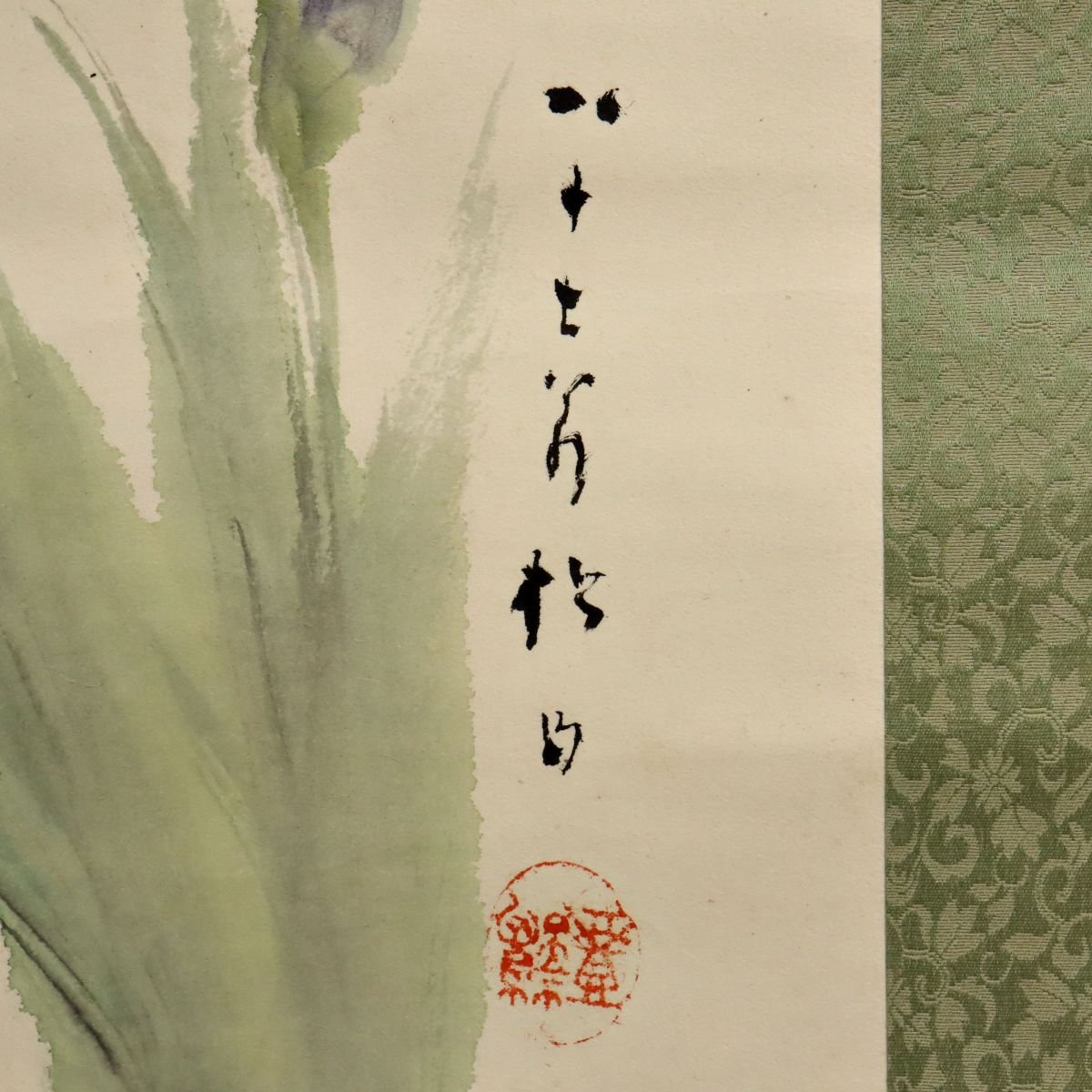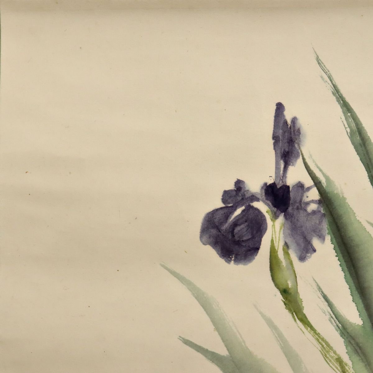 備後ゆかりの画家・藤井松山による菖蒲図の掛軸です。端正な筆致で描かれた菖蒲が季節感と清雅な趣を伝える紙本作品で、共箱付により伝来も確か。鑑賞・蒐集に好適な備後書画として魅力ある一幅です。