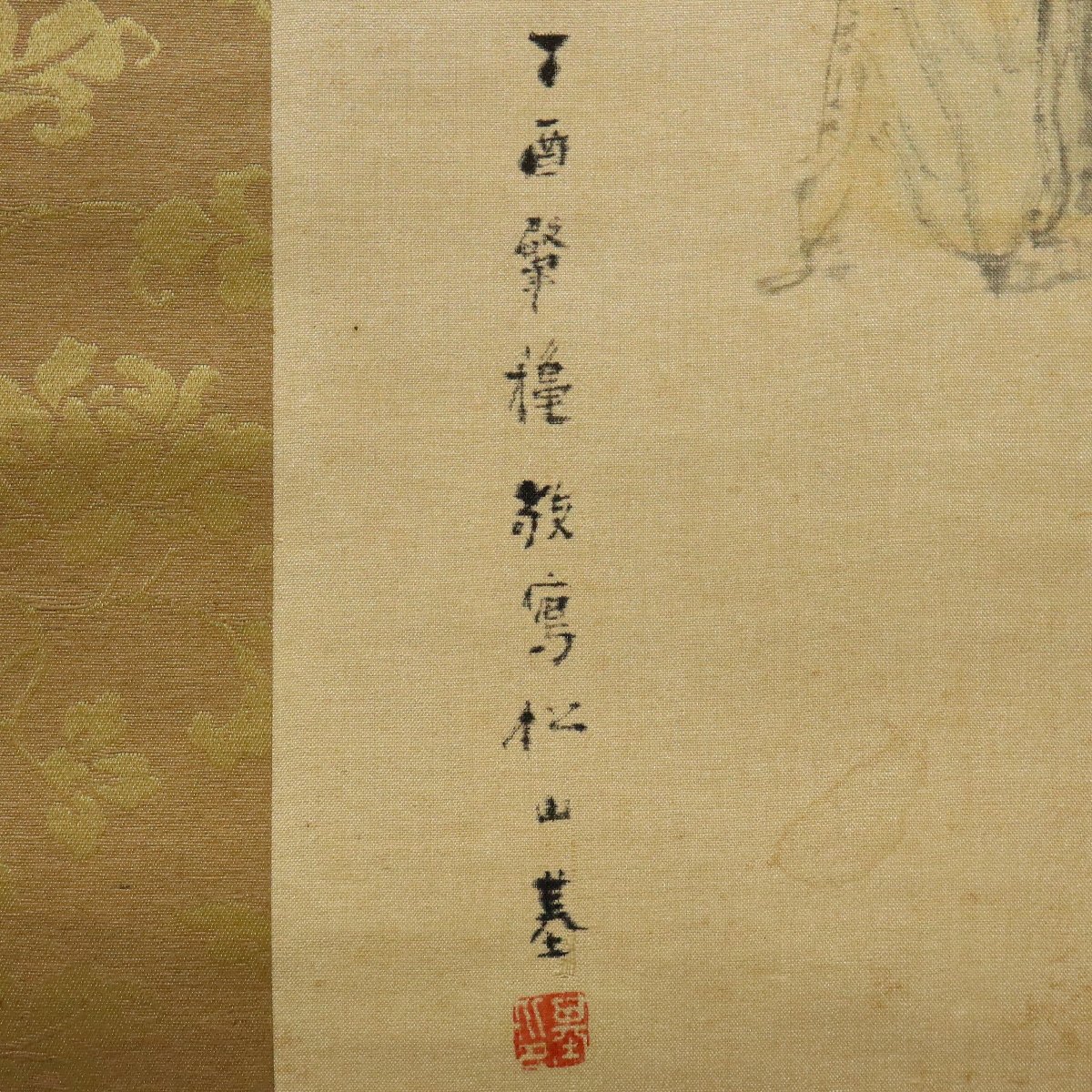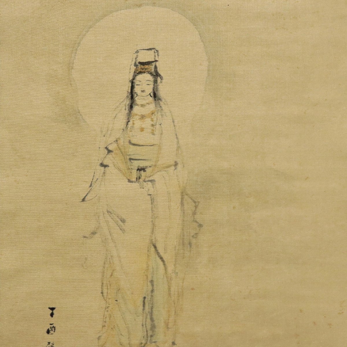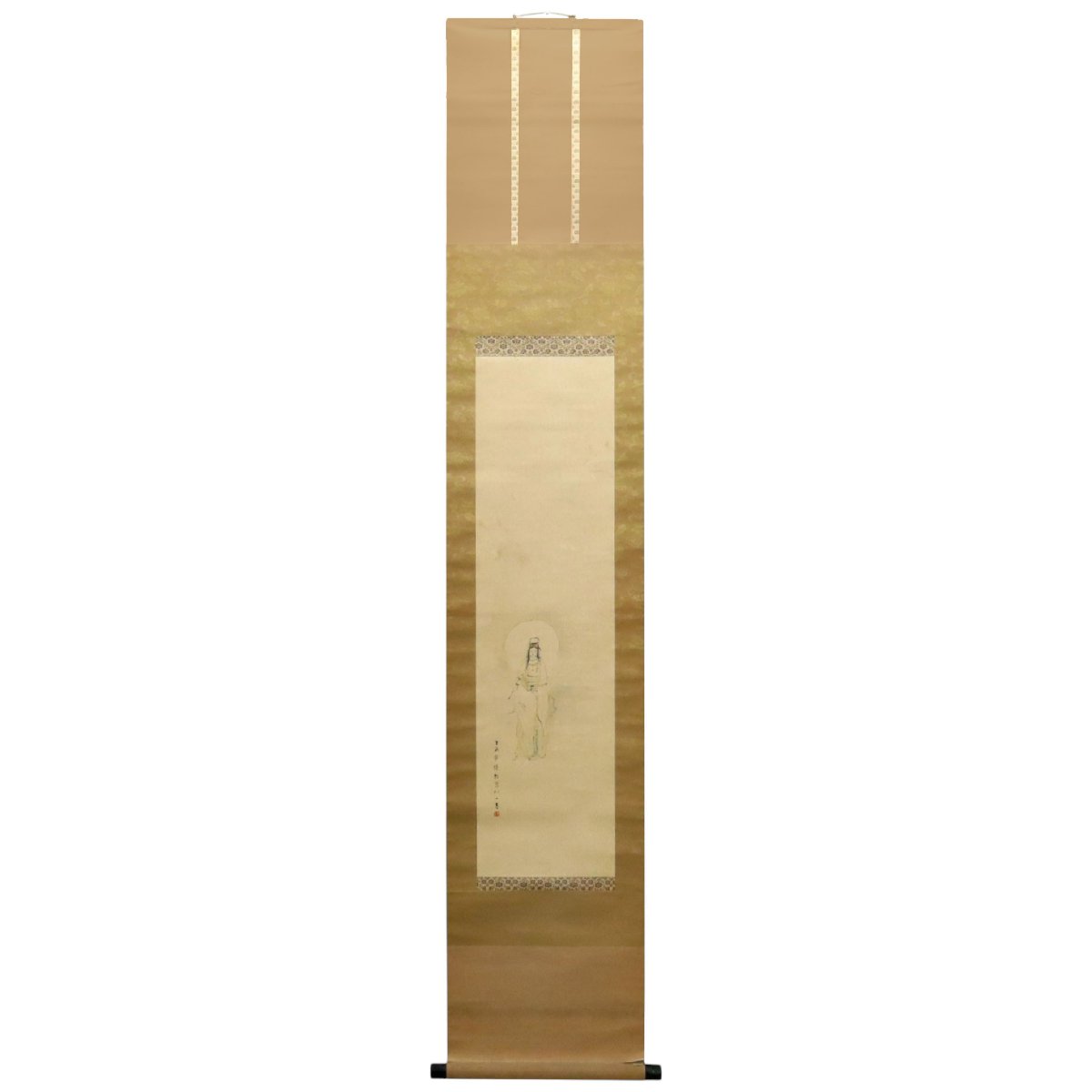 備後出身の書家・藤井松山による白衣観音大士図の掛軸です。清浄無垢を象徴する白衣観音を端正で気品ある筆致により描き、静かな信仰心と文人画の趣が調和した一幅。絹本・共箱を備え資料性も高く、近代備後文人文化と仏教美術の結びつきを伝える蒐集価値ある書画作品です。