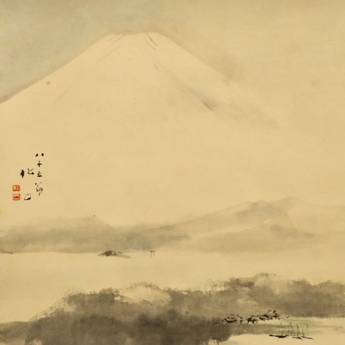 備後国ゆかりの書家・藤井松山による霊峰富士図に、同じく備後の文人・園木冬扇が識を添えた紙本掛軸です。簡潔な筆致で富士の神韻を捉え、地方文人交流の痕跡を今に伝える興味深い一幅。識箱付で来歴の確かさと資料性を備えた発見性ある古美術書画です