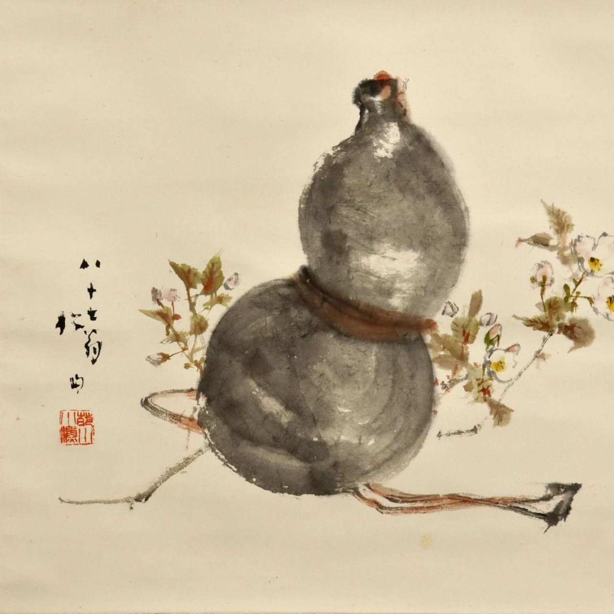 備後ゆかりの画家・藤井松山による瓢櫻図の掛軸です。瓢と桜を配した瑞祥的な意匠を清雅な筆致で描き、松島一晃の識を備えた識箱付で伝来も確か。備後の文人文化を伝える鑑賞・蒐集価値ある書画の一幅です。