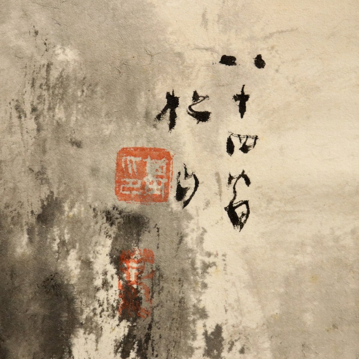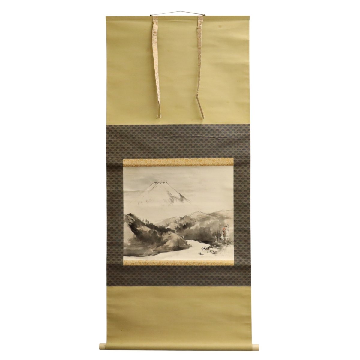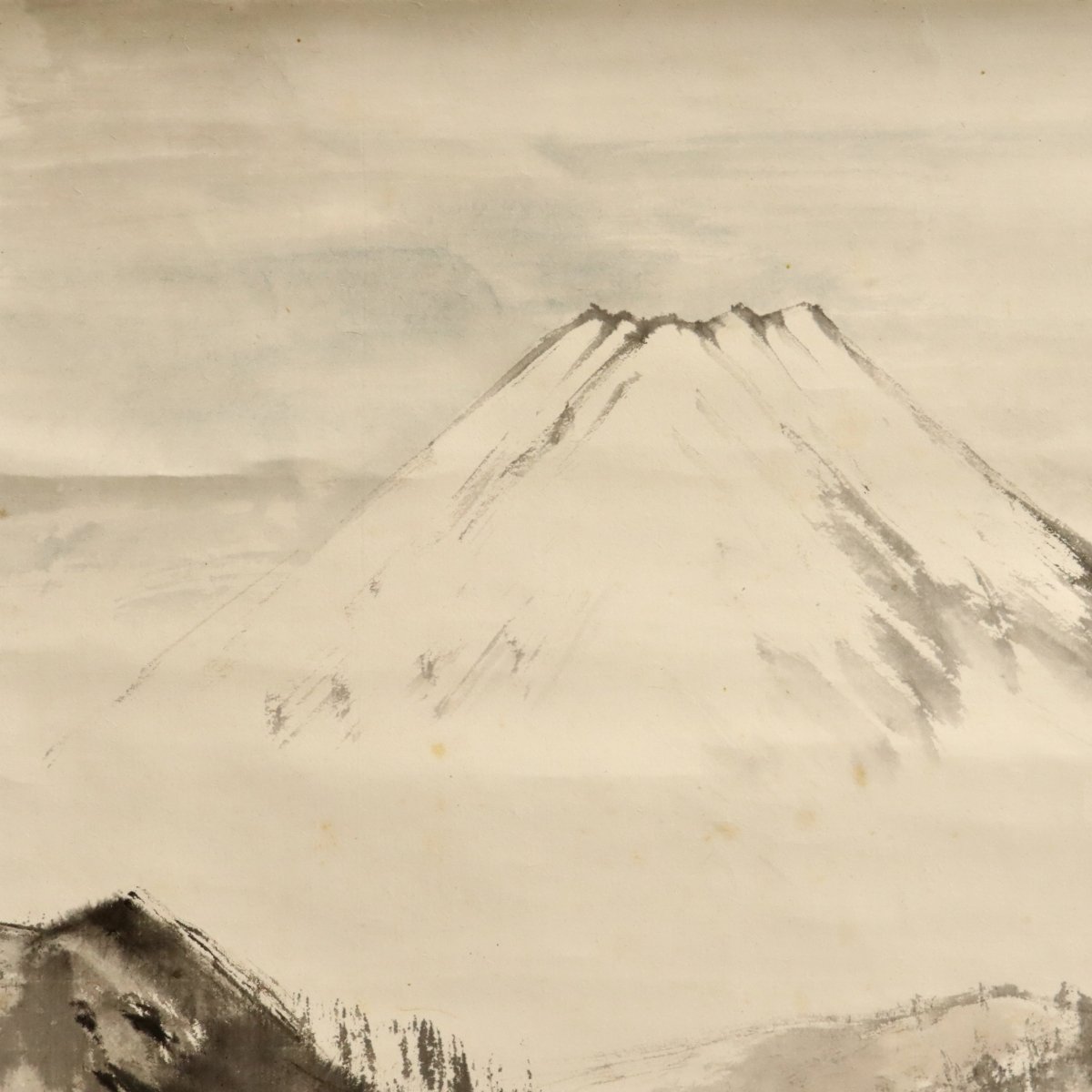 備後ゆかりの書画家藤井松山による「湖上蓉峰図」の紙本掛軸です。共箱付で来歴も感じられ、湖上に望む富士の気高い姿を文人画らしい気韻豊かな筆致で描いた一幅。郷土書画として発見性に富む備後ゆかりの魅力ある骨董掛軸の佳品です。