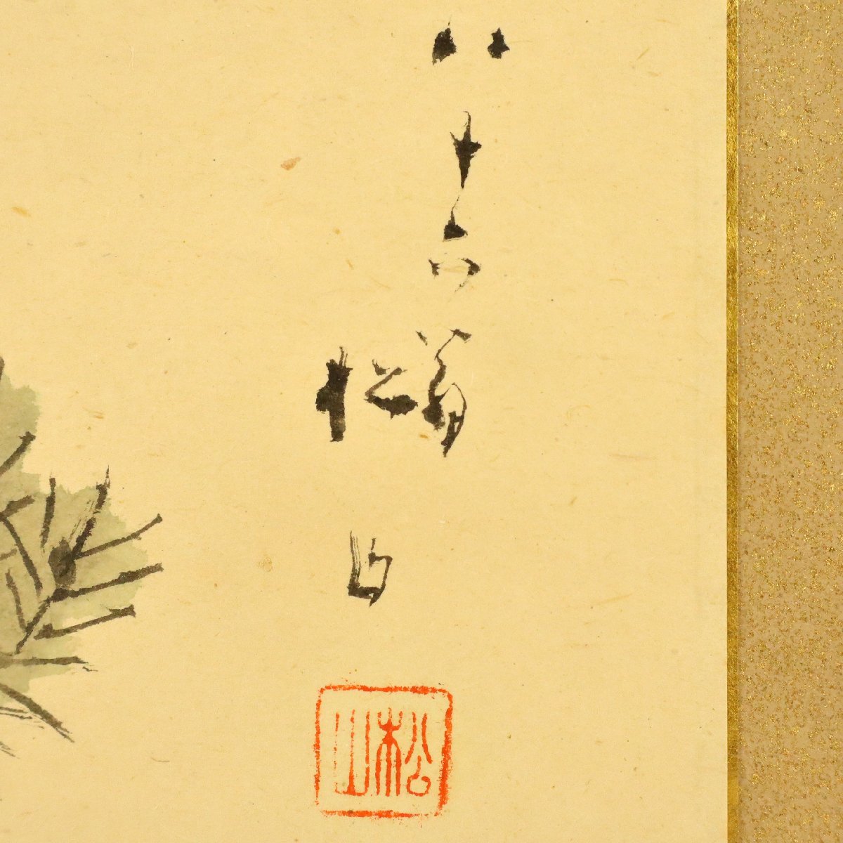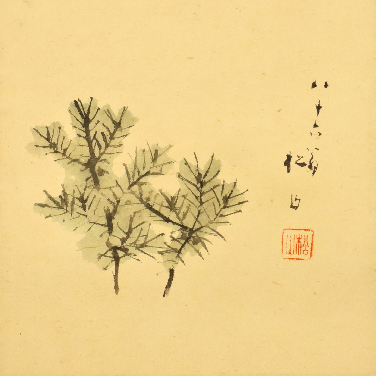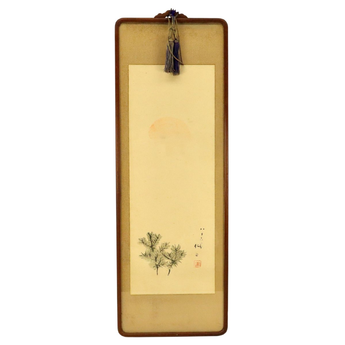 備後ゆかりの日本画家・藤井松山による松図の水彩扁額です。長寿や吉祥を象徴する松を伸びやかな筆致と落ち着いた彩色で表現し、清雅で格調ある趣を漂わせる一作。約65.5×24.2cmの横長意匠が空間に映え、郷土作家の魅力と資料性を兼ね備えた備後美術を伝える骨董書画です。