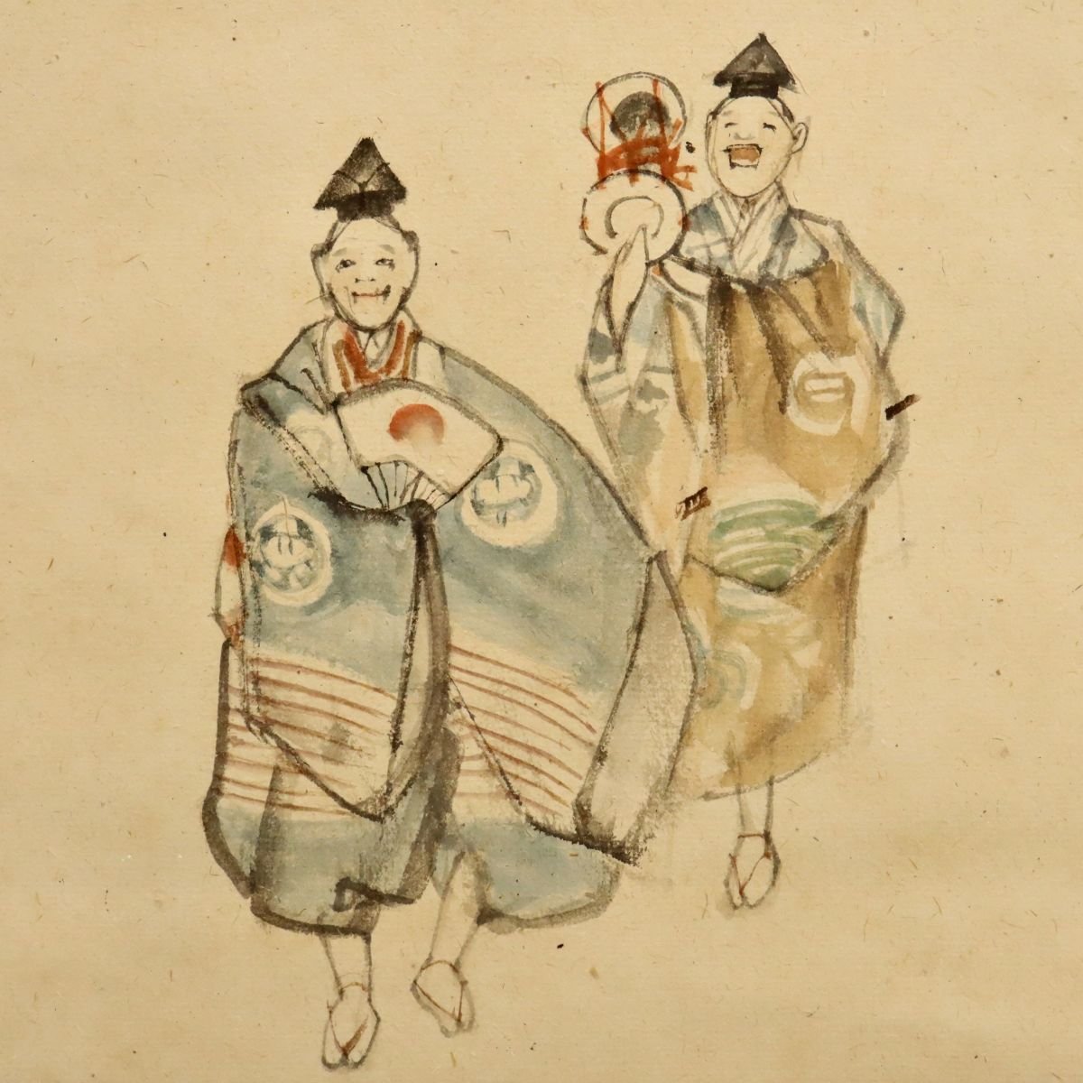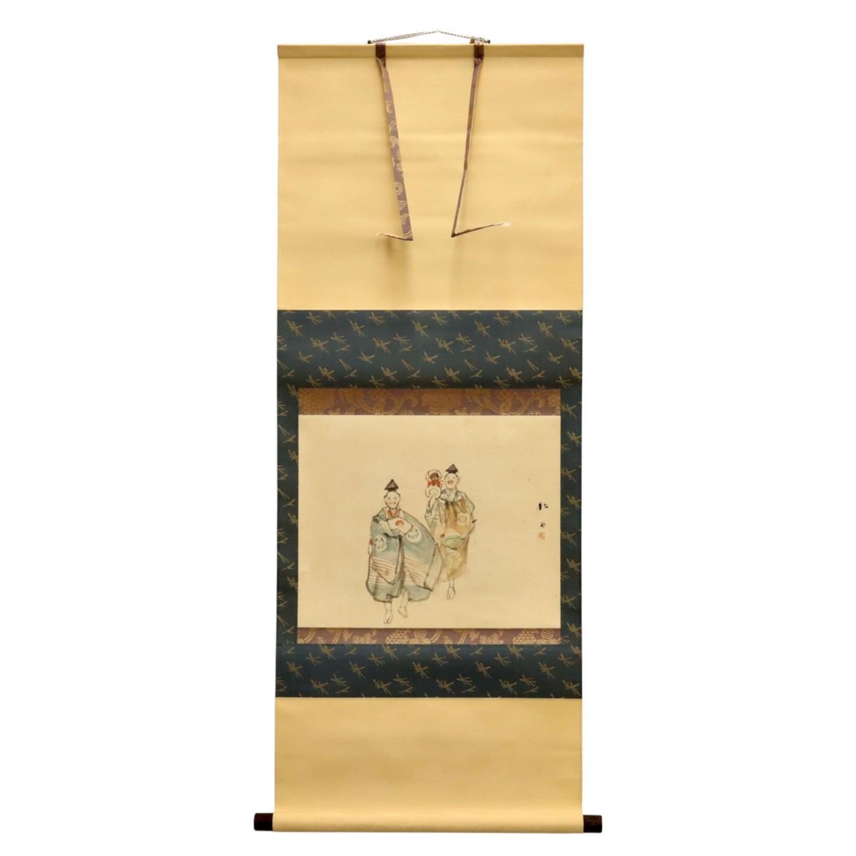 備後ゆかりの書家・藤井松山による「三河万歳図」掛軸。祝儀芸能を題材に軽妙な筆致で躍動感を表し、松島一晃の識箱が伝来を裏付ける資料性も魅力。地域系統がうかがえる紙本の味わい深い収集価値ある一幅です。