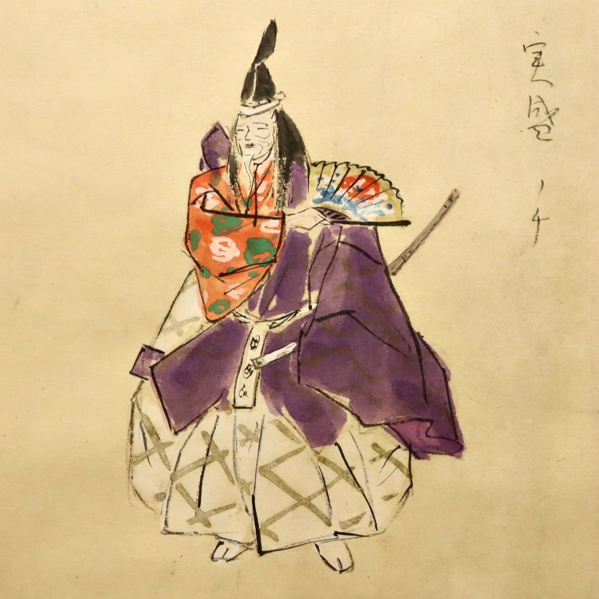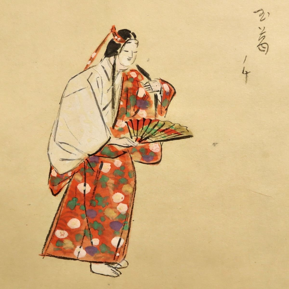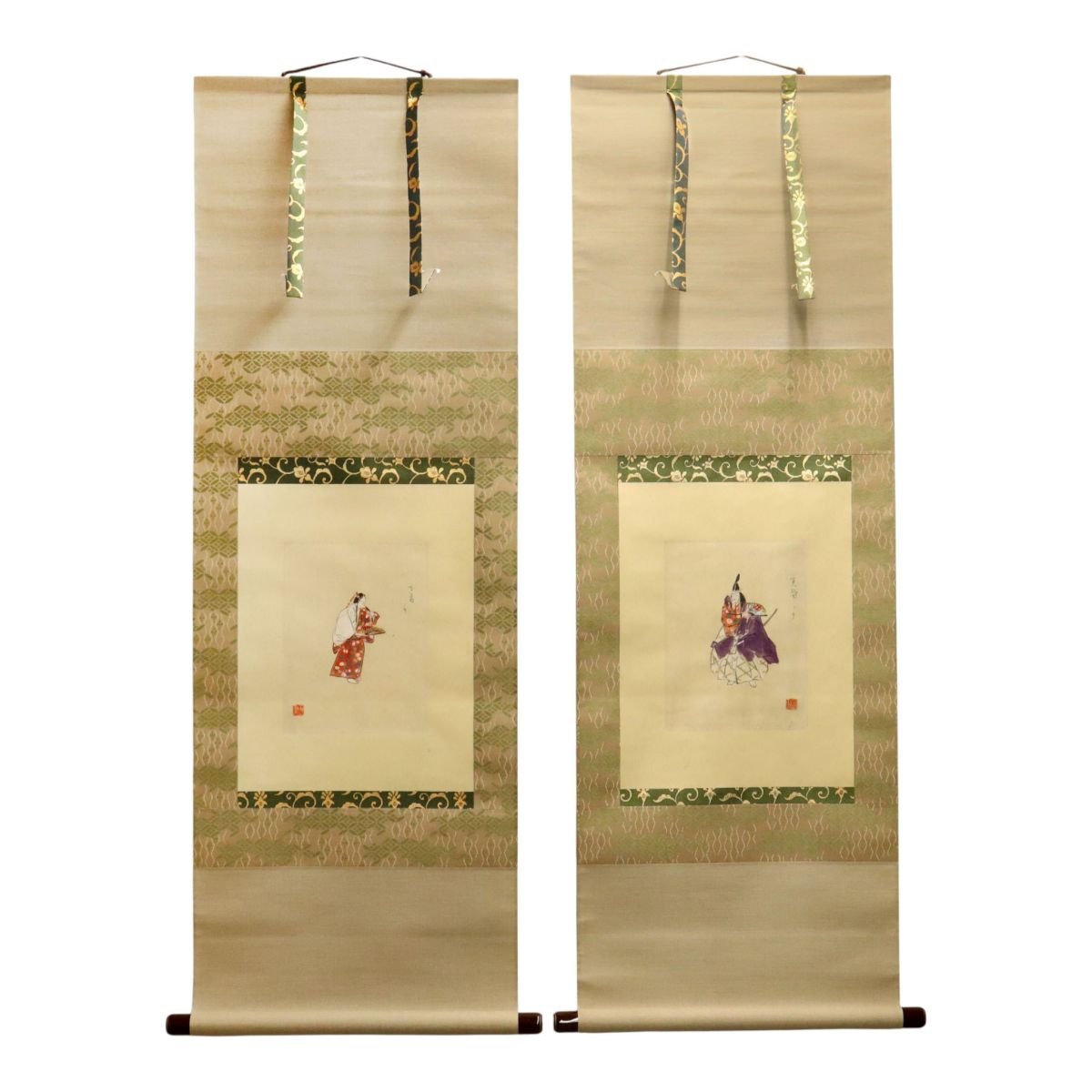 備後出身の書家・藤井松山が、園木冬扇の識を得て描いた「能 実盛図」「玉葛図」の双幅掛軸です。能楽題材の気品ある人物表現と端正な筆致が際立ち、明治期文人交流の趣を伝える識箱付の貴重な書画資料としても魅力ある一幅。観能文化と地方文人画壇の結びつきを感じられる点も蒐集家にとって見逃せない見所です。