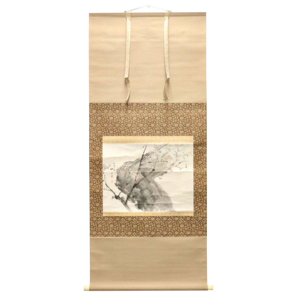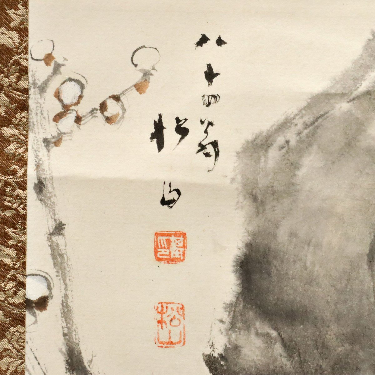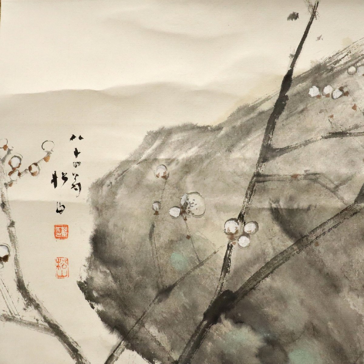 備後ゆかりの書家・藤井松山による老梅図に、同地の画人・佐藤古岫が識を添えた紙本掛軸です。風雪に耐えた老梅を力強く表し、文人精神と備後地方の書画交流の厚みを今に伝える味わい深い一幅。識箱付で資料性も備えた発見性ある古美術書画です。
