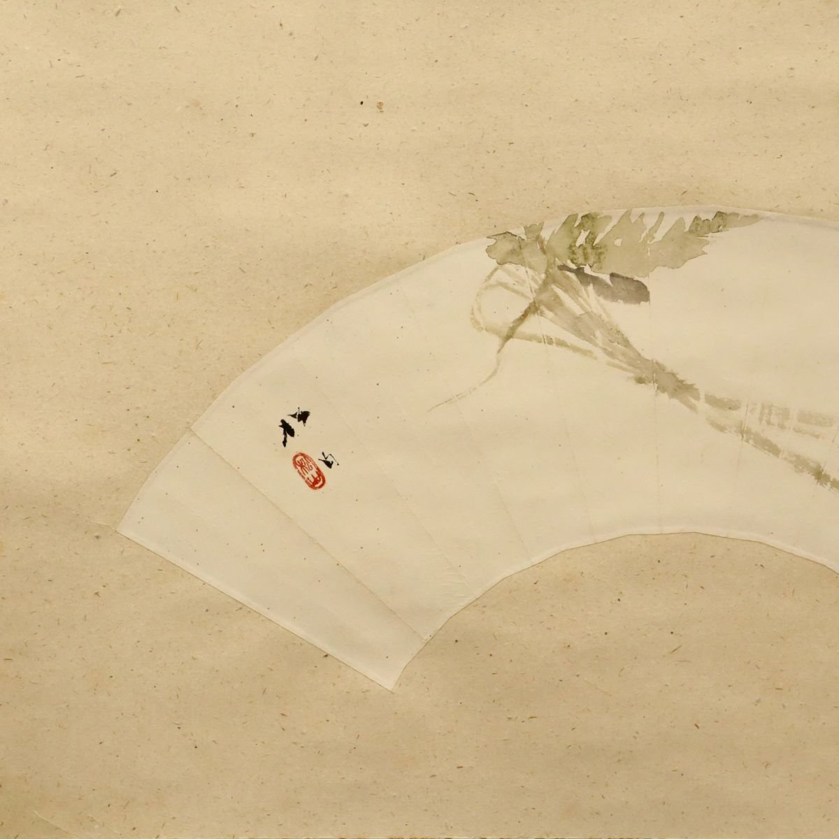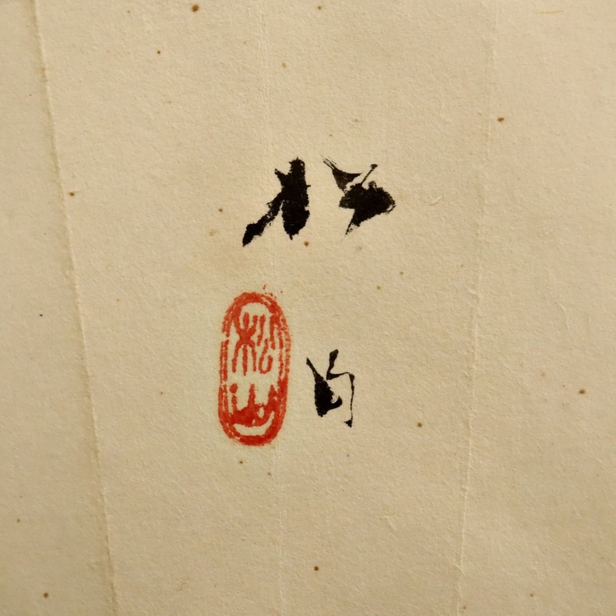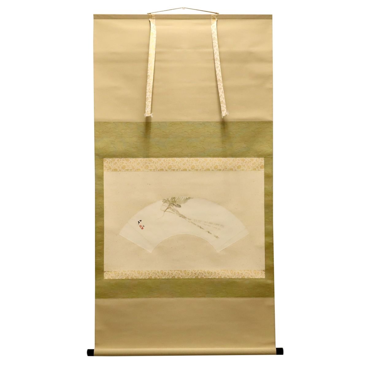 備後ゆかりの日本画家・藤井松山による「扇面注連図」紙本掛軸です。扇面に注連飾りを描いた清浄感ある意匠が印象的で、季節感と吉祥性を兼ね備えた趣深い一幅。園木冬扇による識書を備えた識箱付で来歴も興味深く、郷土美術の魅力と資料性を伝える鑑賞価値の高い骨董掛軸です。