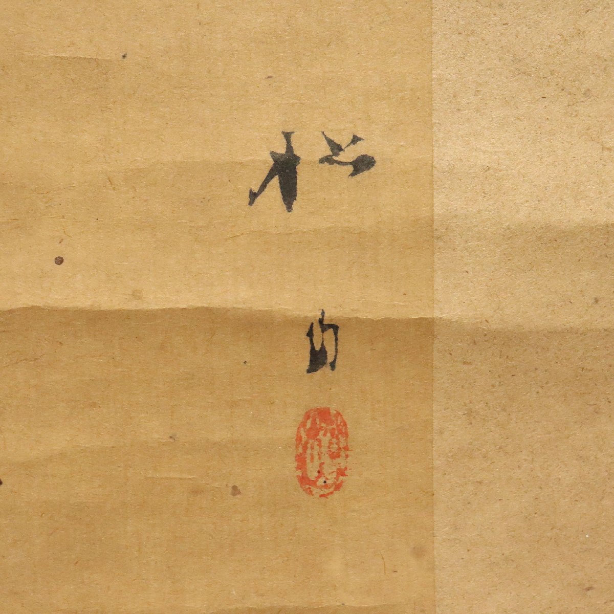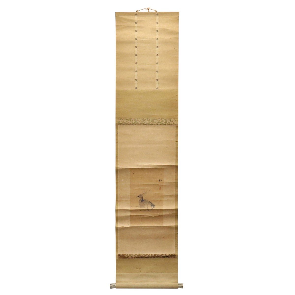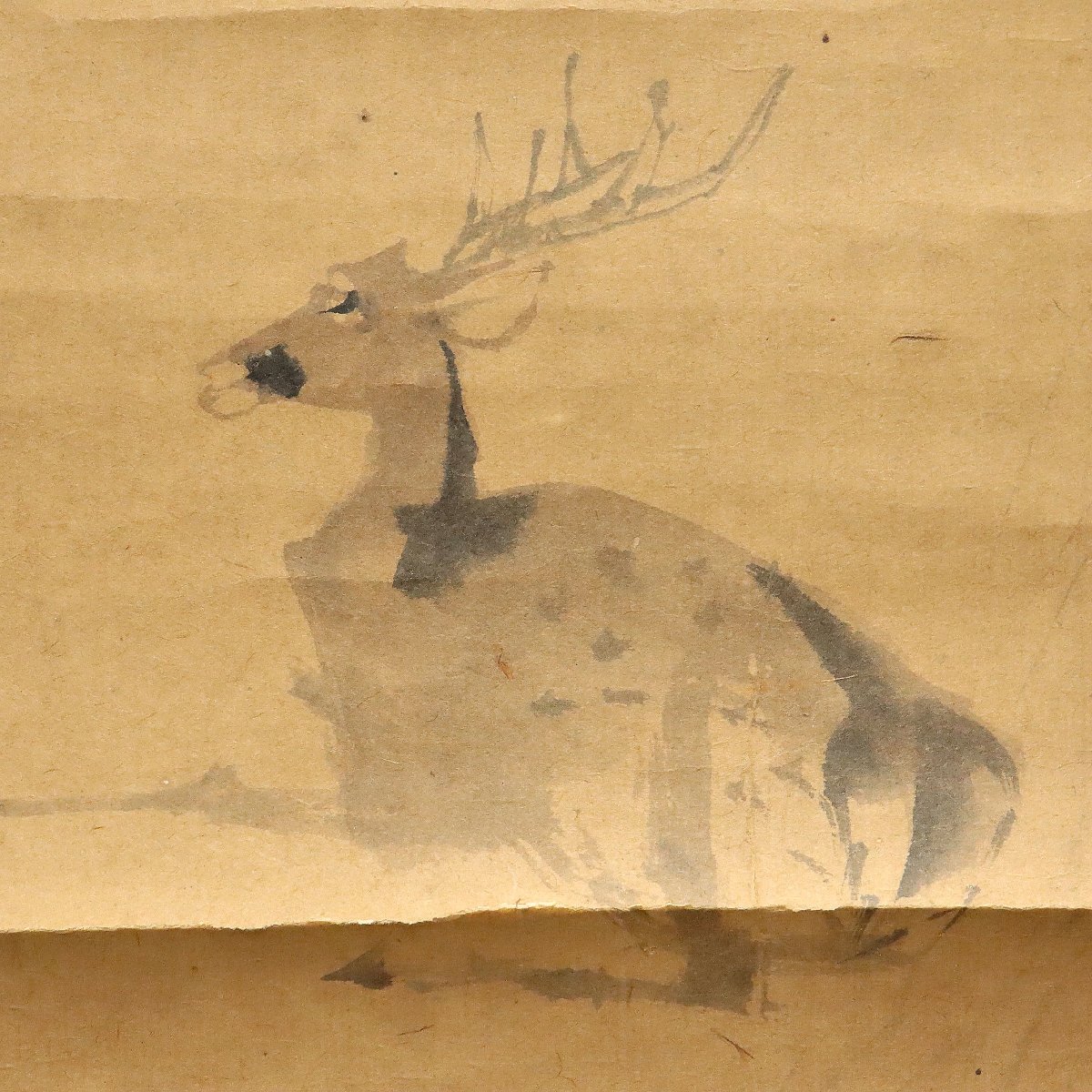 備後ゆかりの日本画家・藤井松山による鹿図の紙本掛軸です。静寂な自然の気配を背景に、神鹿としても尊ばれる鹿の姿を気品ある筆致で描写し、清雅な趣を漂わせる一幅。共箱付で来歴も安心でき、床の間を格調高く演出する郷土色豊かな備後美術の魅力を伝える骨董掛軸です。
