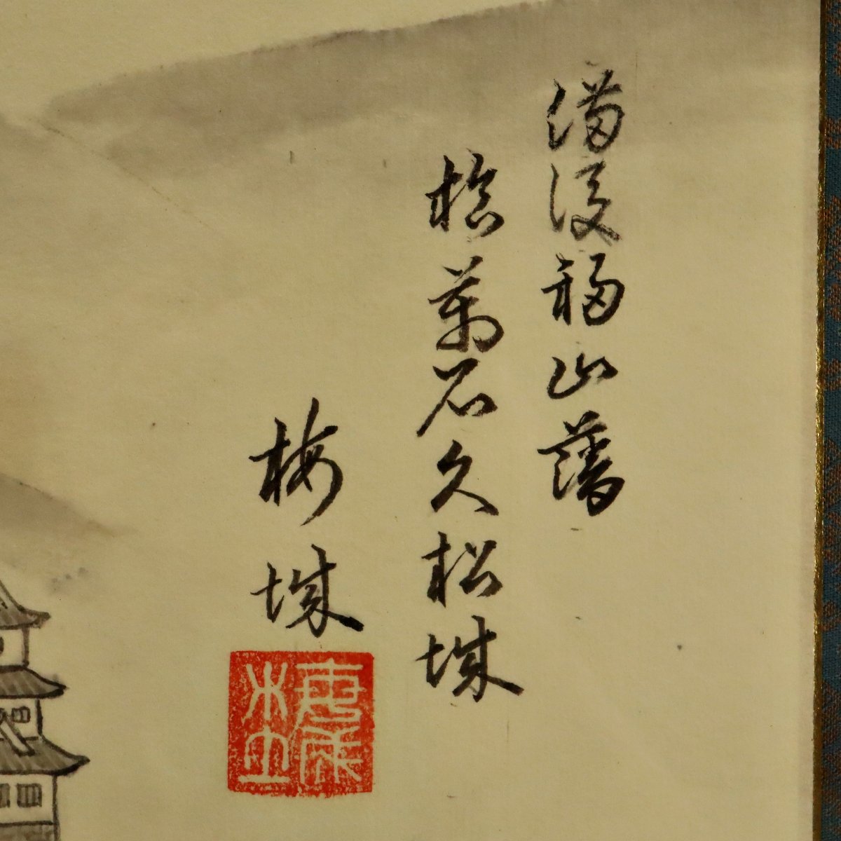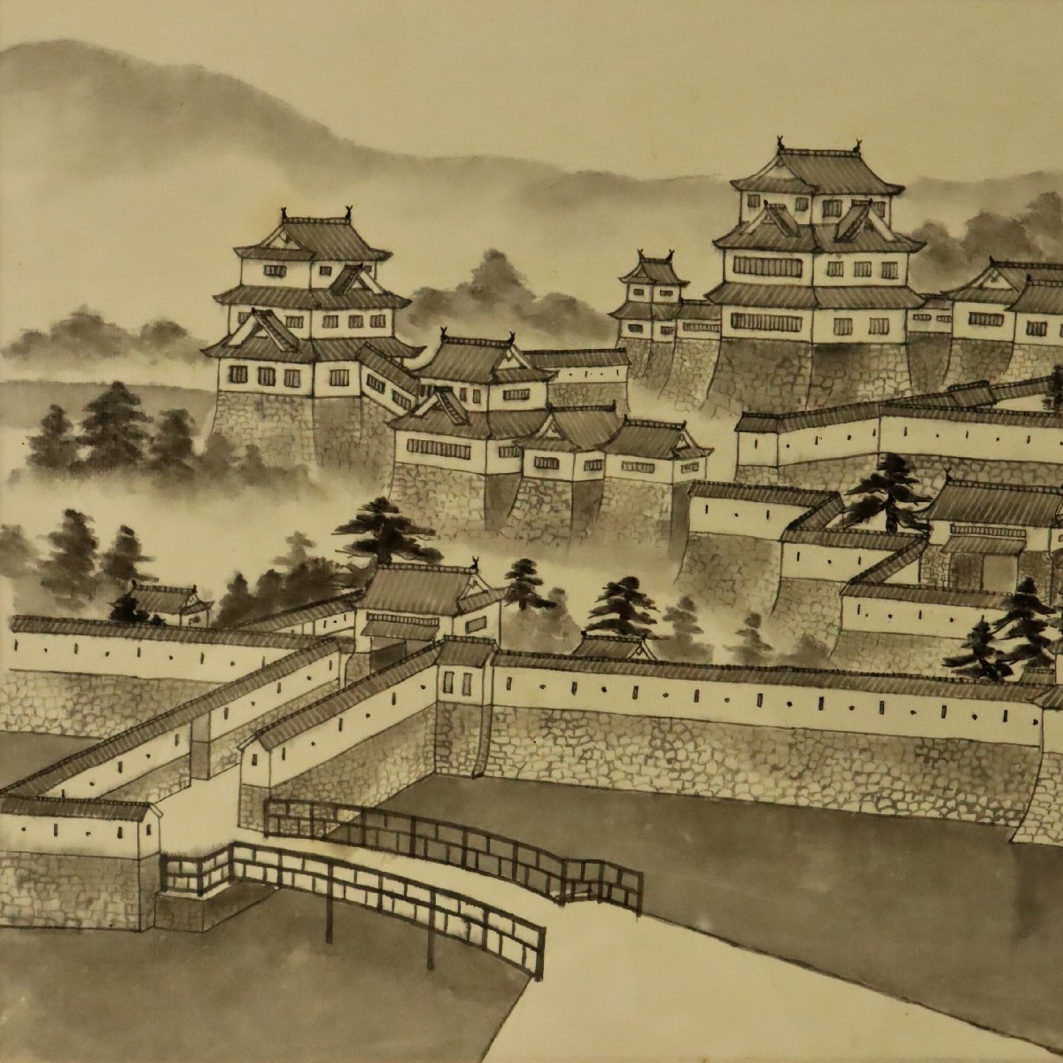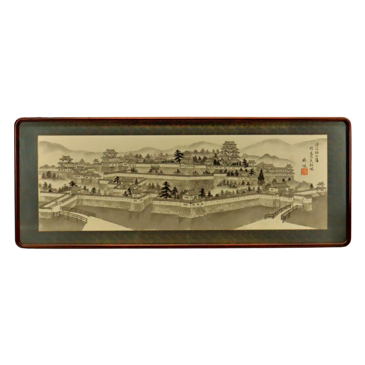 備後福山藩の居城として知られる福山城を描いた在銘「福山藩久松城」扁額です。堂々たる構図で城郭の威容と歴史的風格を伝える郷土色豊かな一作で、福山市の歴史を今に伝える資料性と蒐集価値を備えた貴重な書画作品です。