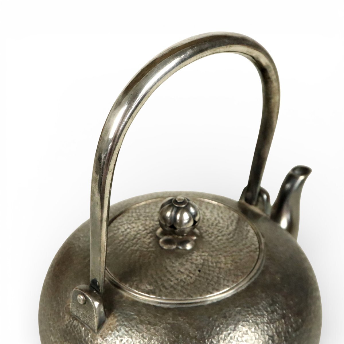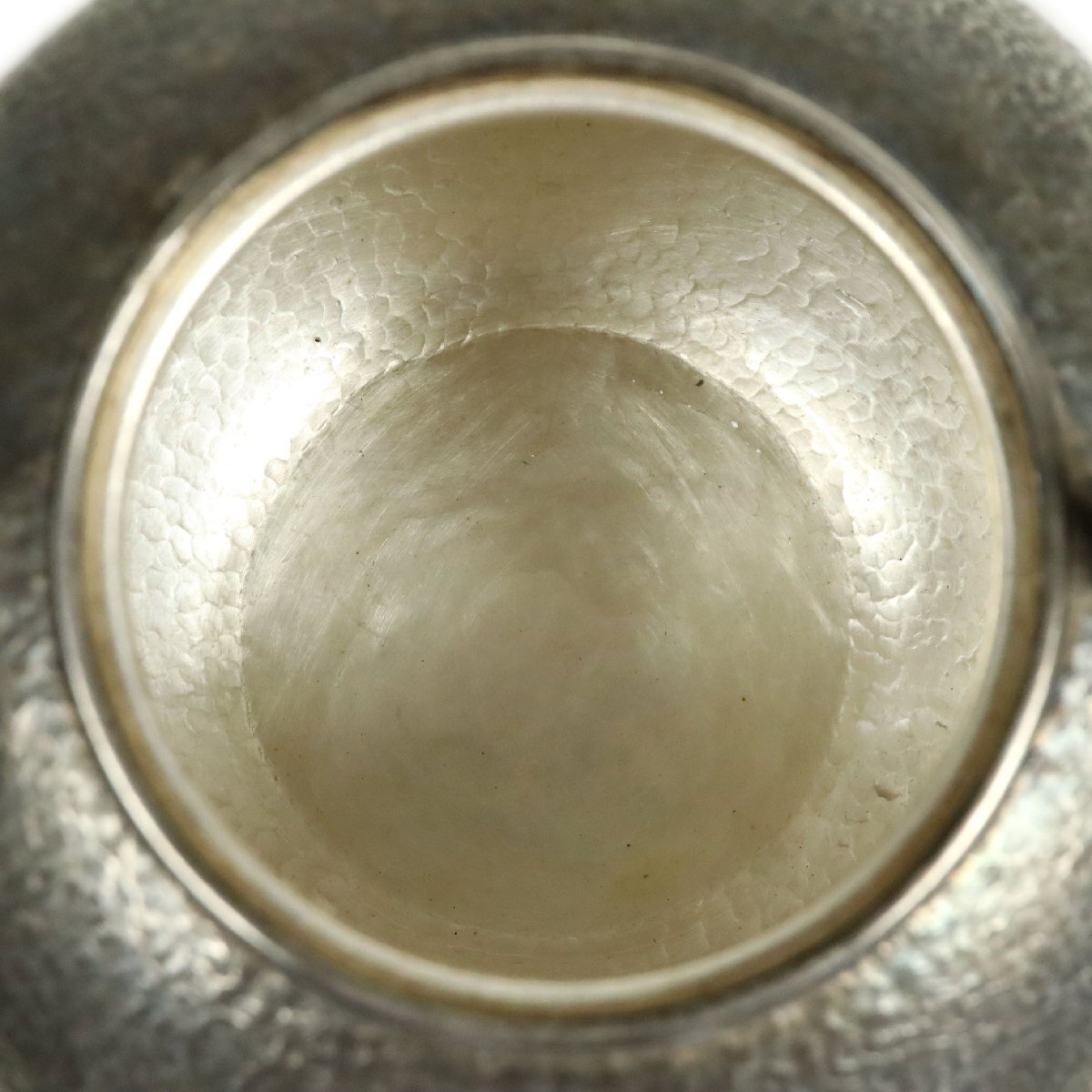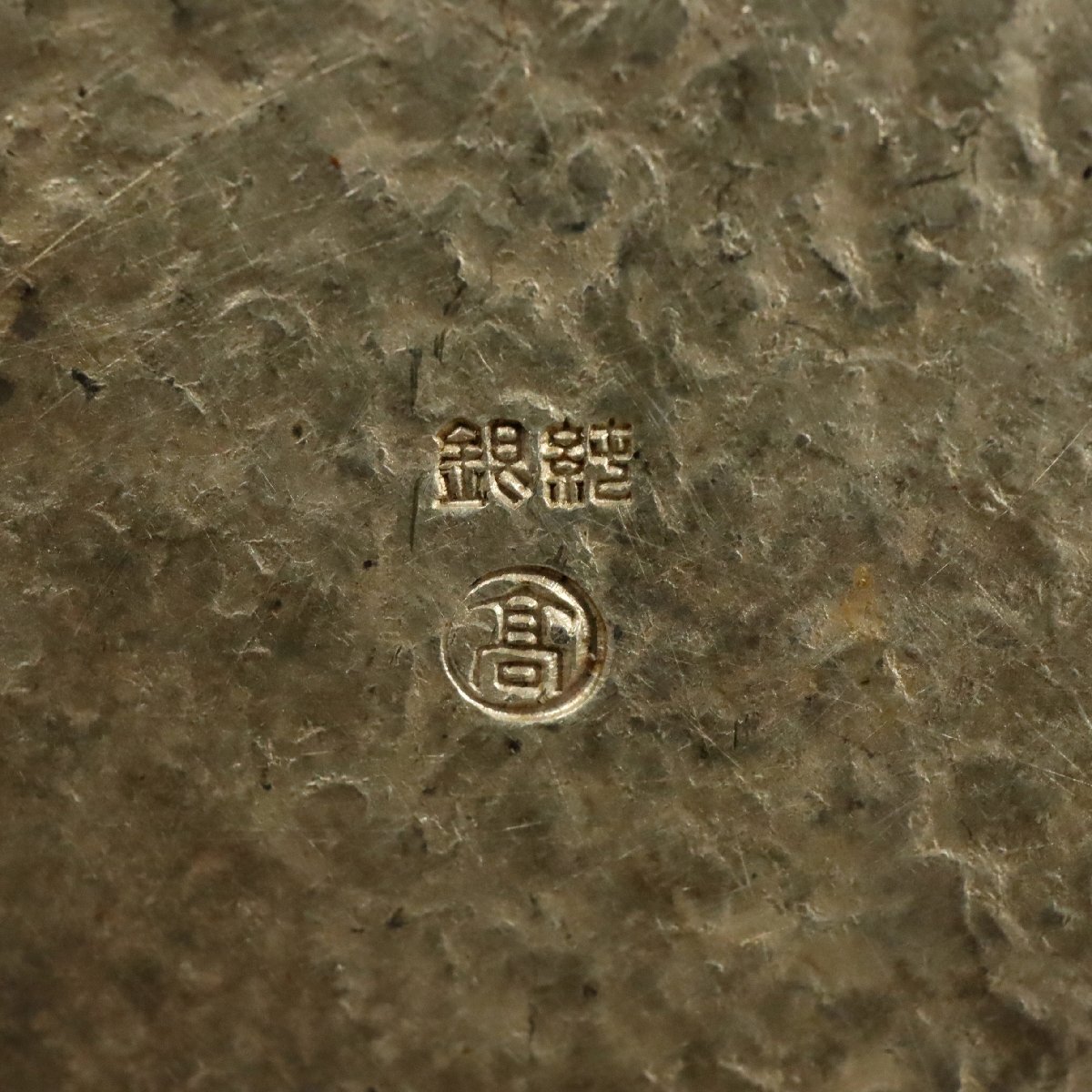熟練の職人が一打一打丹念に打ち込んだ「槌目(つちめ)」模様は、銀特有の柔らかな光沢に複雑な陰影を与え、手仕事ならではの力強さと用の美を体現しています。さらに、蓋には繊細な意匠の「回転花摘(かいてんはなつみ)」が施されており、細部にまで至る高島屋のこだわりと美意識が、茶席に凛とした品格をもたらします。