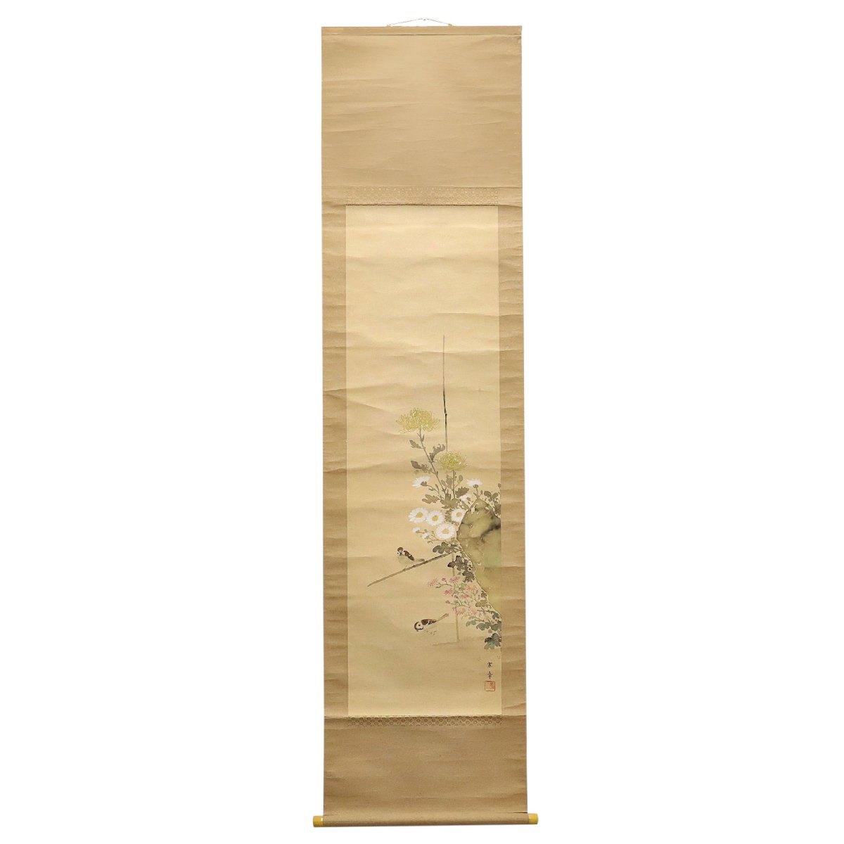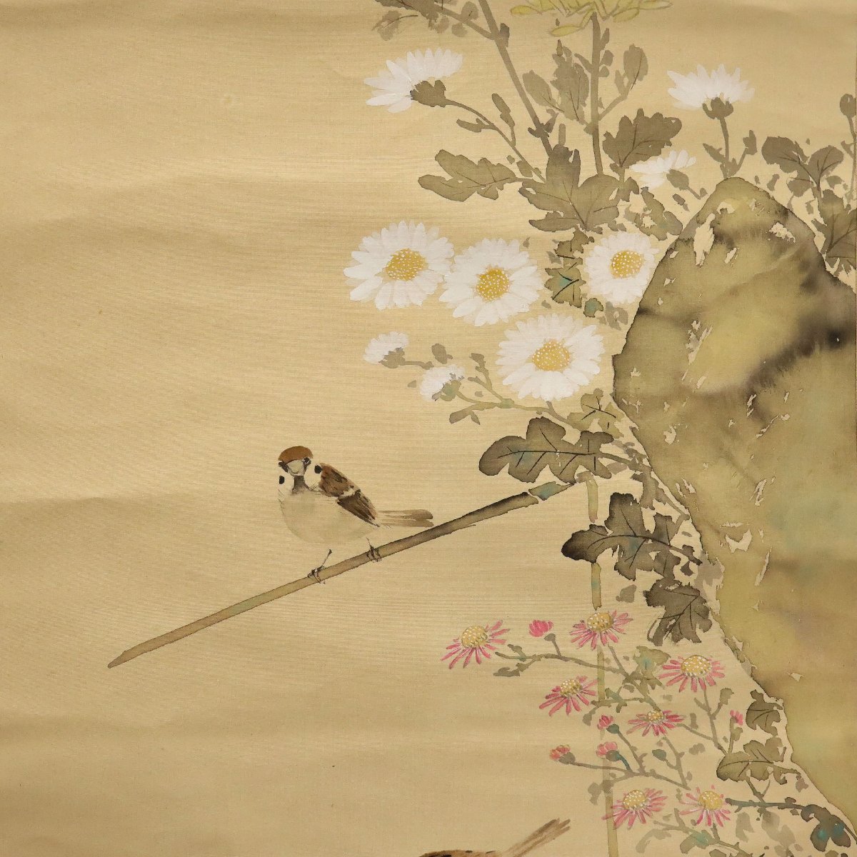 濱本憲章による花鳥図の掛軸、絹本に描かれ共箱付きです。広島県備後地方で制作され、繊細な筆致と色彩で四季折々の花鳥を生き生きと表現。茶室や座敷に趣を添える書画骨董品として、地方美術の精華を今に伝える逸品です。
