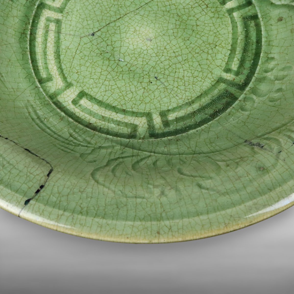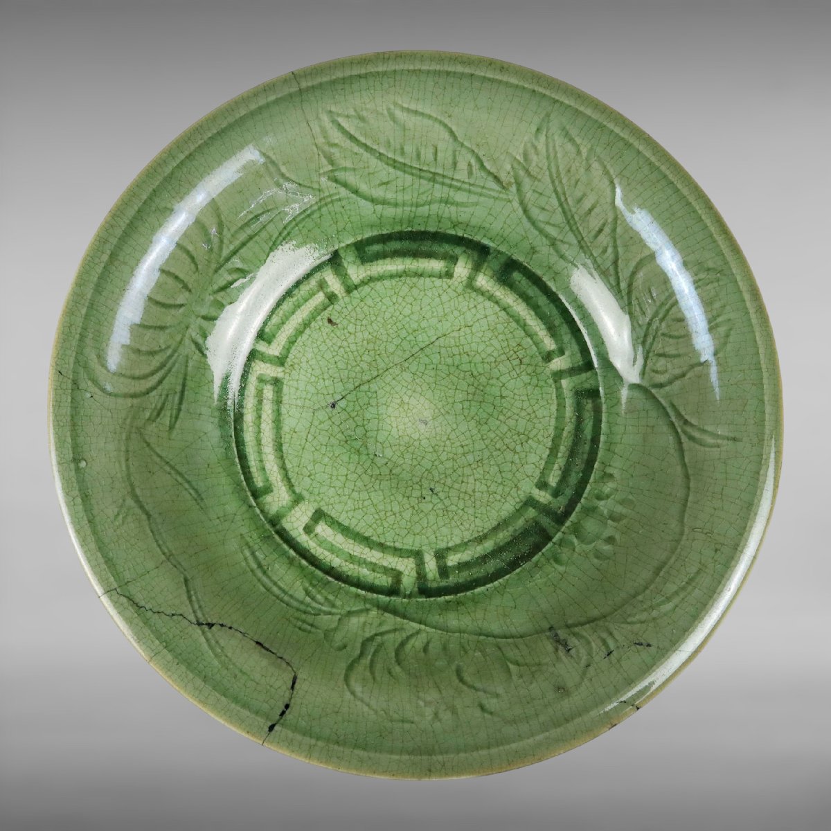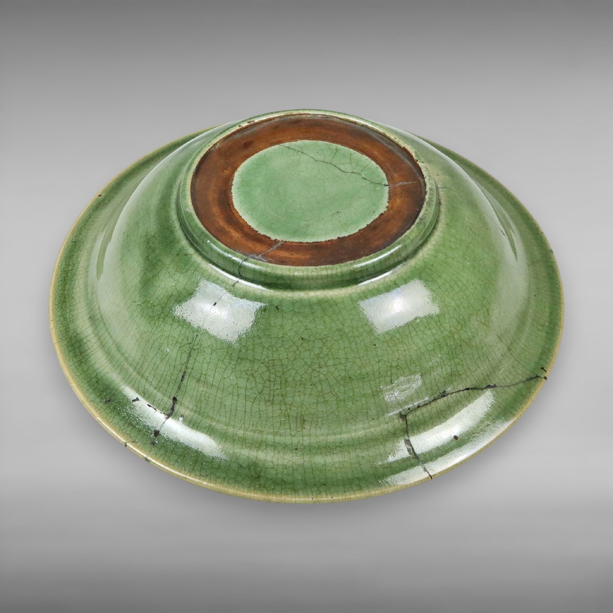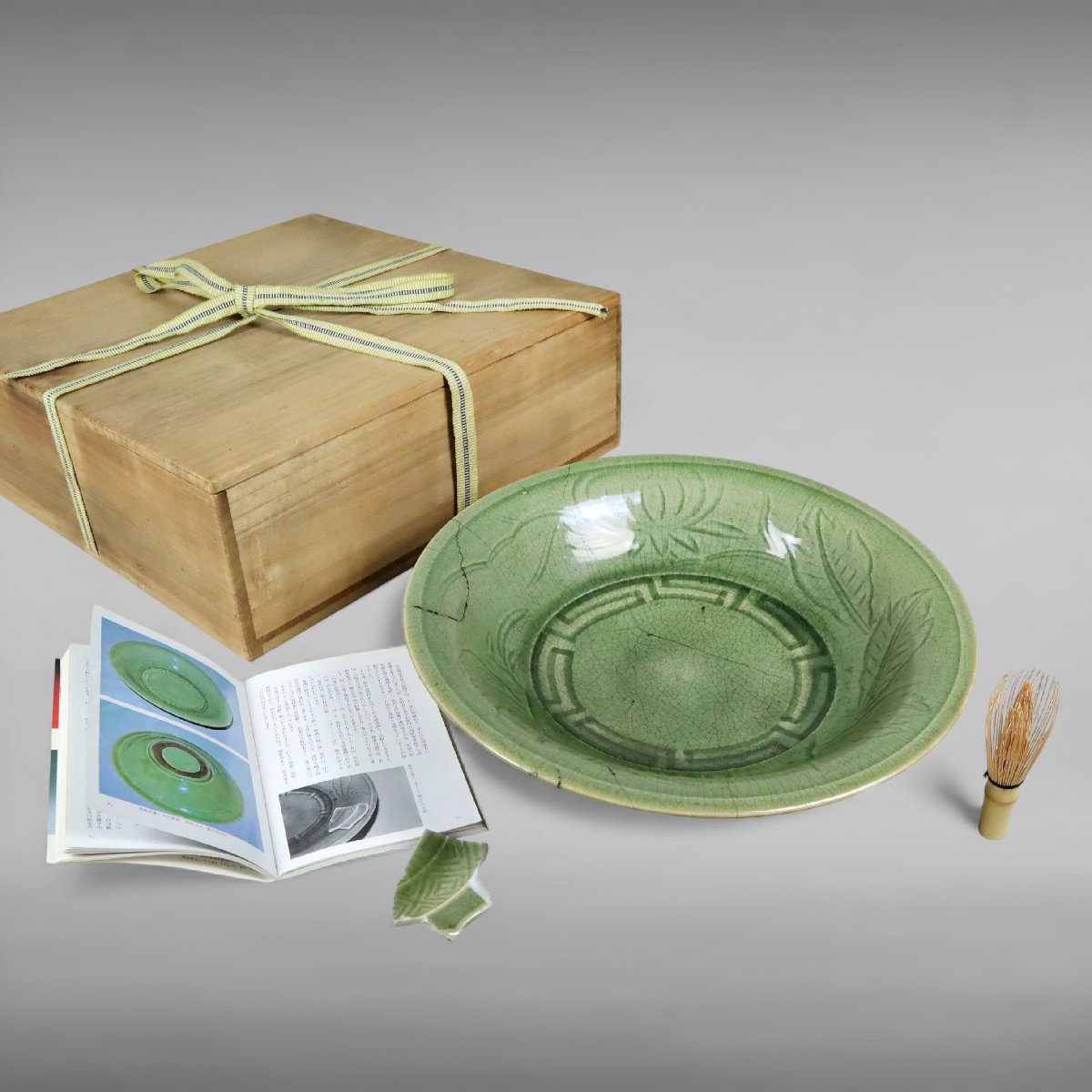江戸期、備後国福山に伝来した幻の焼物として知られる姫谷焼の青磁大鉢です。柔らかな青磁釉の上品な発色と堂々たる器形が当時の備後地方の作陶文化を今に伝える貴重な逸品で、『小さな蕾』所載の来歴確かな箱付古美術品として蒐集価値の高い資料性も備えています。