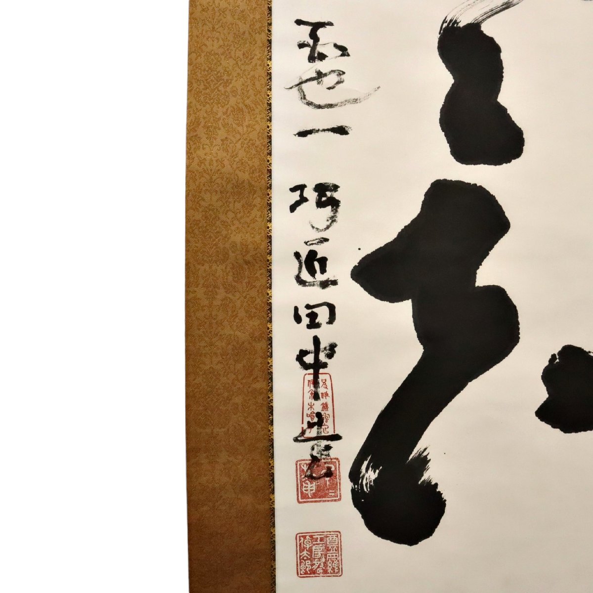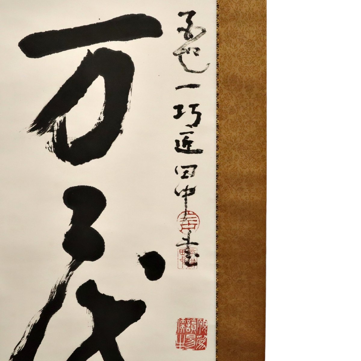 岡山県井原市出身、文化勲章受章の彫刻界の巨匠・平櫛田中が百一歳時に揮毫した双幅「萬代不易 出入大吉」紙本掛軸です。長寿円熟の境地を示す伸びやかな筆致が吉祥の趣を高める格調高い一対で、共箱付として資料性・蒐集価値に優れた貴重な書作です。