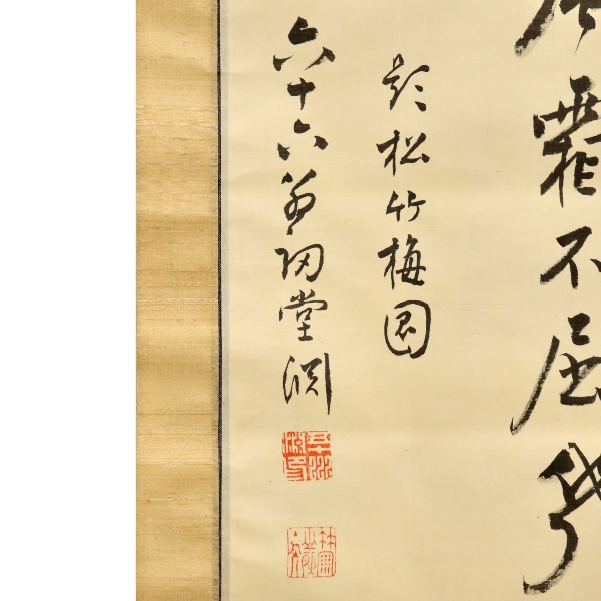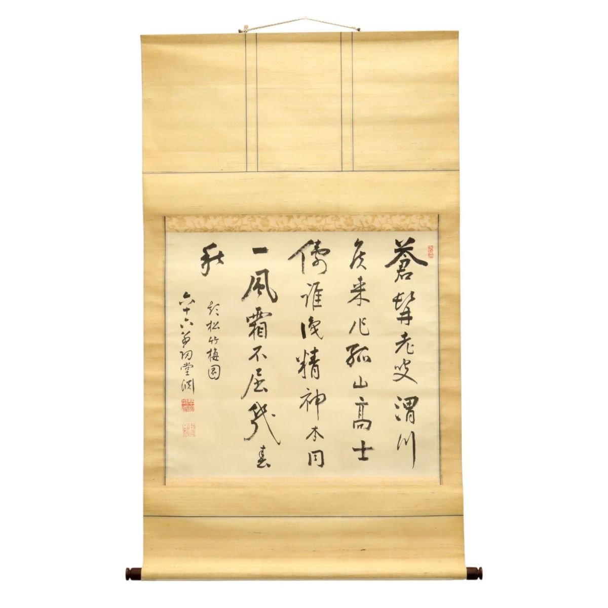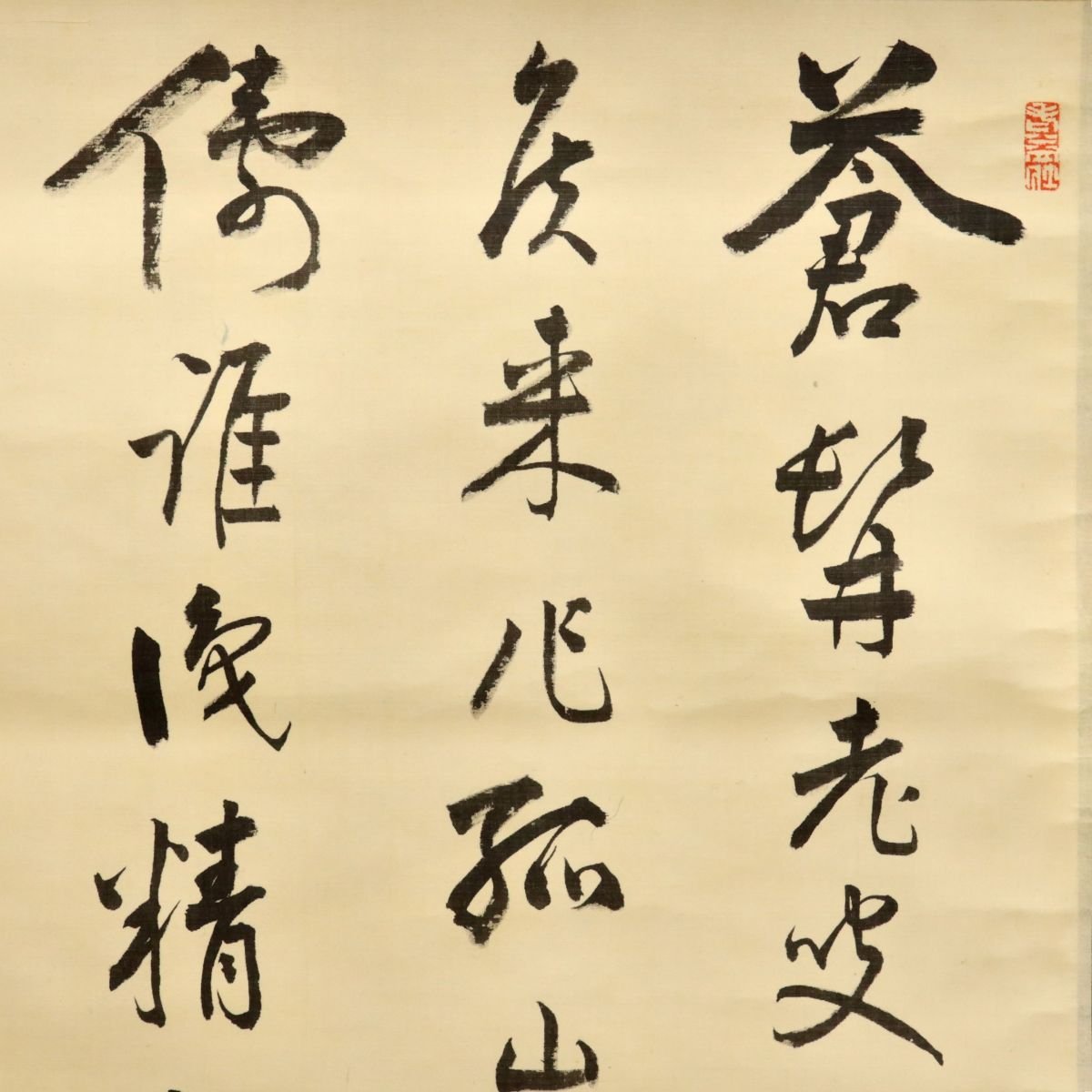 備後・福山市ゆかりの書家五十川訊堂による五行書の絹本掛軸です。箱付で来歴も感じられ、伸びやかで力強い筆致に近代郷土書家の気韻が漂う一幅。地域文化を伝える資料性と鑑賞性を兼ね備えた発見性豊かな備後書画の佳品です。