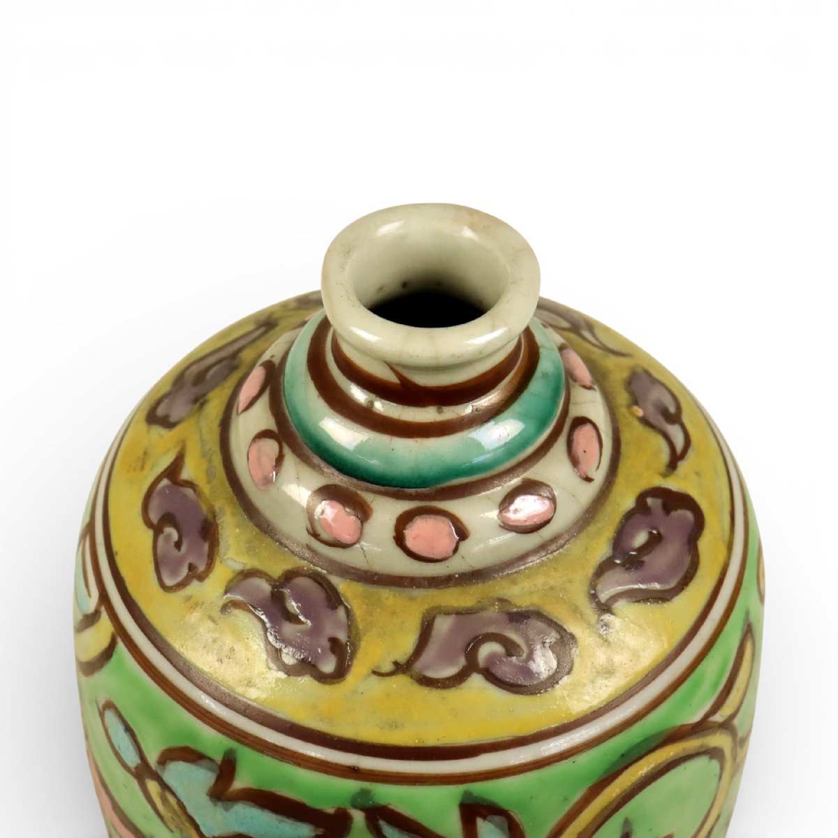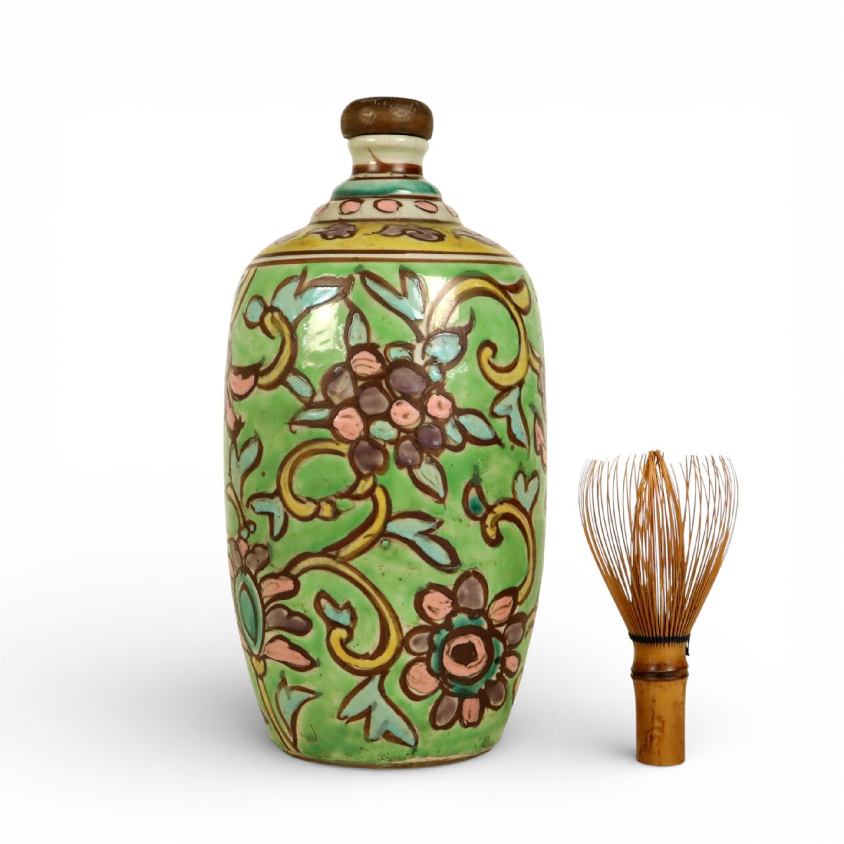 江戸後期に備後・福山市鞆の浦で焼かれた岩谷焼の花唐草文保命酒徳利(鞆徳利)です。素朴な肌合いと伸びやかな花唐草文様に地方窯の味わいが感じられ、鞆の浦名産保命酒文化を今に伝える資料性豊かな備後陶磁の発見性ある佳品です。