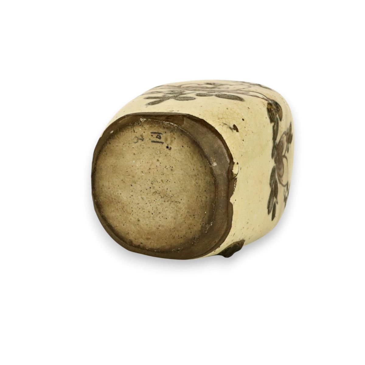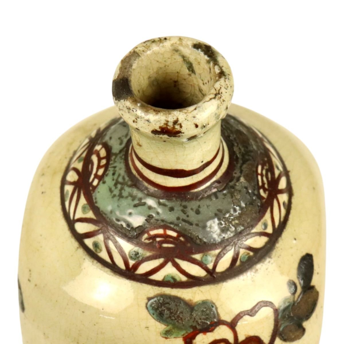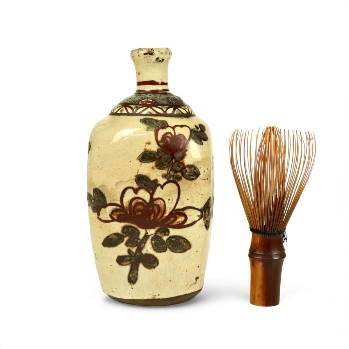 江戸後期頃の岩谷焼による花文保命酒徳利(鞆徳利)です。素朴な土味の中に温雅な花文を配した意匠が印象的で、実用性と装飾性を兼ね備えた味わい深い一品。備後・福山市鞆の浦に伝わる保命酒文化を伝える郷土色豊かな酒器として、資料性にも優れた魅力ある骨董陶磁です。