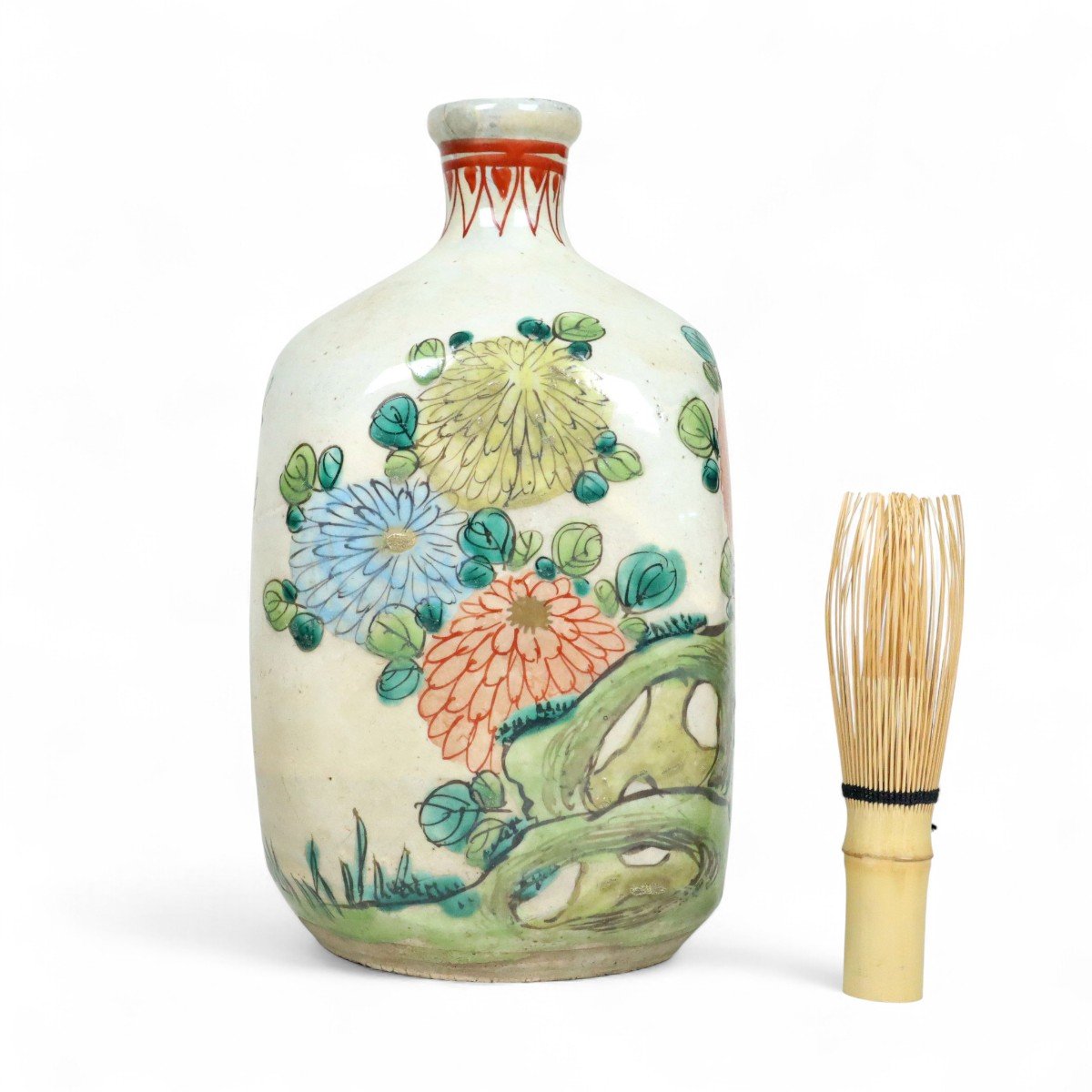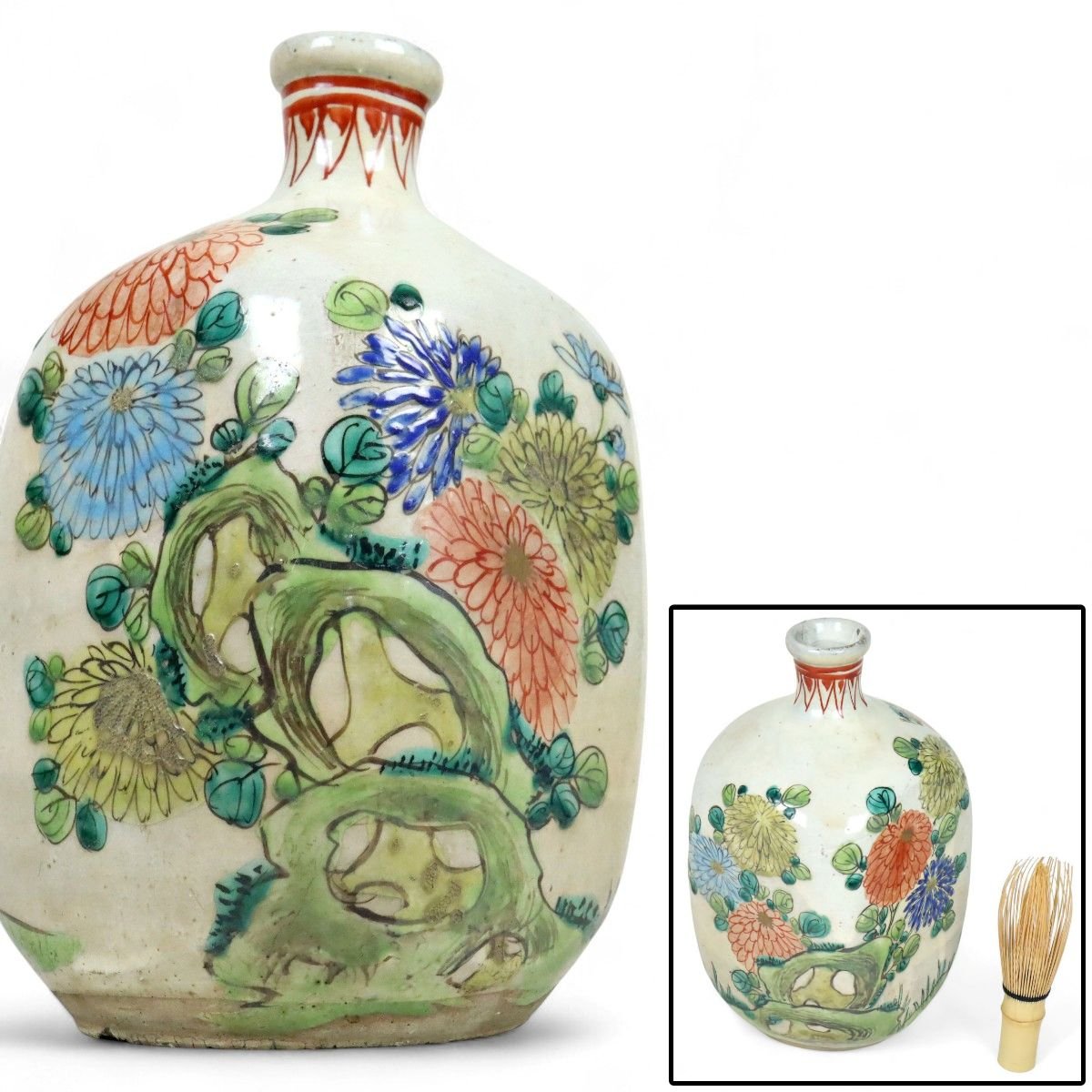 備後・鞆の浦(広島県福山市)に伝わる江戸後期の岩谷焼、花文を施した保命酒徳利(鞆徳利)。素朴な土味に可憐な花意匠が映え、港町の酒文化と用の美を今に伝える陶磁器。骨董酒器コレクションや飾りに適した味わい深い逸品です。