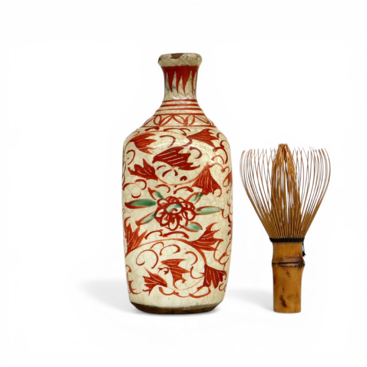 江戸後期、備後国福山市鞆の浦周辺で焼成された岩谷焼の蔦植物文保命酒徳利です。流麗な蔦文様が器面を彩る意匠性豊かな作で、鞆徳利として港町鞆の浦に伝わる保命酒文化を今に伝える資料性と蒐集価値を備えた貴重な酒器です。