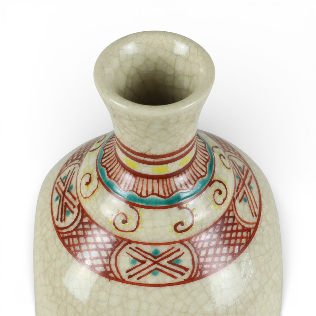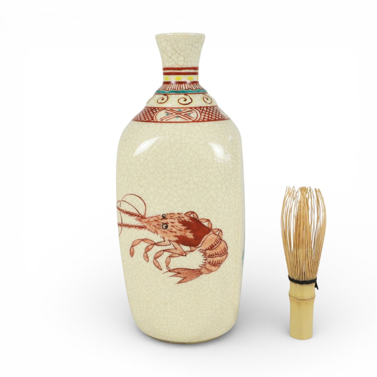 江戸後期、広島県福山市・鞆の浦で焼かれた岩谷焼の海老文保命酒徳利です。備後名産の保命酒を収める鞆徳利で、器面に描かれた躍動感ある海老文が特徴。地方窯の技巧と港町文化を今に伝える趣深い酒器です。