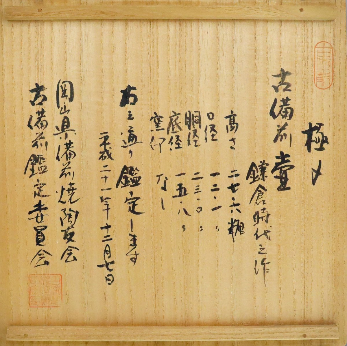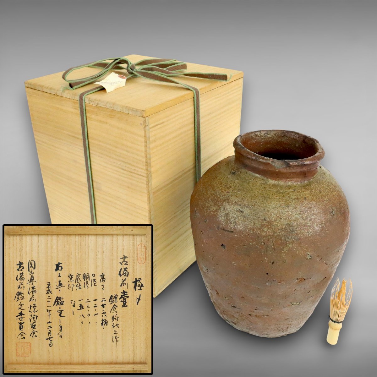 鎌倉期に焼成された古備前の壷は、岡山県備前市周辺の窯による力強い焼締と素朴な造形が時代の風格を伝える古陶です。古備前鑑定委員会の識箱付で伝来も確か、花入としても格調高い華道具として評価される貴重な一品です。