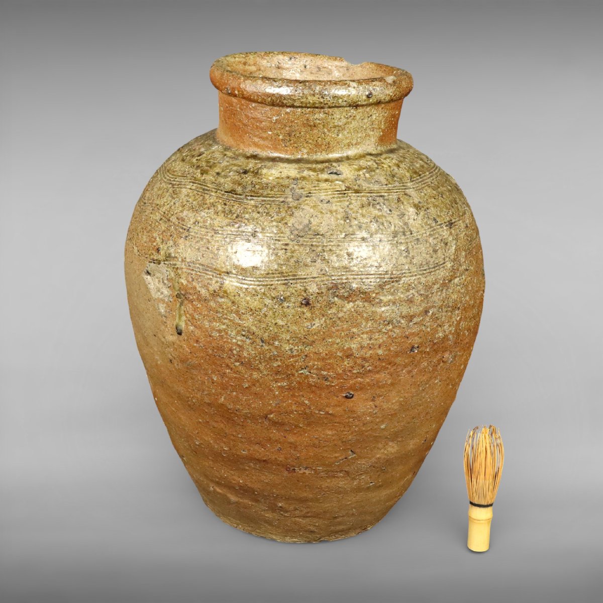 鎌倉期に焼成された古備前の壷は、岡山県備前市周辺の窯による力強い焼締と印象的な三筋紋が見どころの古陶です。素朴な造形に古格が備わり、花入としても評価の高い華道具として蒐集価値のある一品です。