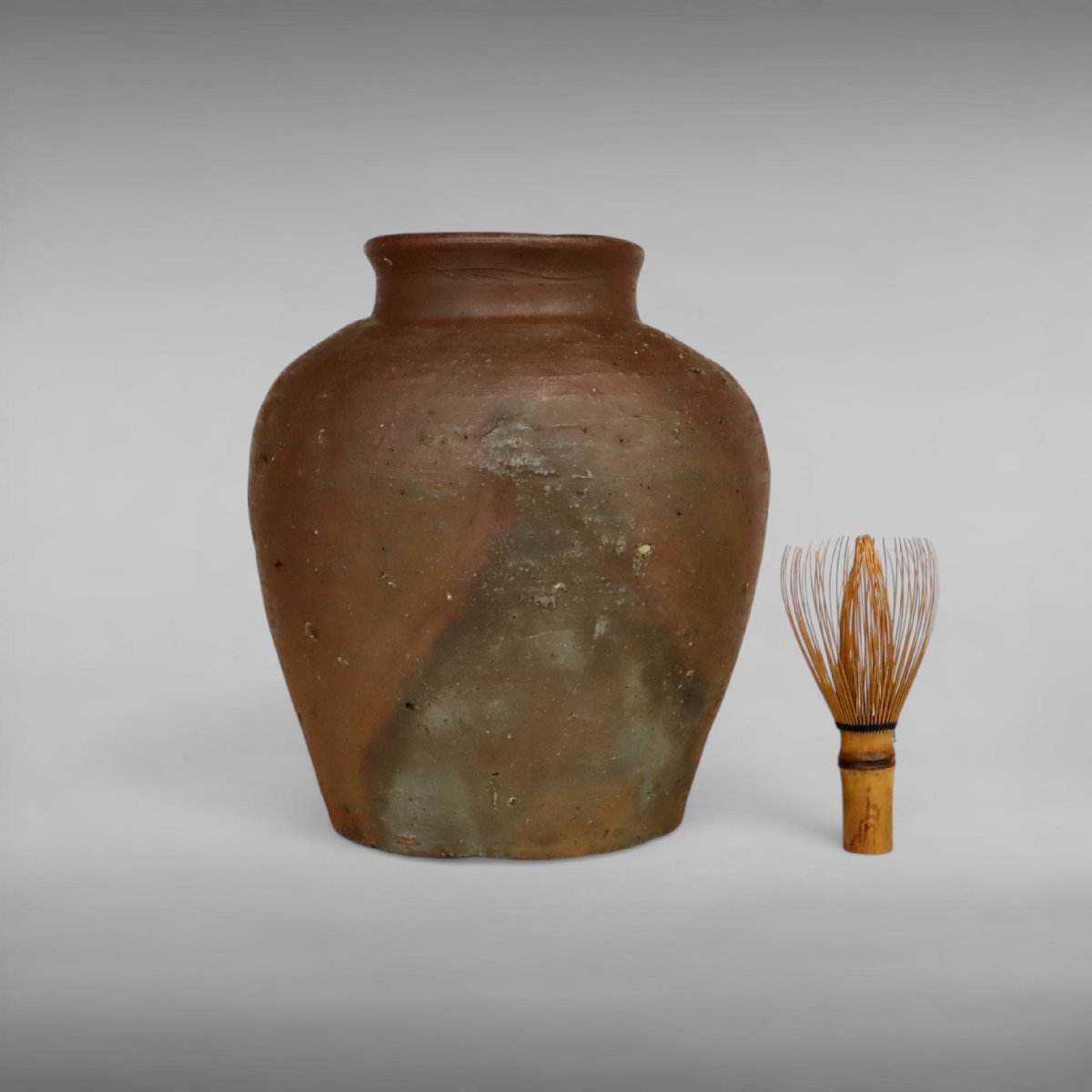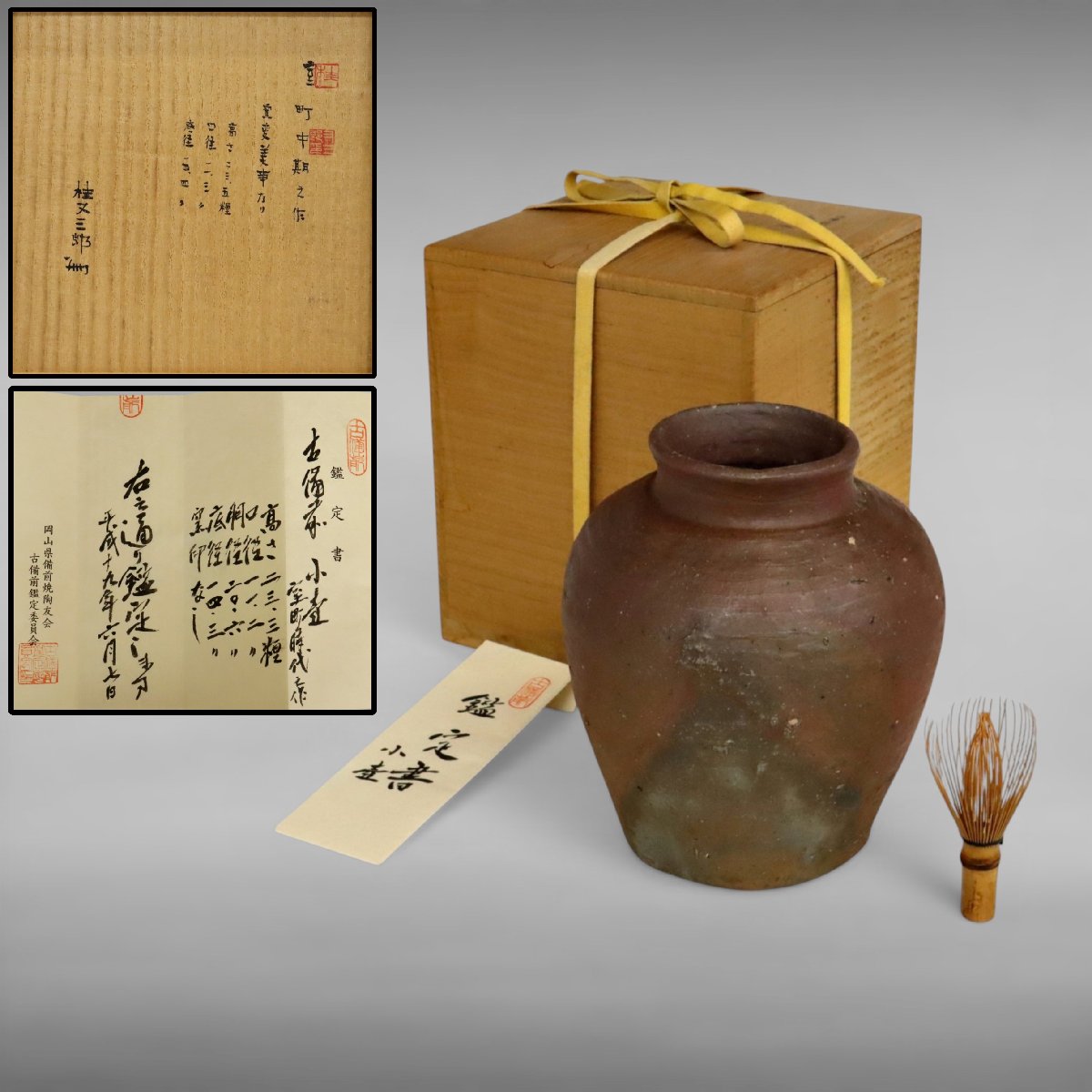 室町中期、岡山県備前の古備前小壷です。素朴ながら緊張感ある器形と自然釉の景色が中世備前の古格を伝える優品で、桂又三郎識箱および古備前鑑定委員会鑑定書付の来歴確かな華道具として資料性・蒐集価値に優れた一作です。